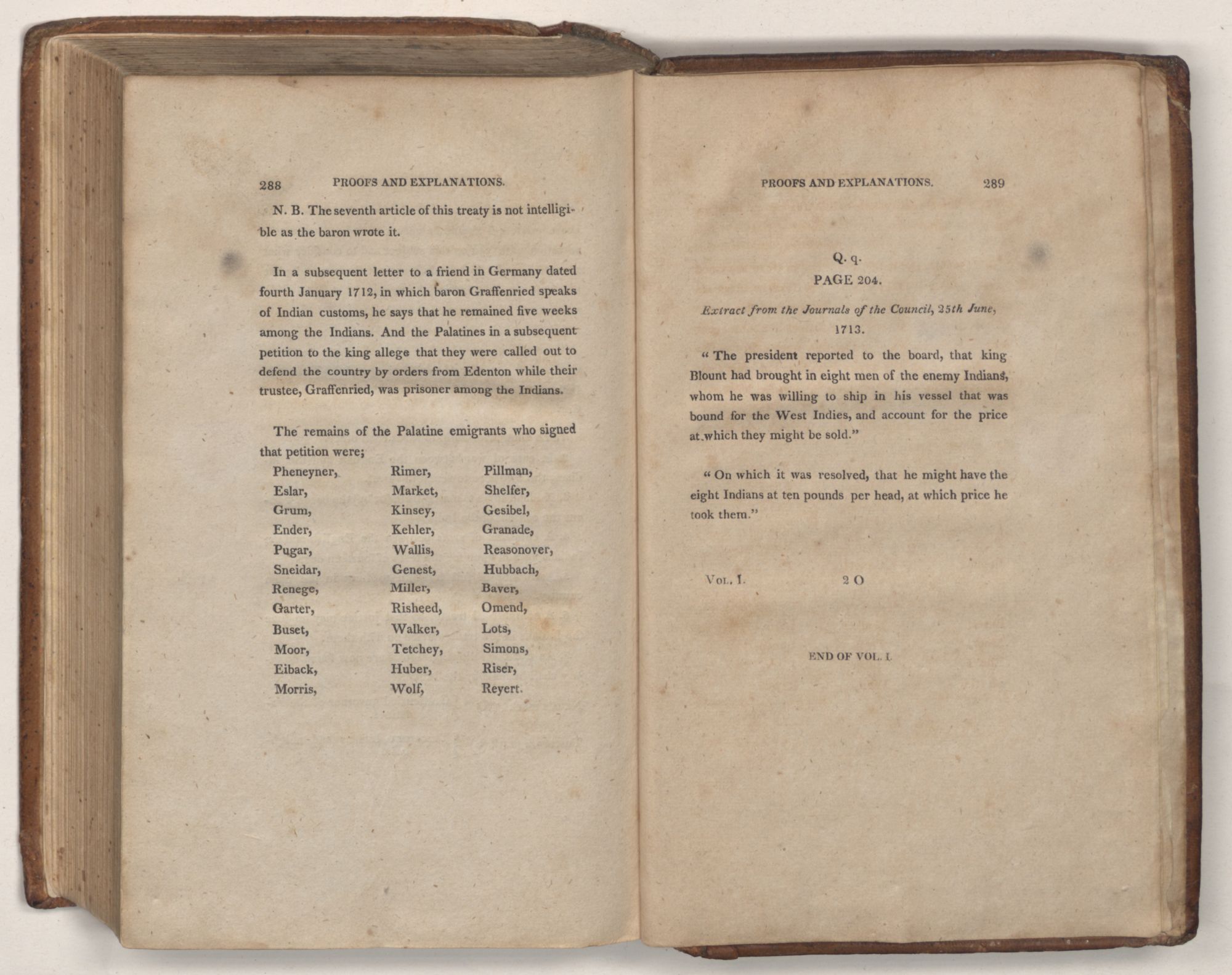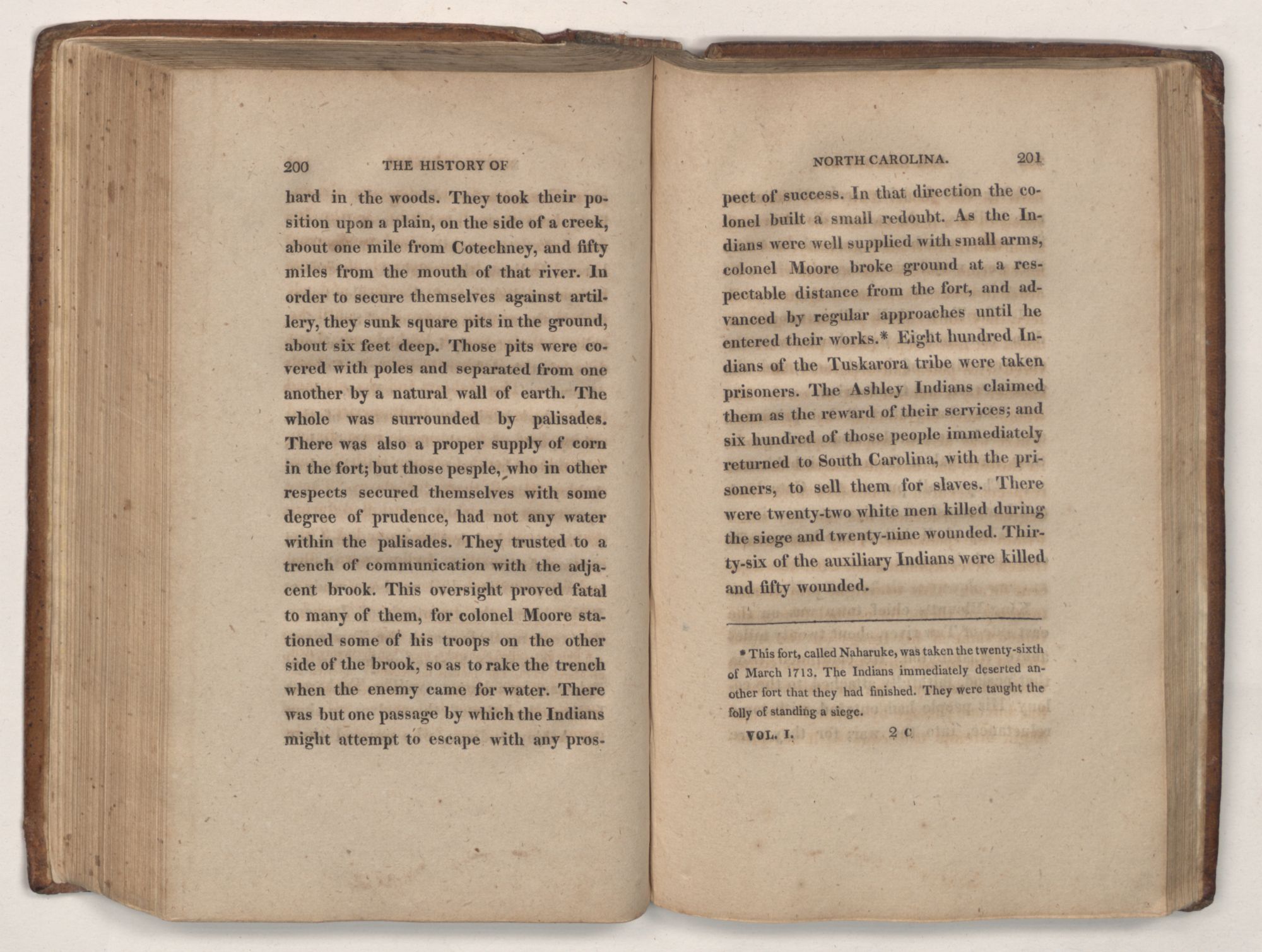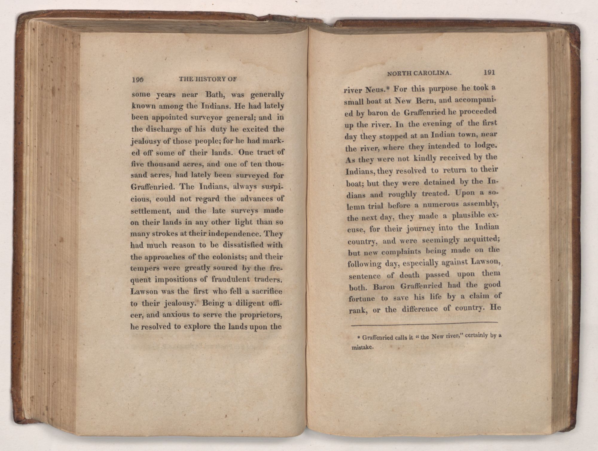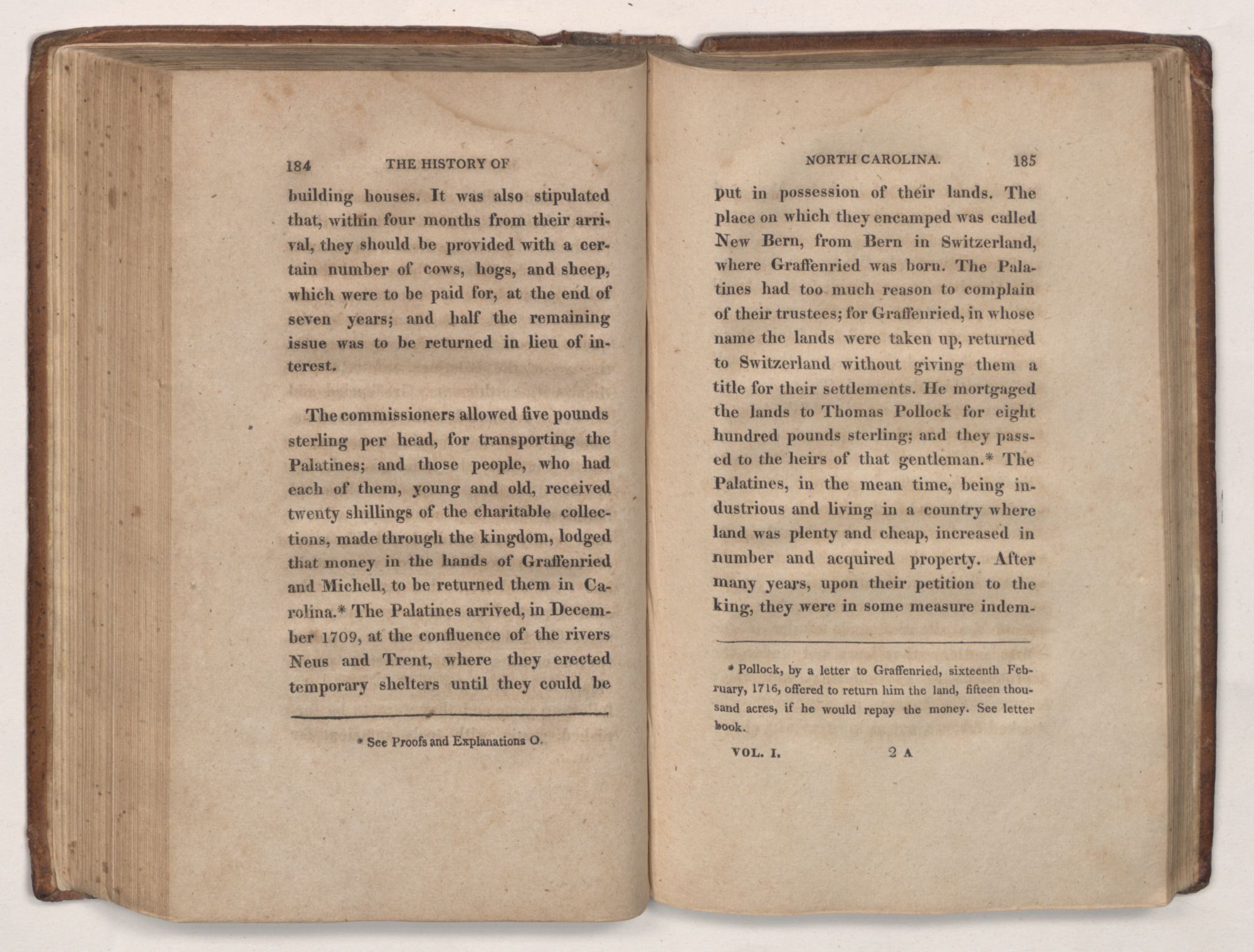 CHAPTER VI.A colony of French huguenots settle on Trent river.—A colony of persecuted and distressed Palatines settle at Newbern.—The Indians have decreased greatly, since the arrival of the first colonists.—As the settlements extend, the Indians become more jealous.—The Indians seize Lawson the surveyor general, and Graffenried.—They put Lawson to death.—The Indians attempt a general massacre, and destroy many of the Inhabitants.—An Indian war becomes general.—Some Indians are killed; and a shameful peace is made by the commanding officer.—Pollock, as president of the council, administers the government.—The Indians renew the war.—Another army marches against them.—Eight hundred Indians are made prisoners; and the Indians sue for peace.—The colony is greatly reduced by Cary's rebellion, and the Indian war, 178