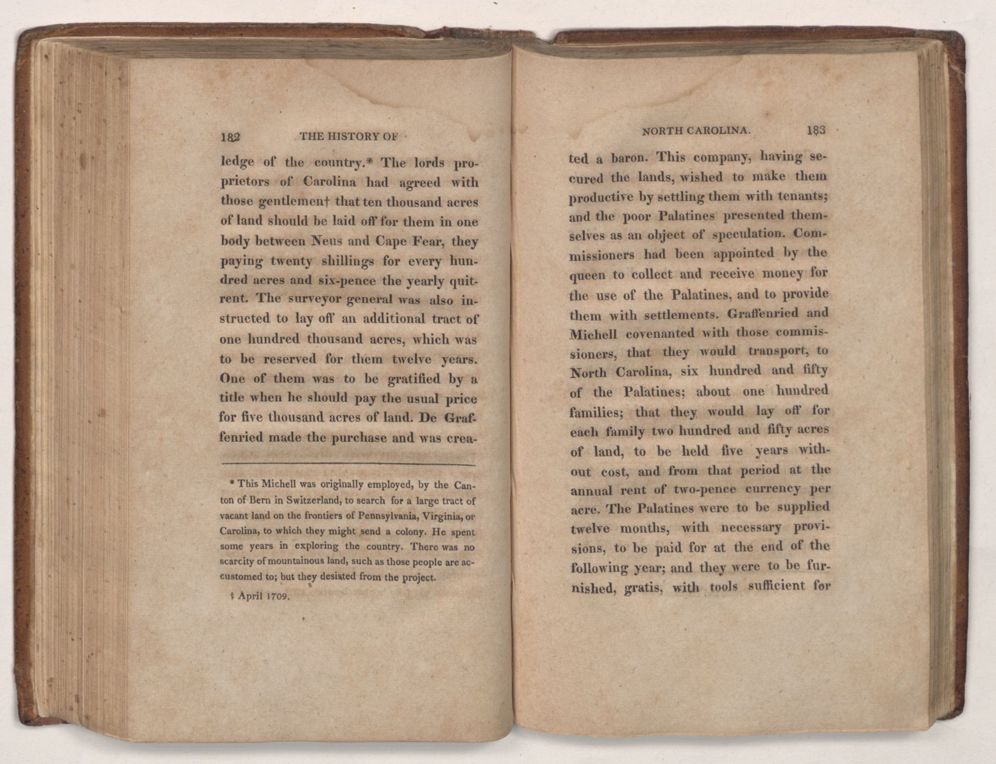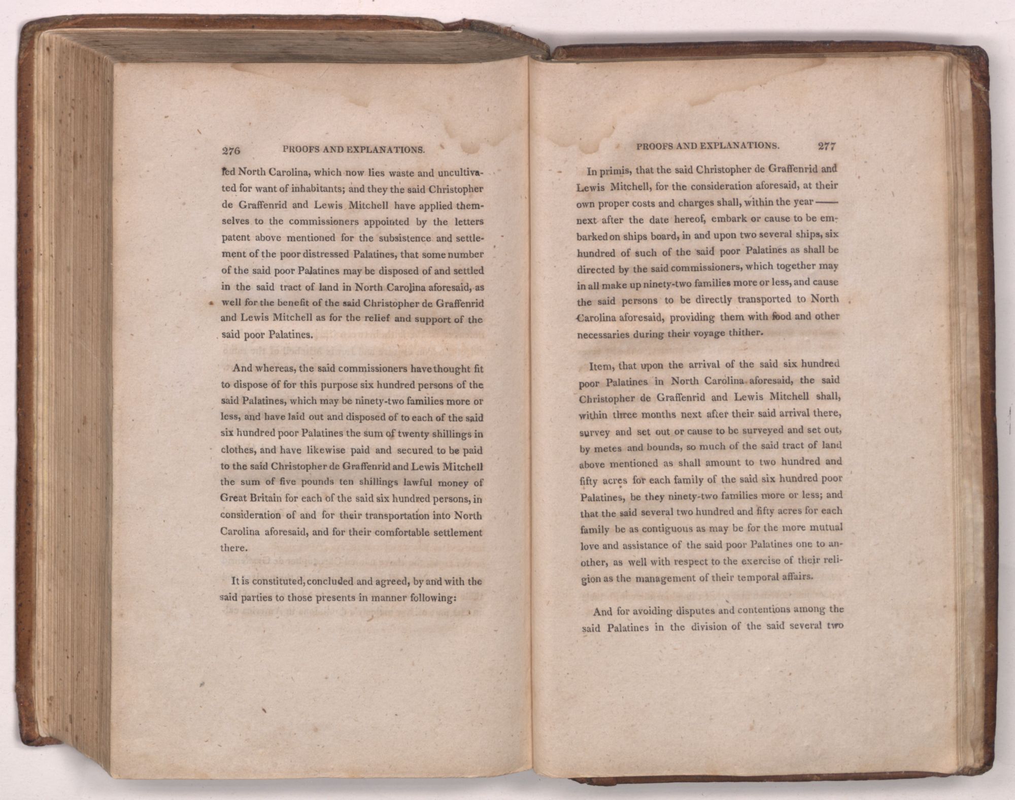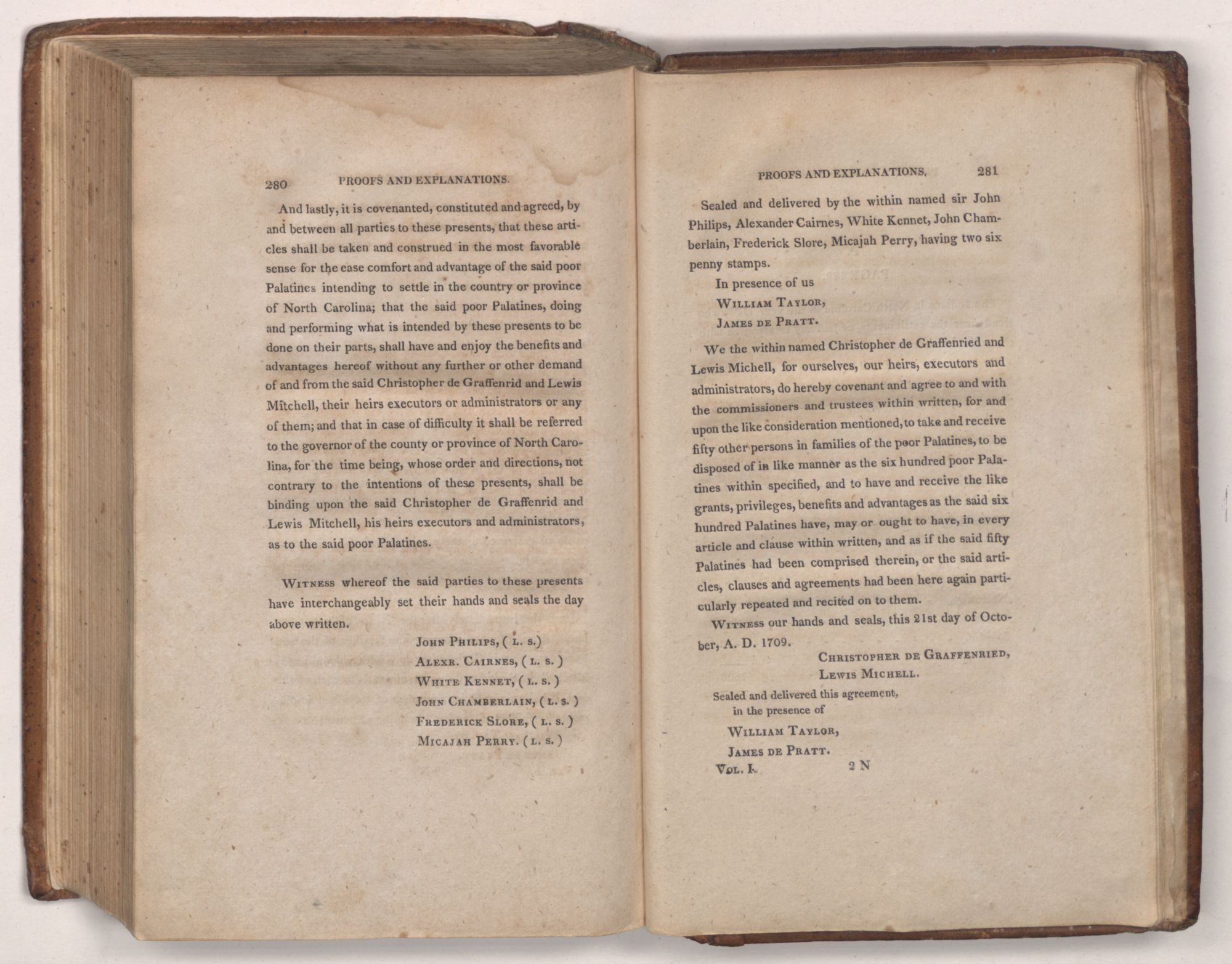 North Carolina, which now lies waste and uncultivated for want of inhabitants; and they the said Christopher de Graffenrid and Lewis Mitchell have applied themselves to the commissioners appointed by the letters patent above mentioned for the subsistence and settlement of the poor distressed Palatines, that some number of the said poor Palatines may be disposed of and settled in the said tract of land in North Carolina aforesaid, as well for the benefit of the said Christopher de Graffenrid and Lewis Mitchell as for the relief and support of the said poor Palatines.