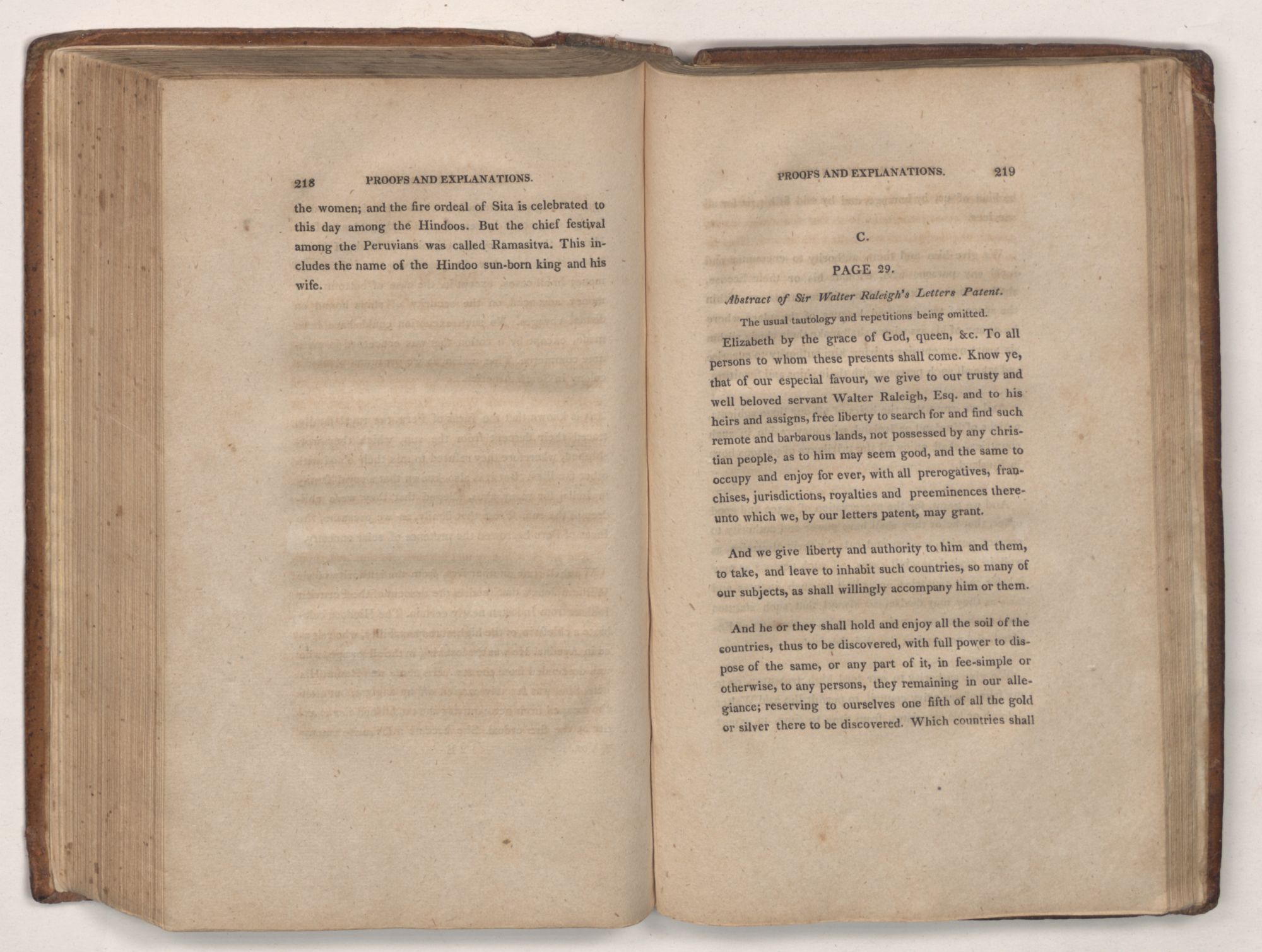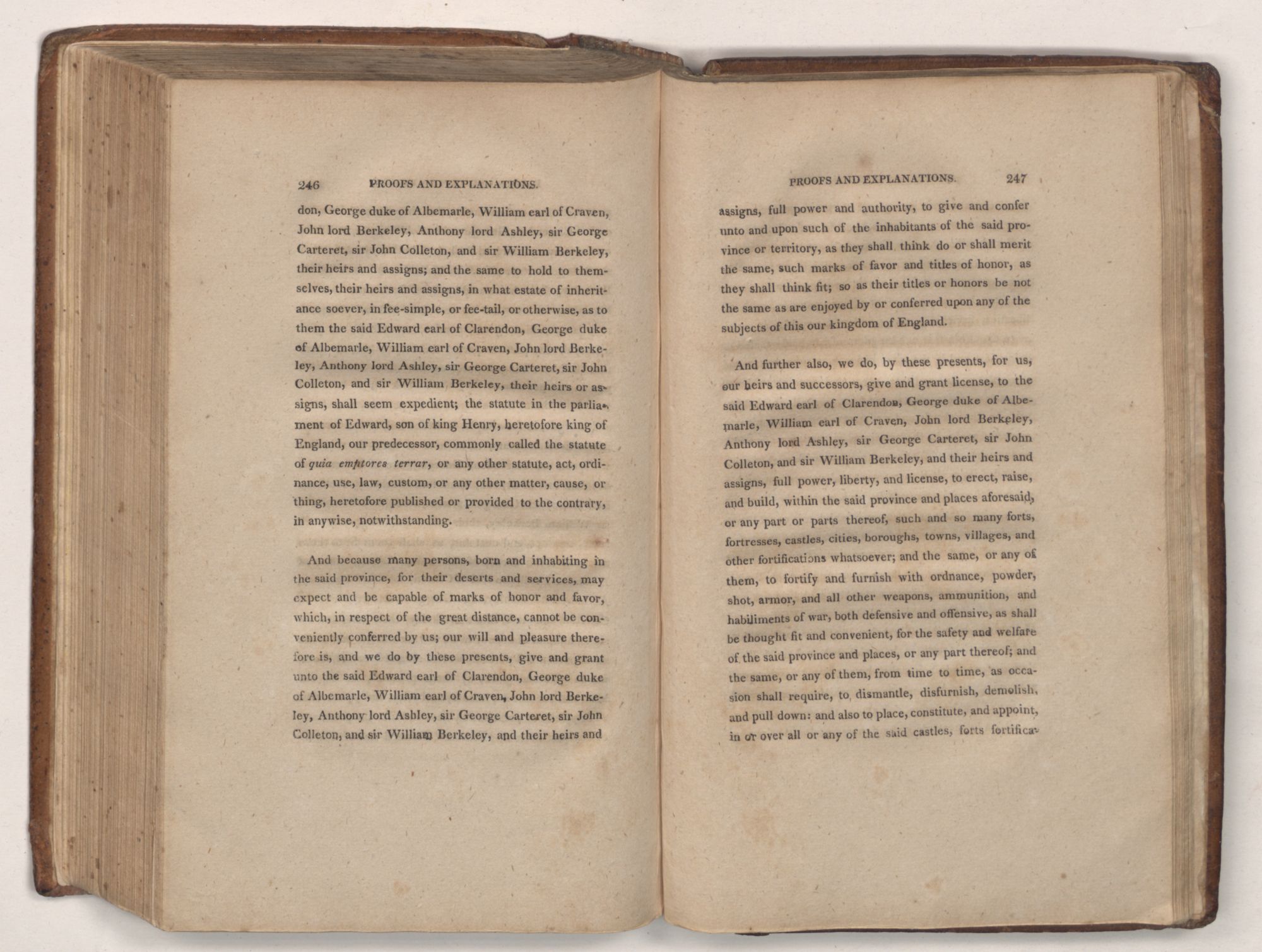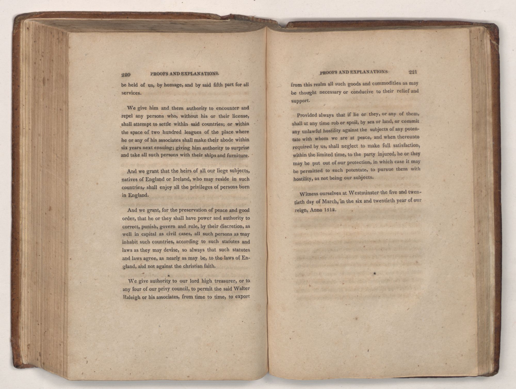 waters first explored by Sir Walter Raleigh, and among the natives. When a colony had sprung up in this manner, a charter was obtained, by sundry lords and gentlemen, for a large tract of country, including the soil and seigniory. The province was then called by its present name.