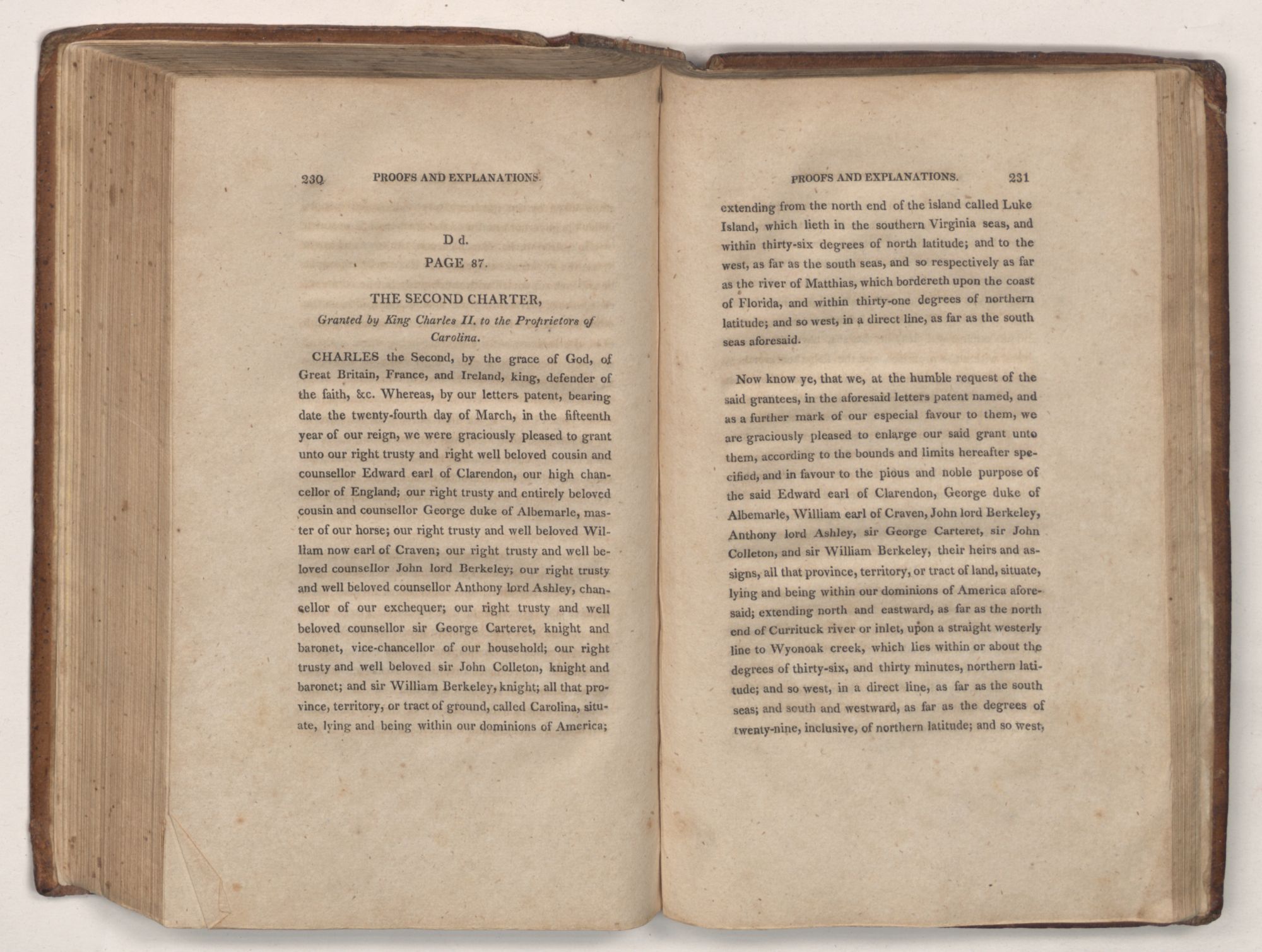 CHAPTER IV.A charter is granted by Charles the Second, to eight lords and gentlemen, for part of the country that had been called Virginia.—The new province is called Carolina.—A government is formed for the settlers near Albemarle sound.—Another government is formed for settlers on Clarendon river, near Cape Fear.—Drummond is appointed governor of Albemarle county.—People are encouraged to settle by liberal promises.—The first settlers on Clarendon river are driven off by the Indians.—They are replaced by a colony from Barbadoes, of whom sir John Yeamans is made the governor.—The tenure of land in Albemarle is improved by a new charter.—A colony settles at Port Royal.—A new and impracticable form of government is projected