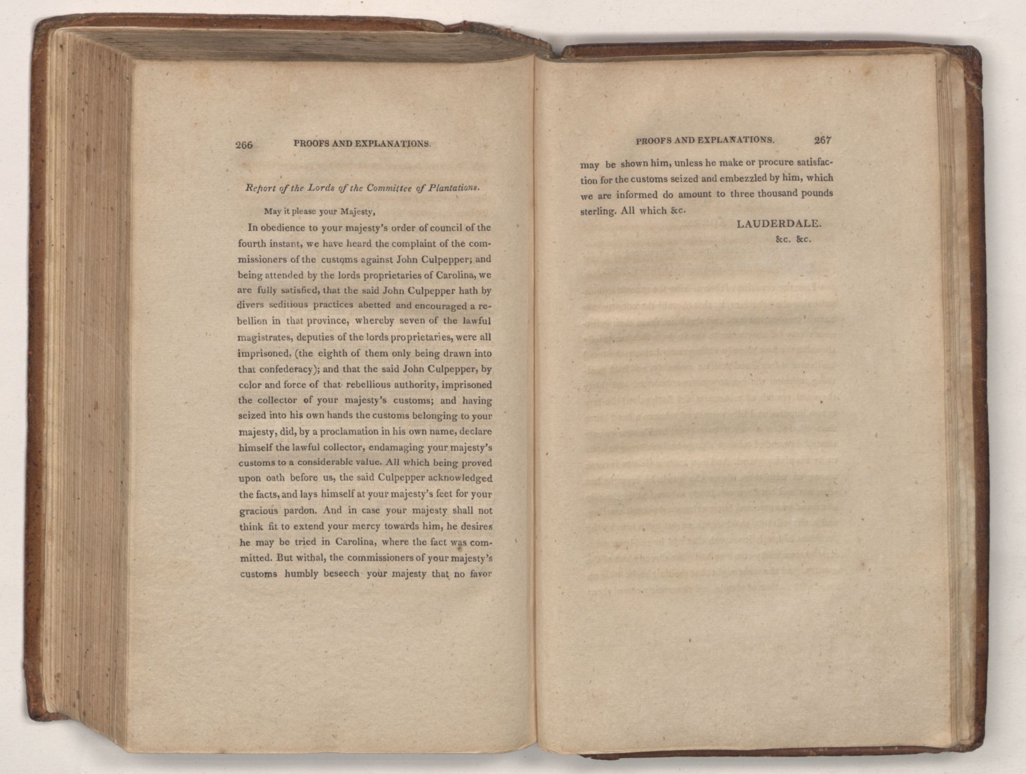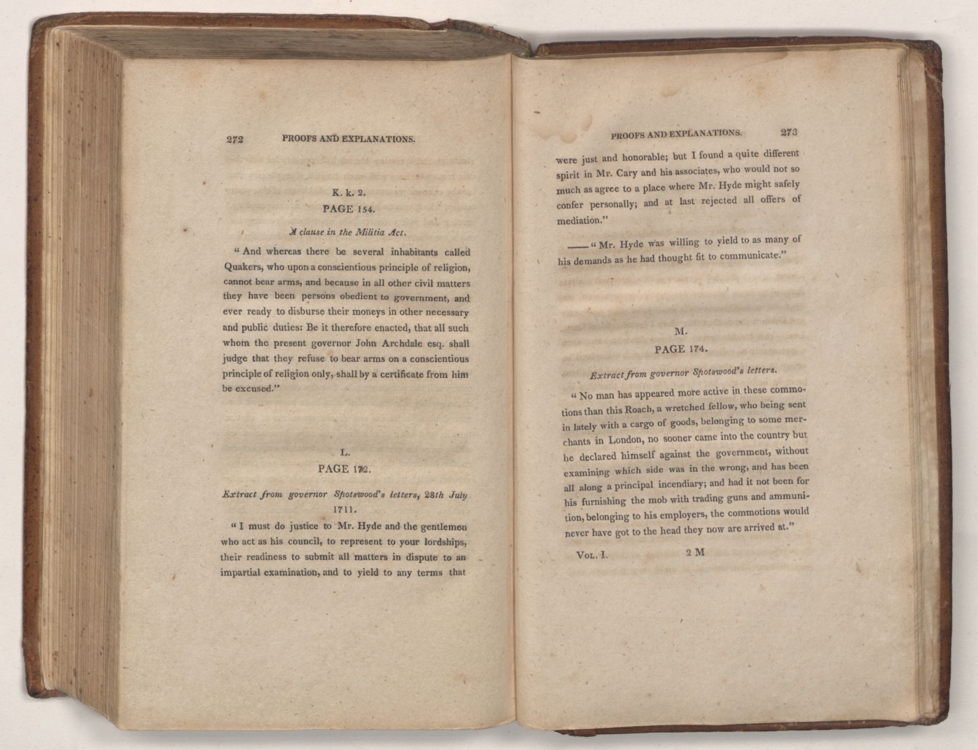 Of the debates that have arisen between the several governors and the legislative assemblies, and the disputes between the proprietary agents and the people, I was furnished with copious details. If I had been disposed to record disputes that originated in pride, resentment, the spirit of party, avarice or a dishonest temper, I might have swelled this work to a considerable bulk. Such details of follies and vices cannot be interesting. Some papers however, will be found among the Proofs and Explanations, that had no claim to being copied, except that