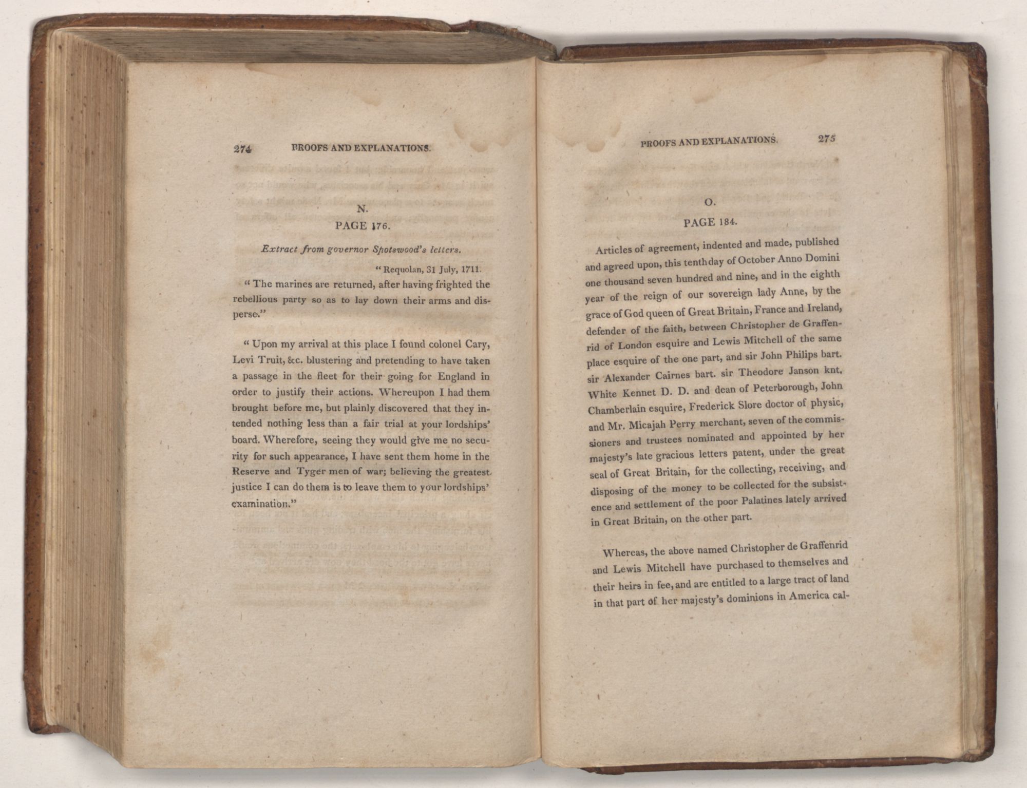 Articles of agreement, indented and made, published and agreed upon, this tenthday of October Anno Domini one thousand seven hundred and nine, and in the eighth year of the reign of our sovereign lady Anne, by the grace of God queen of Great Britain, France and Ireland, defender of the faith, between Christopher de Graffenrid of London esquire and Lewis Mitchell of the same place esquire of the one part, and sir John Philips bart. sir Alexander Cairnes bart. sir Theodore Janson knt. White Kennet D. D. and dean of Peterborough, John Chamberlain esquire, Frederick Slore doctor of physic, and Mr. Micajah Perry merchant, seven of the commissioners and trustees nominated and appointed by her majesty's late gracious letters patent, under the great seal of Great Britain, for the collecting, receiving, and disposing of the money to be collected for the subsistence and settlement of the poor Palatines lately arrived in Great Britain, on the other part.