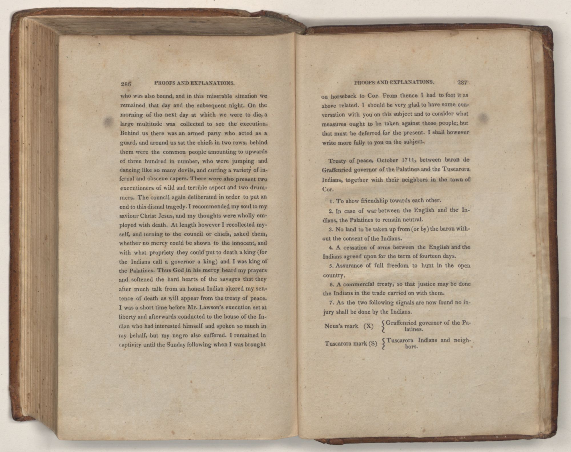 who was also bound, and in this miserable situation we remained that day and the subsequent night. On the morning of the next day at which we were to die, a large multitude was collected to see the execution. Behind us there was an armed party who acted as a guard, and around us sat the chiefs in two rows; behind them were the common people amounting to upwards of three hundred in number, who were jumping and dancing like so many devils, and cutting a variety of infernal and obscene capers. There were also present two executioners of wild and terrible aspect and two drummers. The council again deliberated in order to put an end to this dismal tragedy. I recommended my soul to my saviour Christ Jesus, and my thoughts were wholly employed with death. At length however I recollected myself, and turning to the council or chiefs, asked them, whether no mercy could be shown to the innocent, and with what propriety they could put to death a king (for the Indians call a governor a king) and I was king of the Palatines. Thus God in his mercy heard my prayers and softened the hard hearts of the savages that they after much talk from an honest Indian altered my sentence of death as will appear from the treaty of peace. I was a short time before Mr. Lawson's execution set at liberty and afterwards conducted to the house of the Indian who had interested himself and spoken so much in my behalf, but my negro also suffered. I remained in captivity until the Sunday following when I was brought