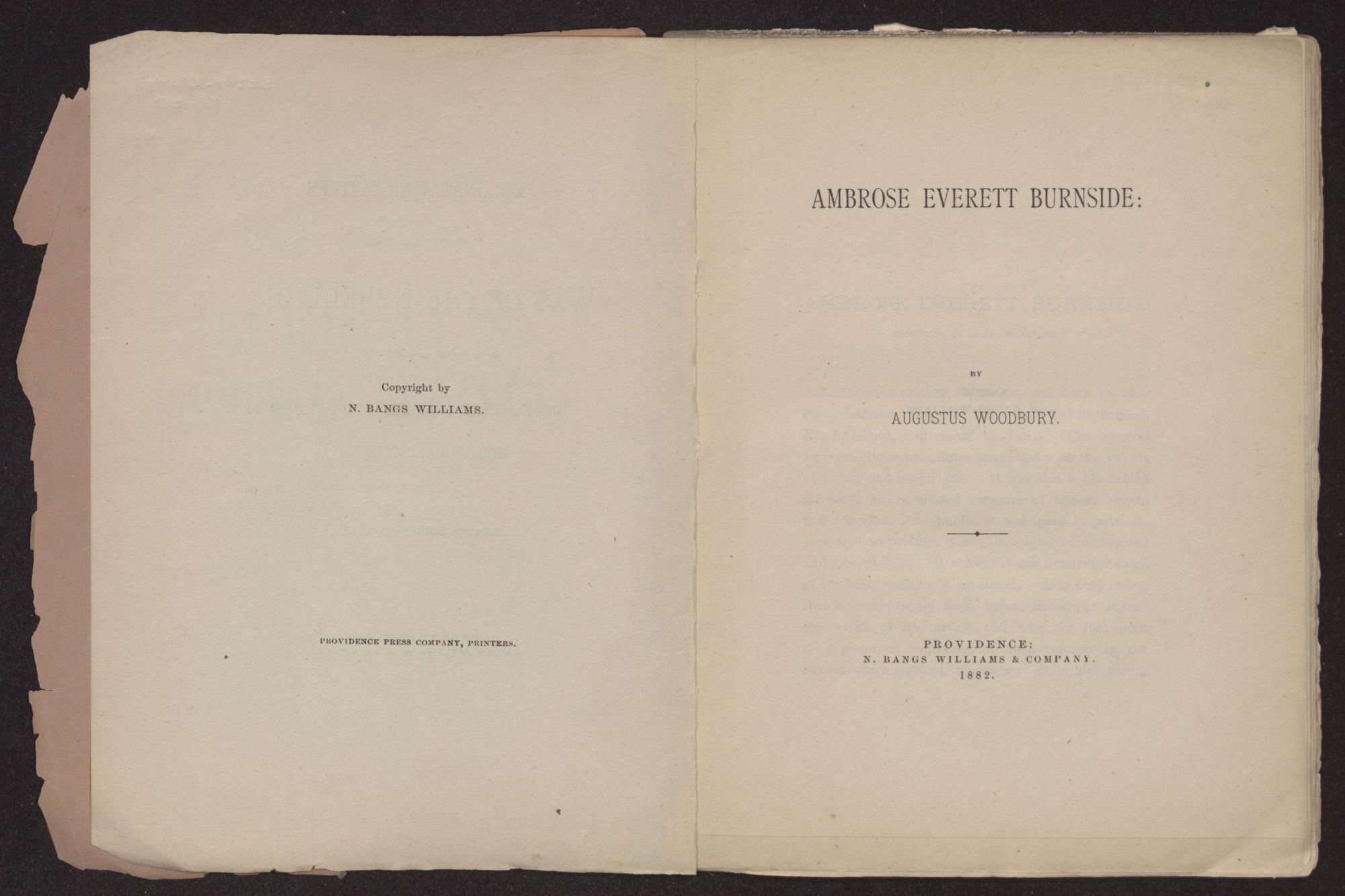 AMBROSE EVERETT BURNSIDE:BYAUGUSTUS WOODBURY.PROVIDENCE:N. BANGS WILLIAMS & COMPANY.1882.Copyright by N. BANGS WILLIAMS. 1882.