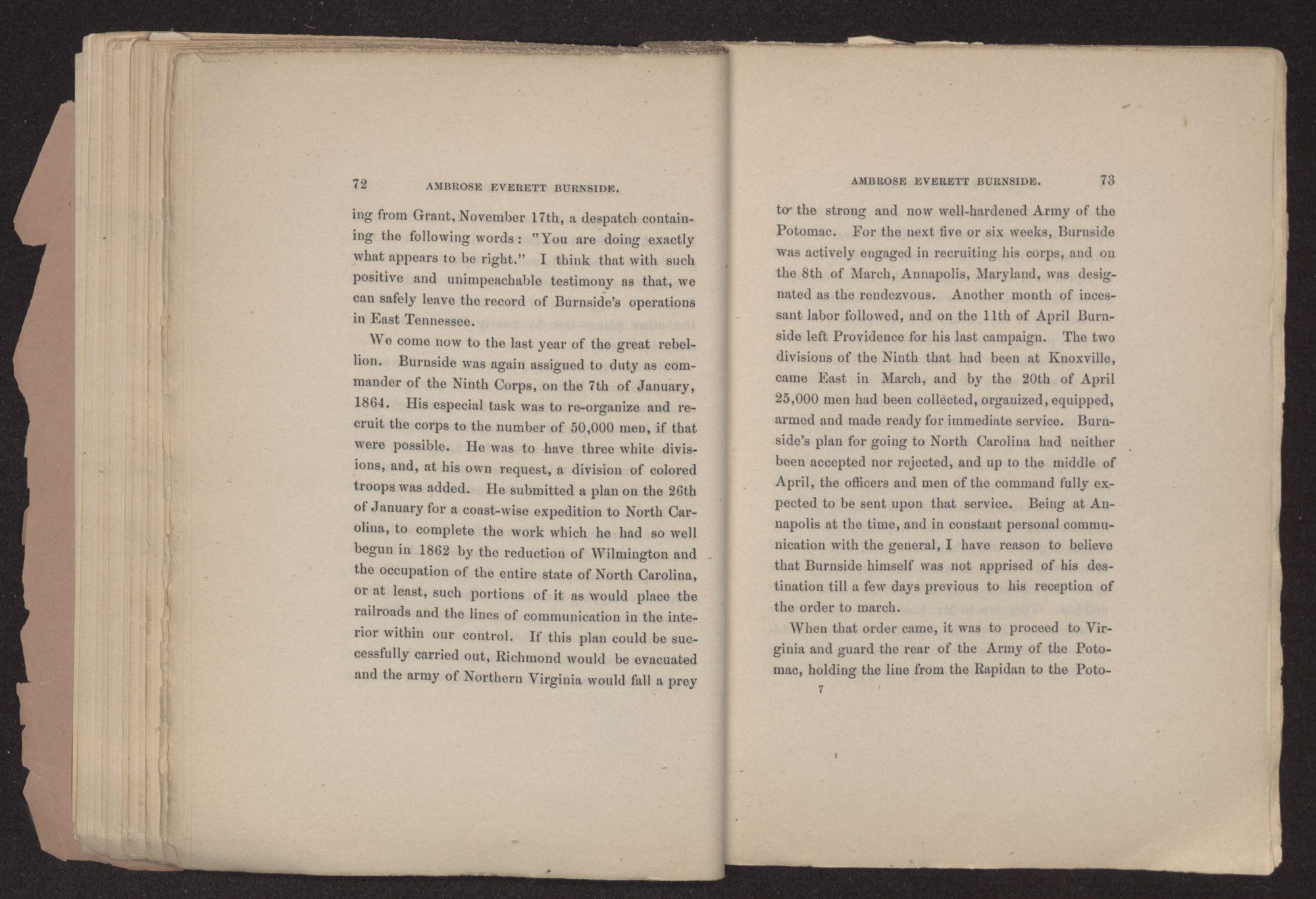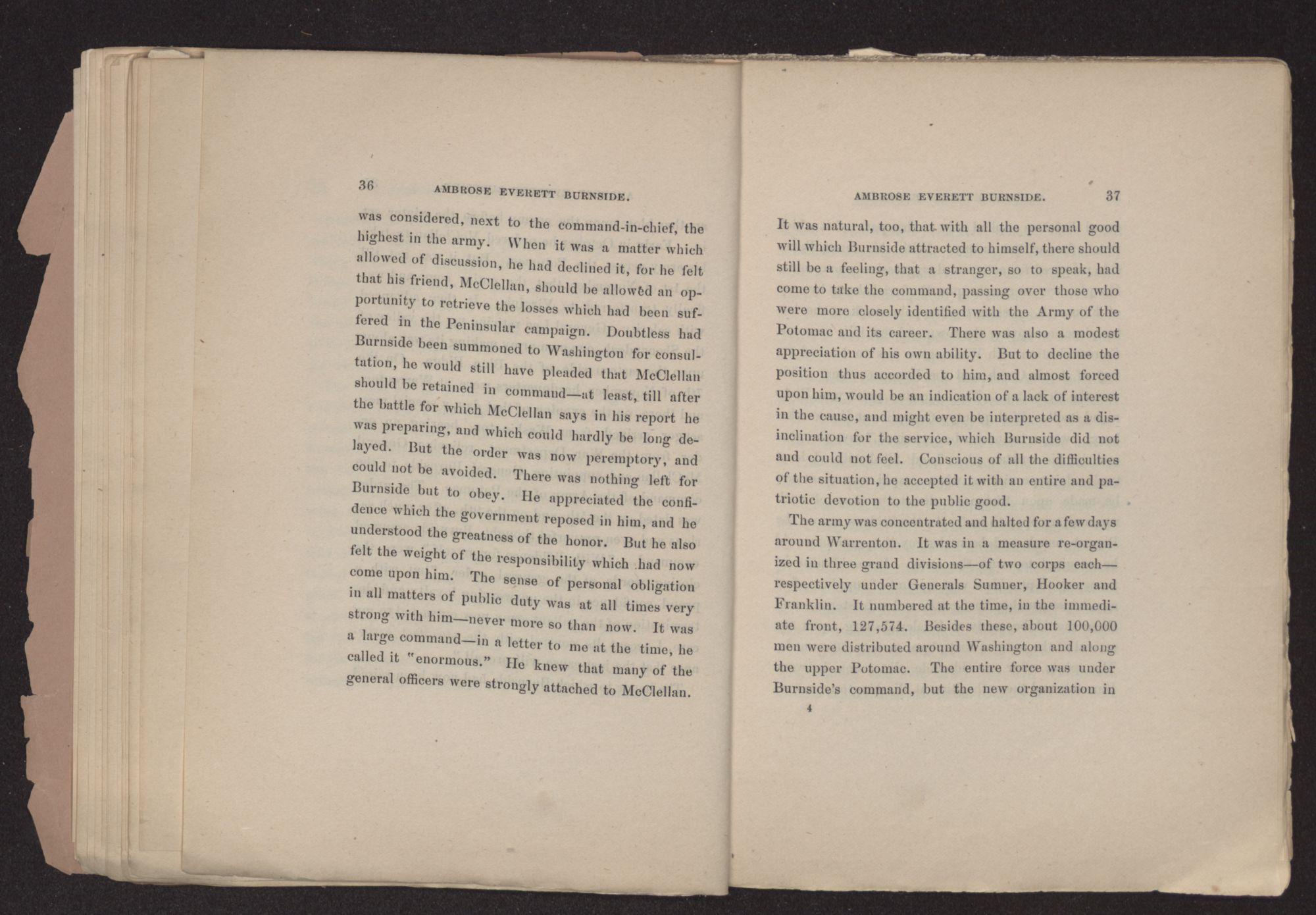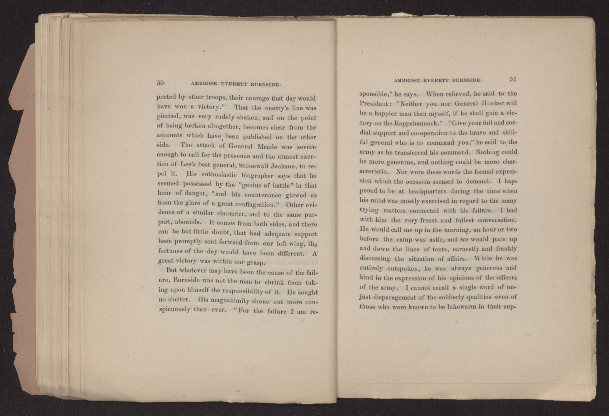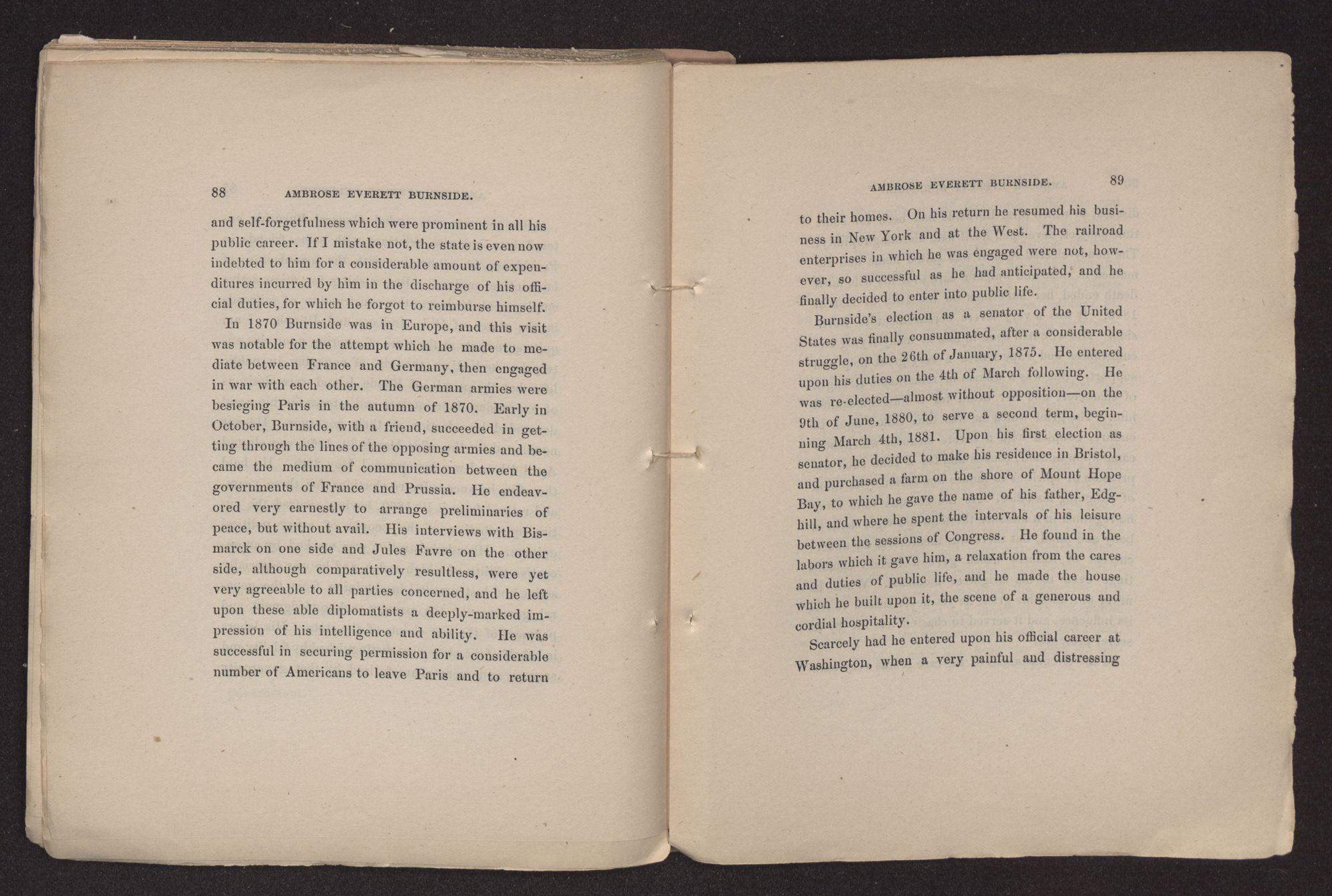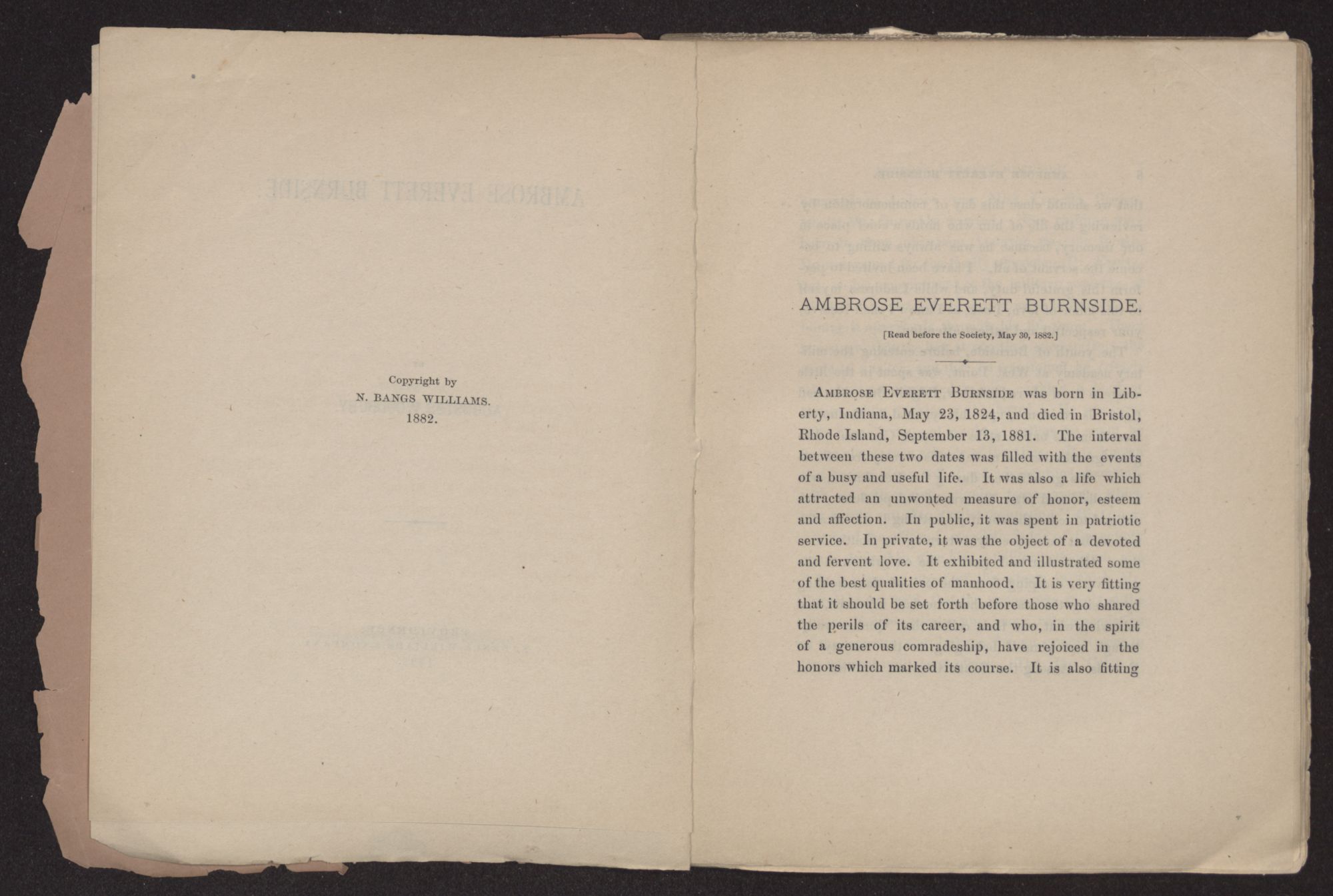 Ambrose Everett Burnside was born in Liberty, Indiana, May 23, 1824, and died in Bristol, Rhode Island, September 13, 1881. The interval between these two dates was filled with the events of a busy and useful life. It was also a life which attracted an unwonted measure of honor, esteem and affection. In public, it was spent in patriotic service. In private, it was the object of a devoted and fervent love. It exhibited and illustrated some of the best qualities of manhood. It is very fitting that it should be set forth before those who shared the perils of its career, and who, in the spirit of a generous comradeship, have rejoiced in the honors which marked its course. It is also fitting
