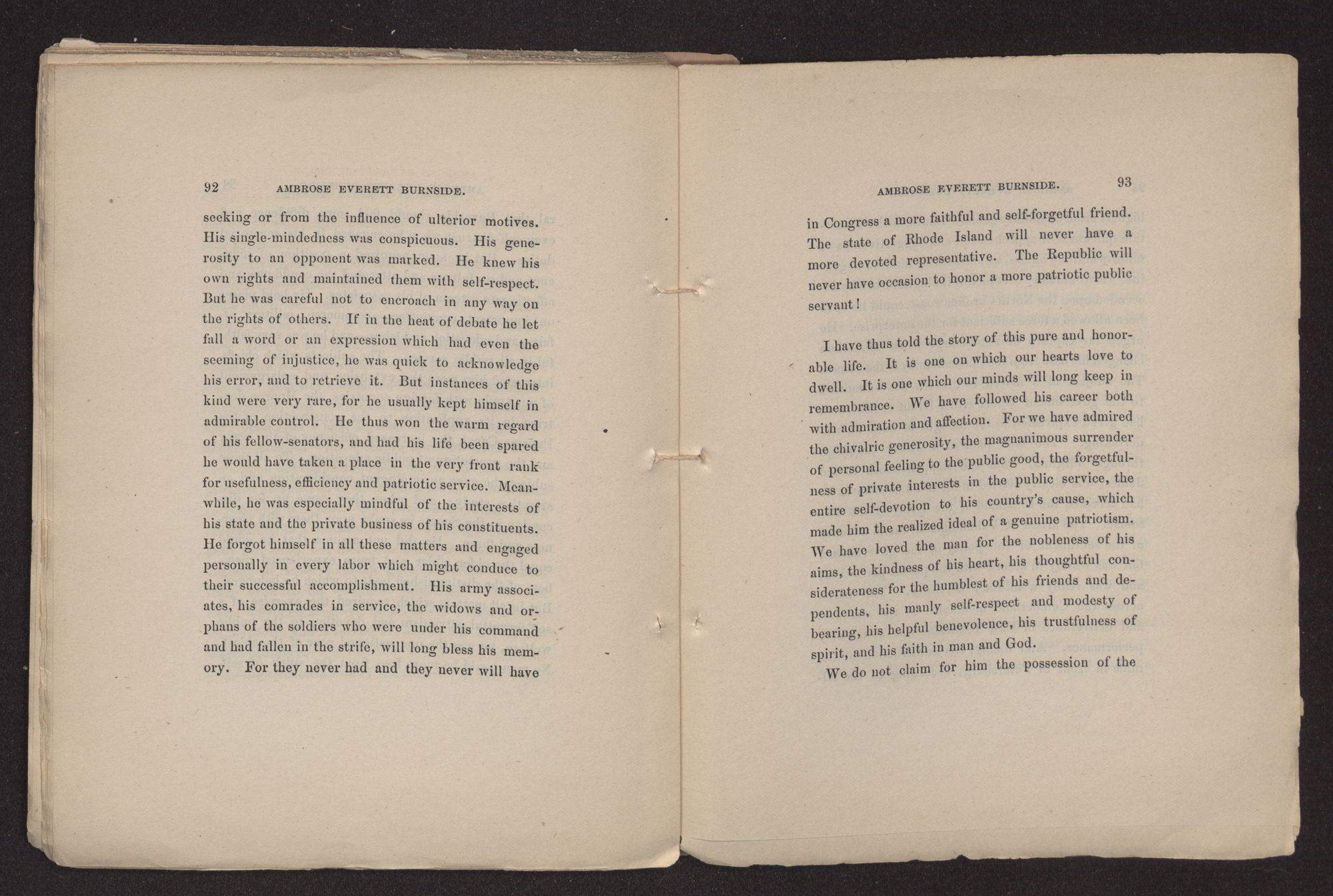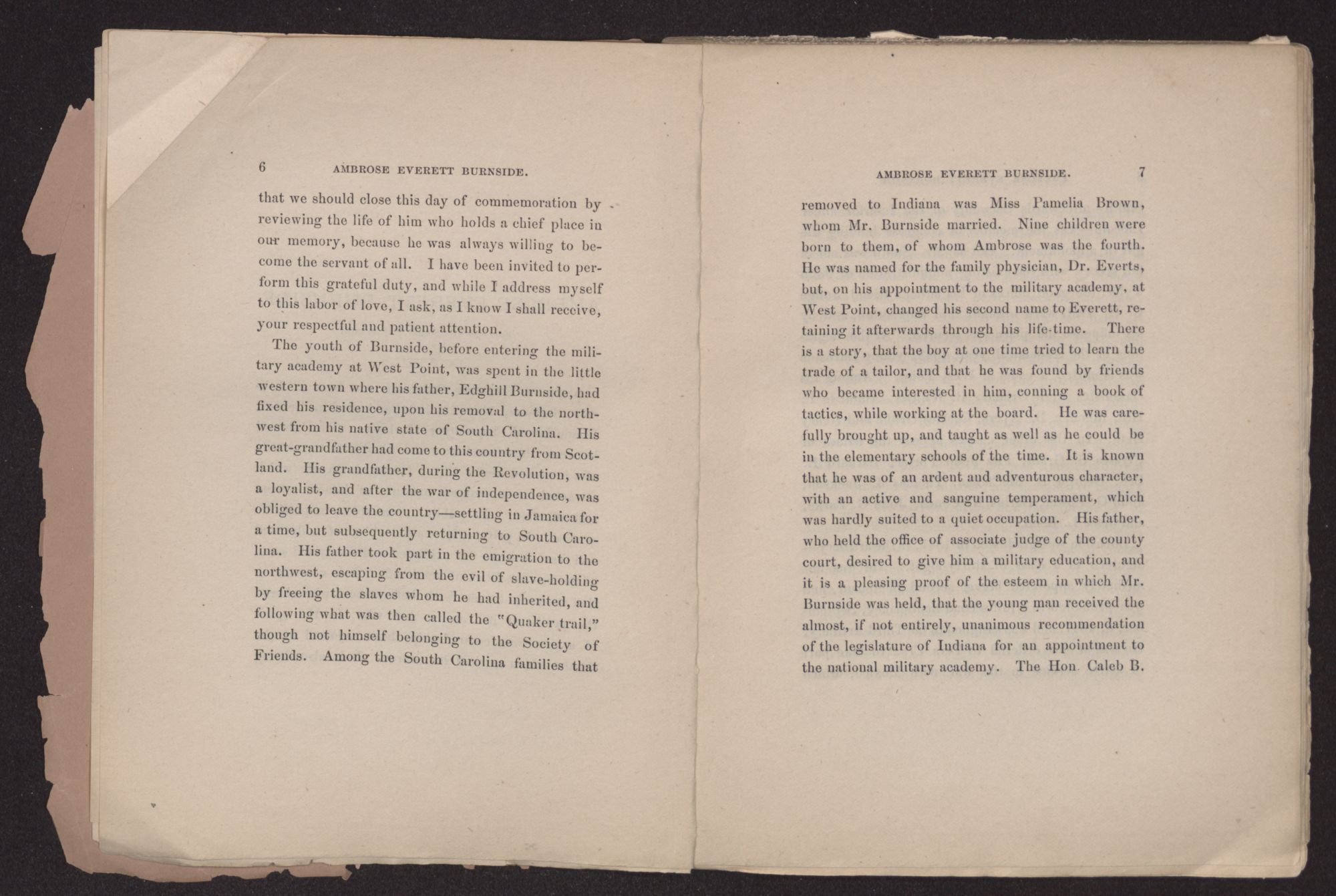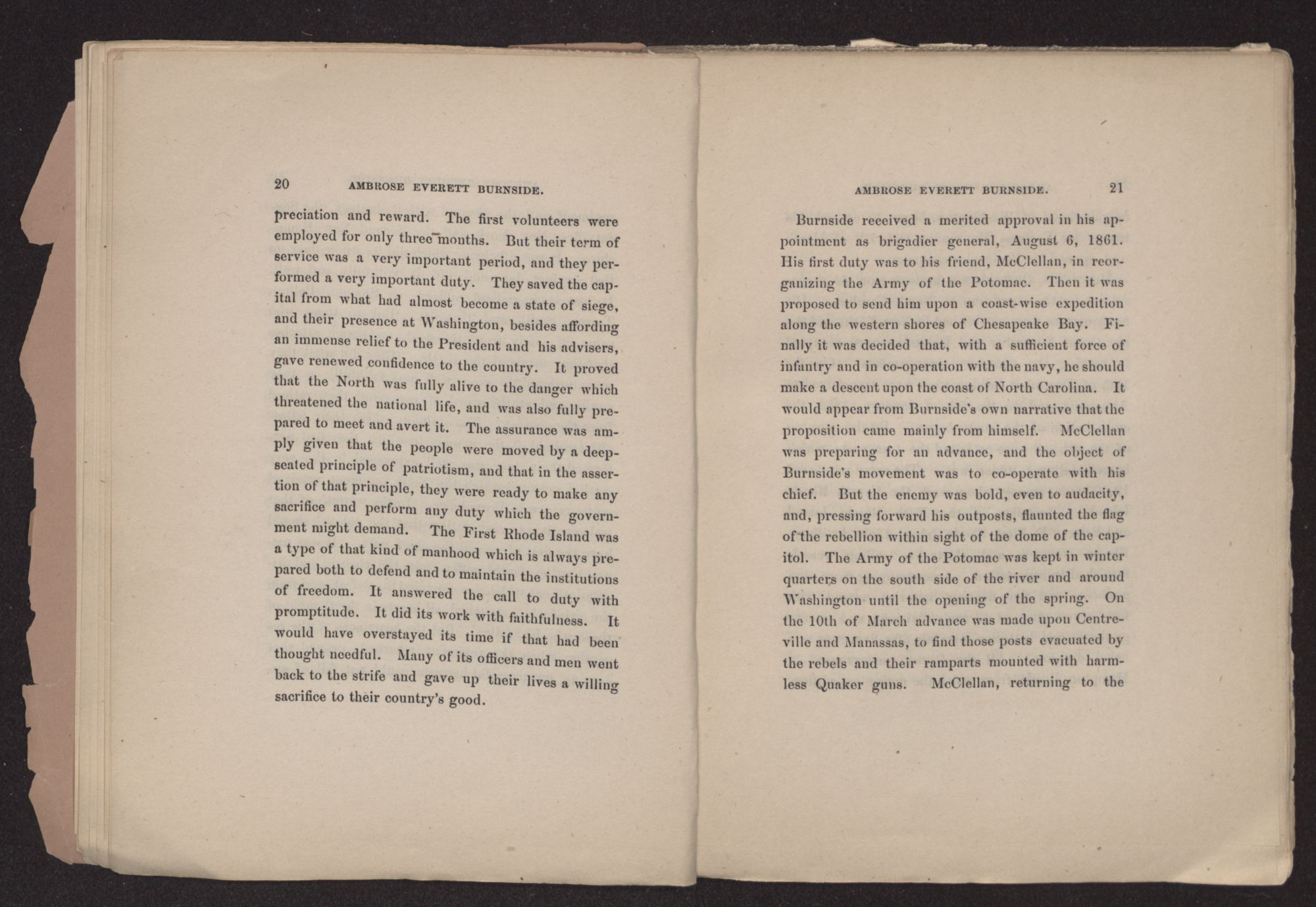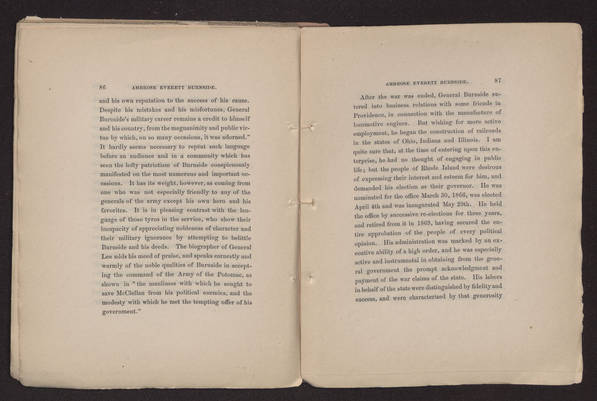 Ambrose Everett Burnside was born in Liberty, Indiana, May 23, 1824, and died in Bristol, Rhode Island, September 13, 1881. The interval between these two dates was filled with the events of a busy and useful life. It was also a life which attracted an unwonted measure of honor, esteem and affection. In public, it was spent in patriotic service. In private, it was the object of a devoted and fervent love. It exhibited and illustrated some of the best qualities of manhood. It is very fitting that it should be set forth before those who shared the perils of its career, and who, in the spirit of a generous comradeship, have rejoiced in the honors which marked its course. It is also fitting