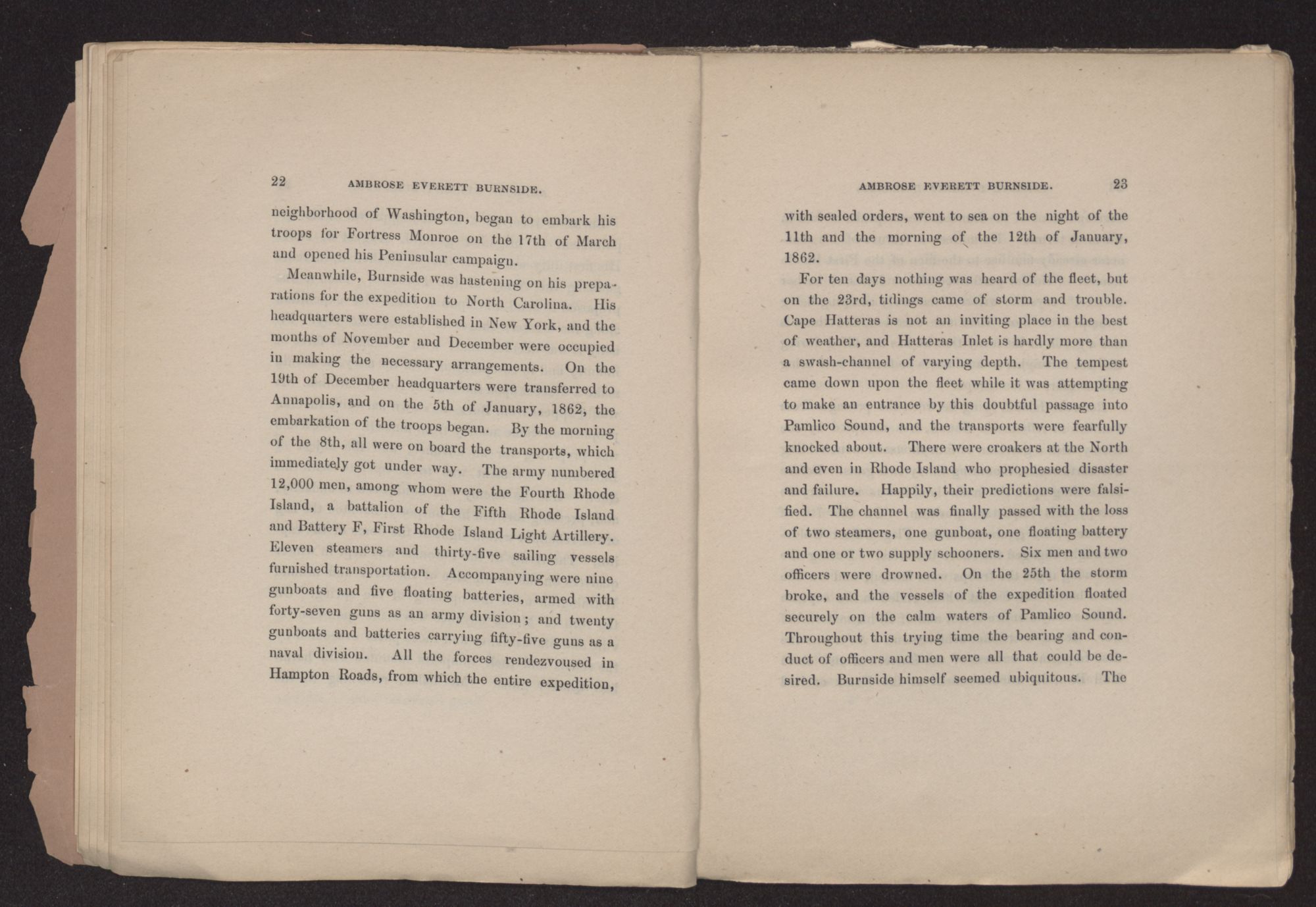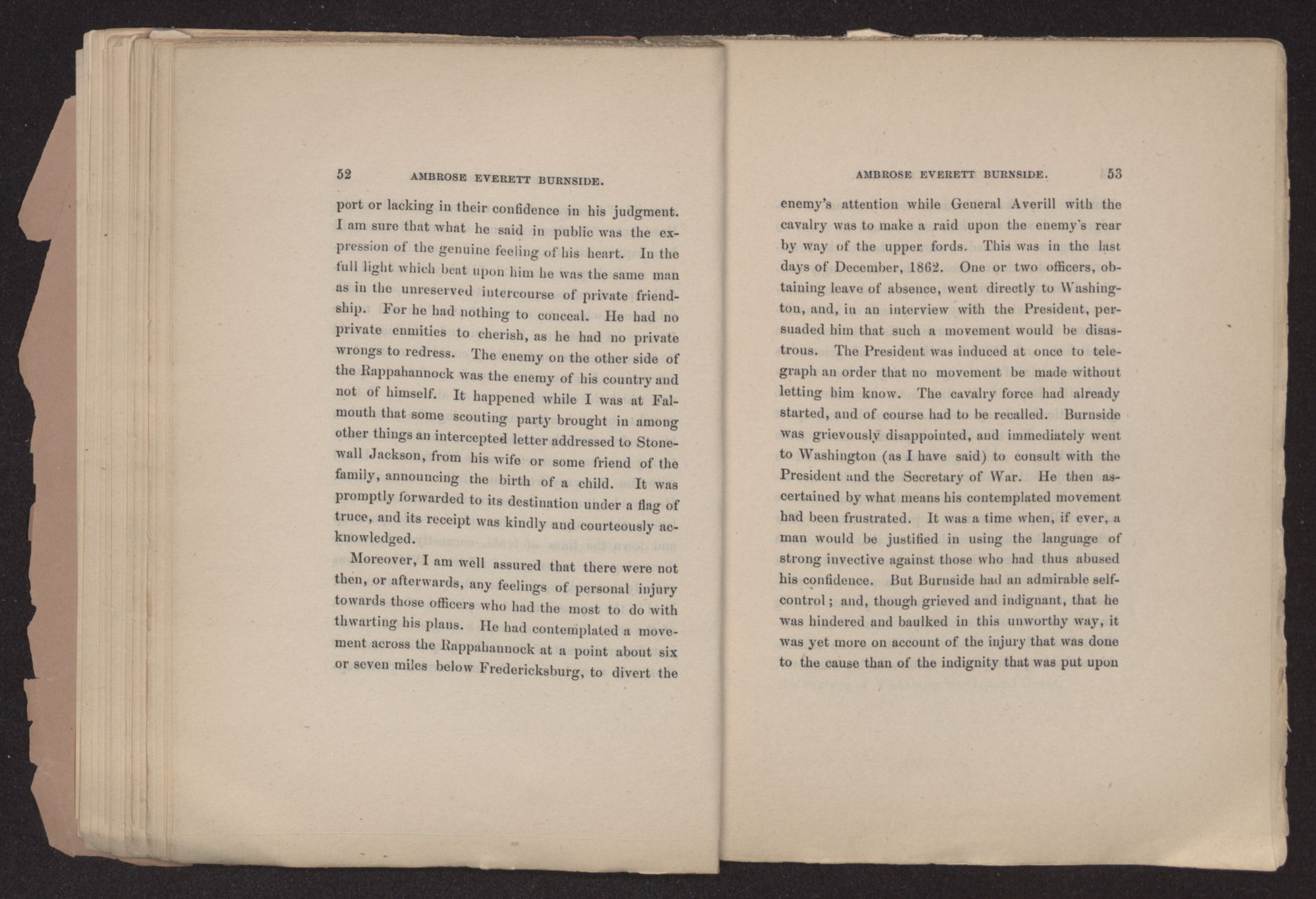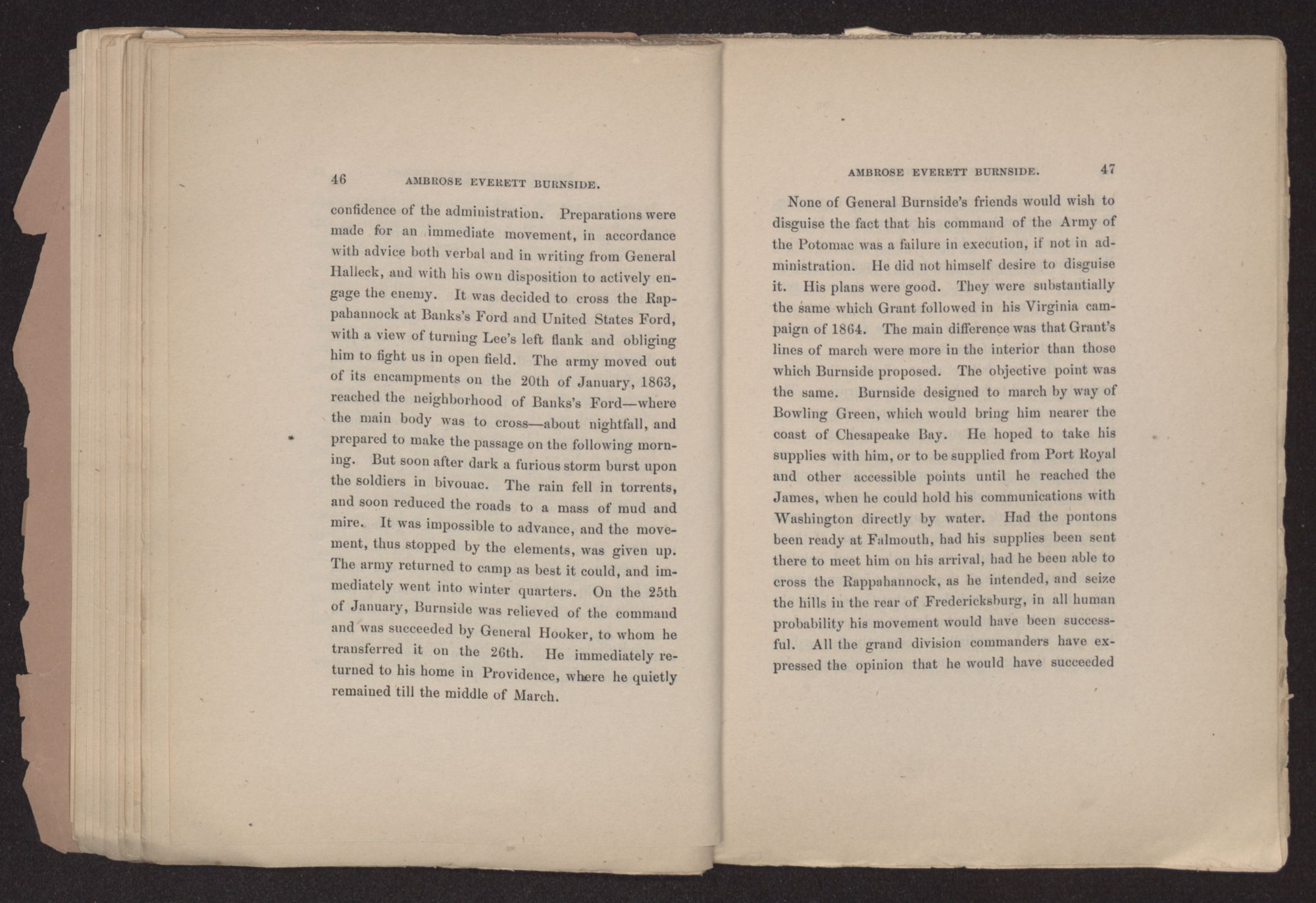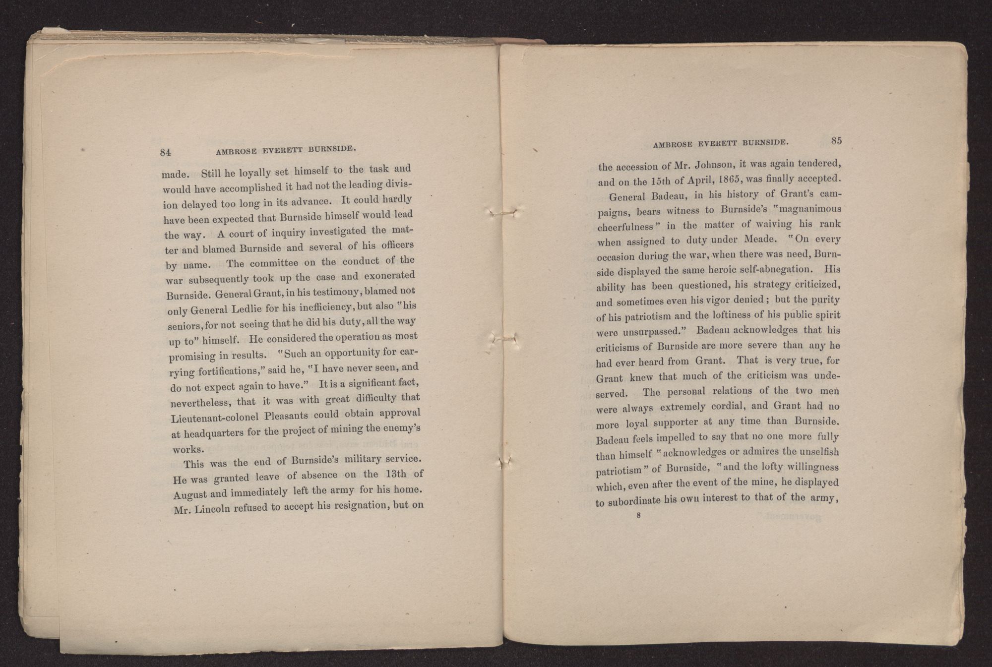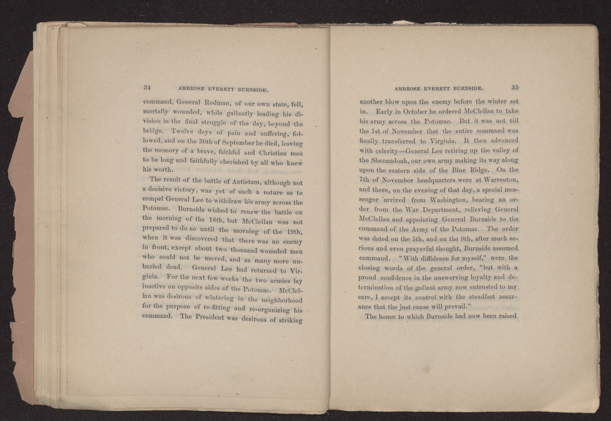 Ambrose Everett Burnside was born in Liberty, Indiana, May 23, 1824, and died in Bristol, Rhode Island, September 13, 1881. The interval between these two dates was filled with the events of a busy and useful life. It was also a life which attracted an unwonted measure of honor, esteem and affection. In public, it was spent in patriotic service. In private, it was the object of a devoted and fervent love. It exhibited and illustrated some of the best qualities of manhood. It is very fitting that it should be set forth before those who shared the perils of its career, and who, in the spirit of a generous comradeship, have rejoiced in the honors which marked its course. It is also fitting