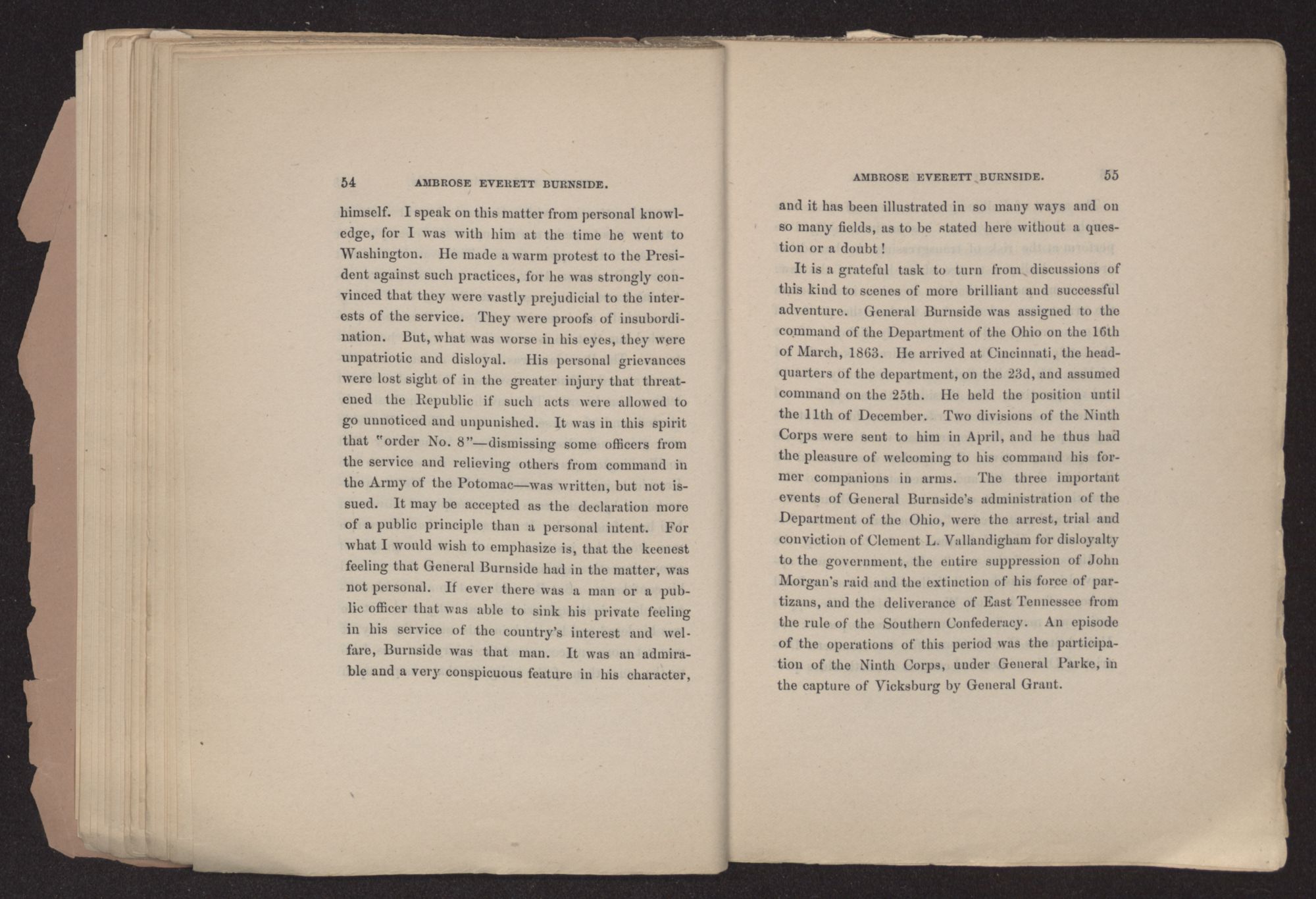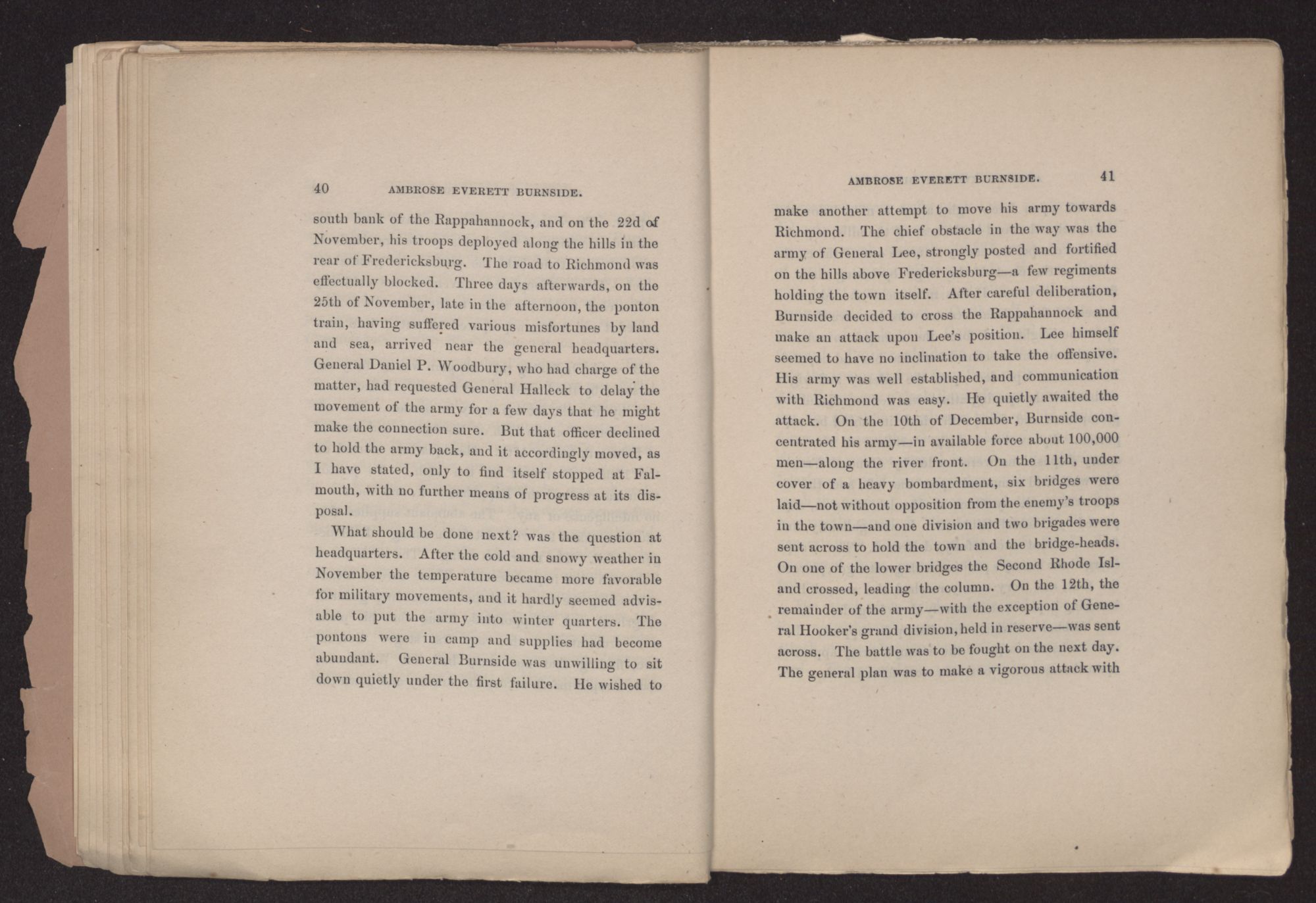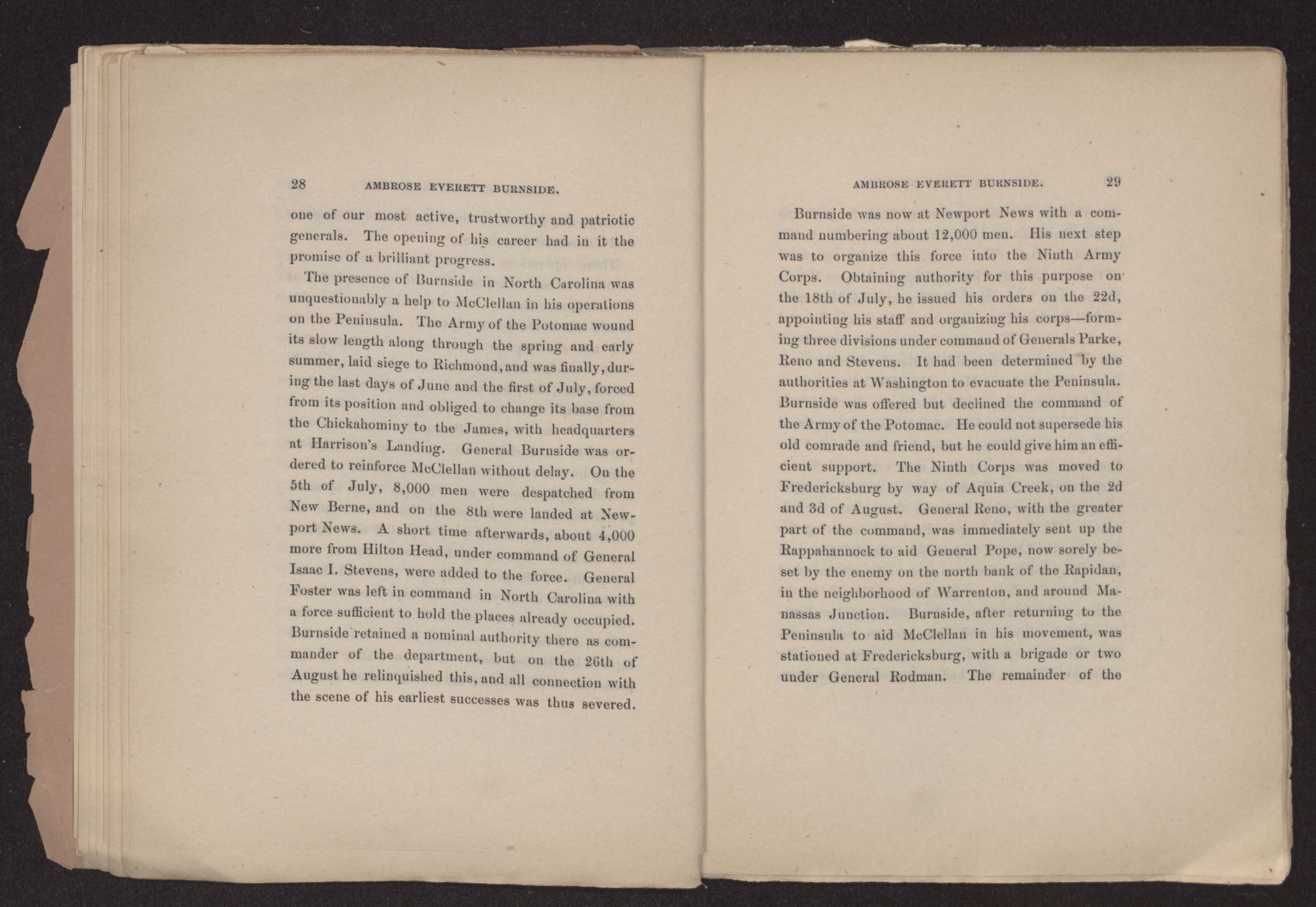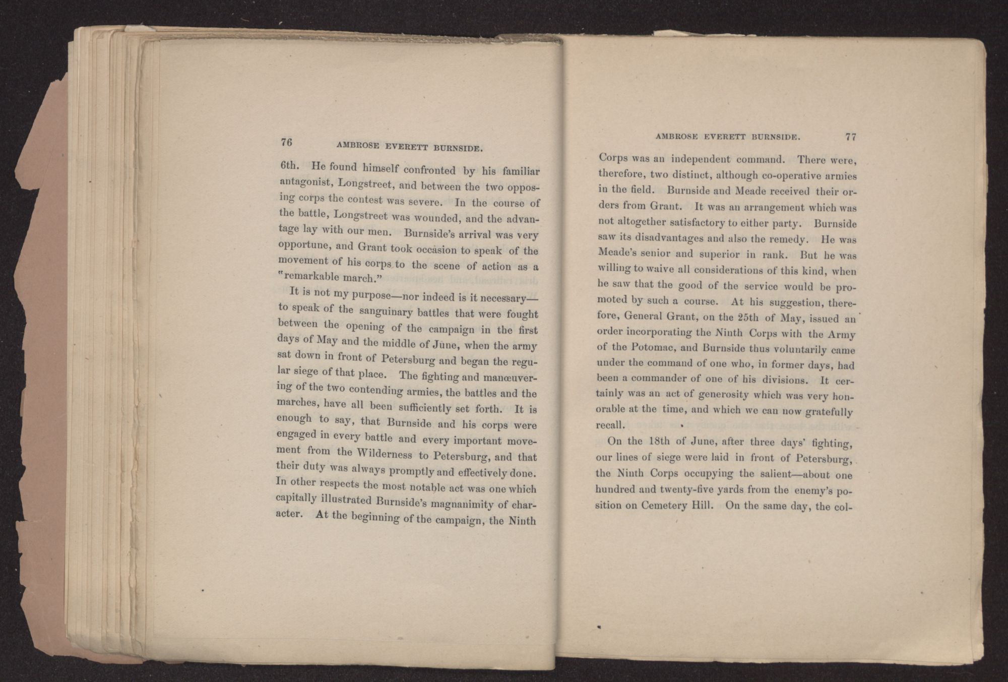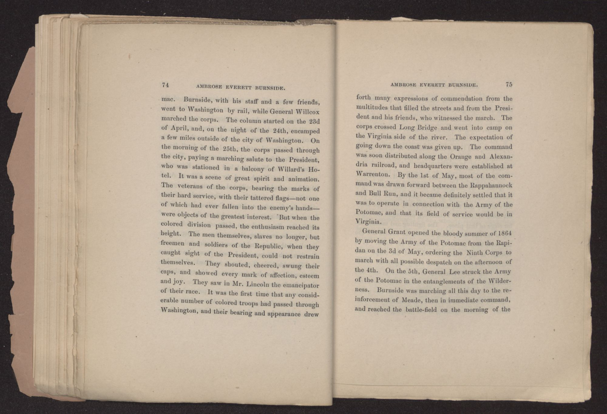Ambrose Everett Burnside was born in Liberty, Indiana, May 23, 1824, and died in Bristol, Rhode Island, September 13, 1881. The interval between these two dates was filled with the events of a busy and useful life. It was also a life which attracted an unwonted measure of honor, esteem and affection. In public, it was spent in patriotic service. In private, it was the object of a devoted and fervent love. It exhibited and illustrated some of the best qualities of manhood. It is very fitting that it should be set forth before those who shared the perils of its career, and who, in the spirit of a generous comradeship, have rejoiced in the honors which marked its course. It is also fitting