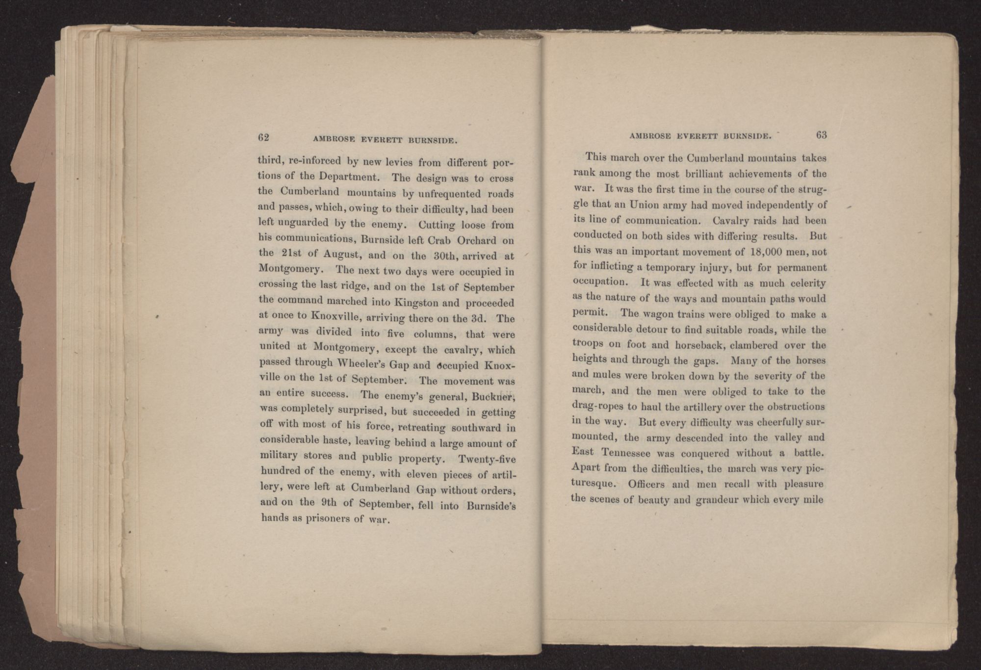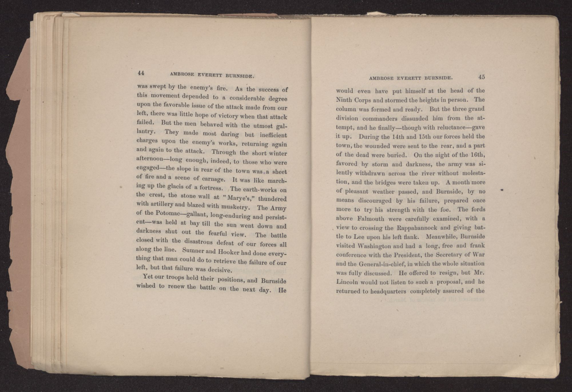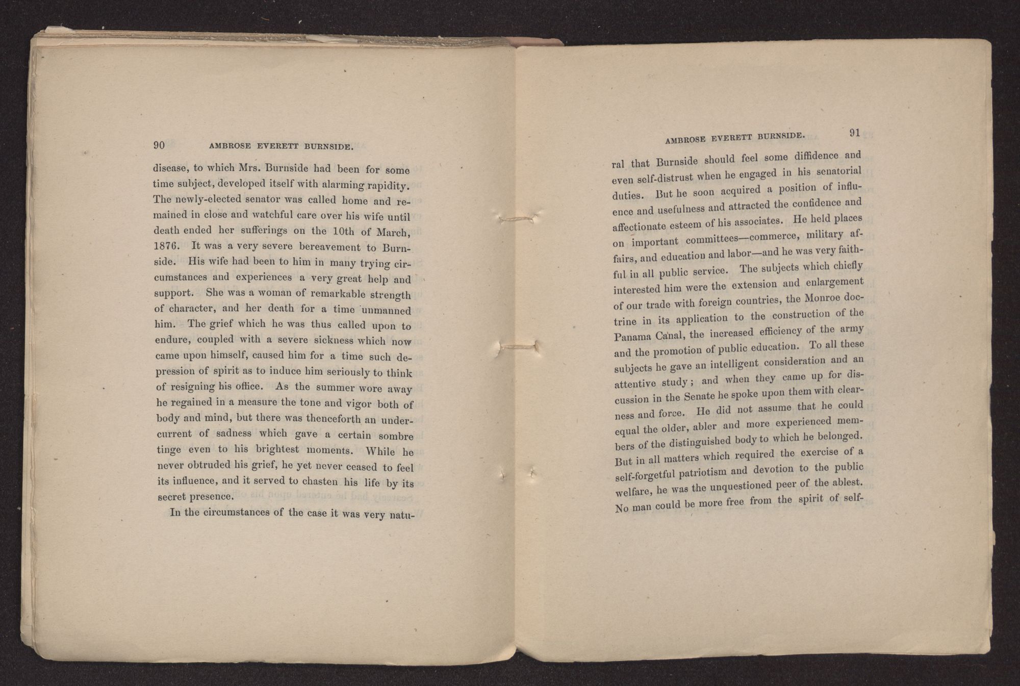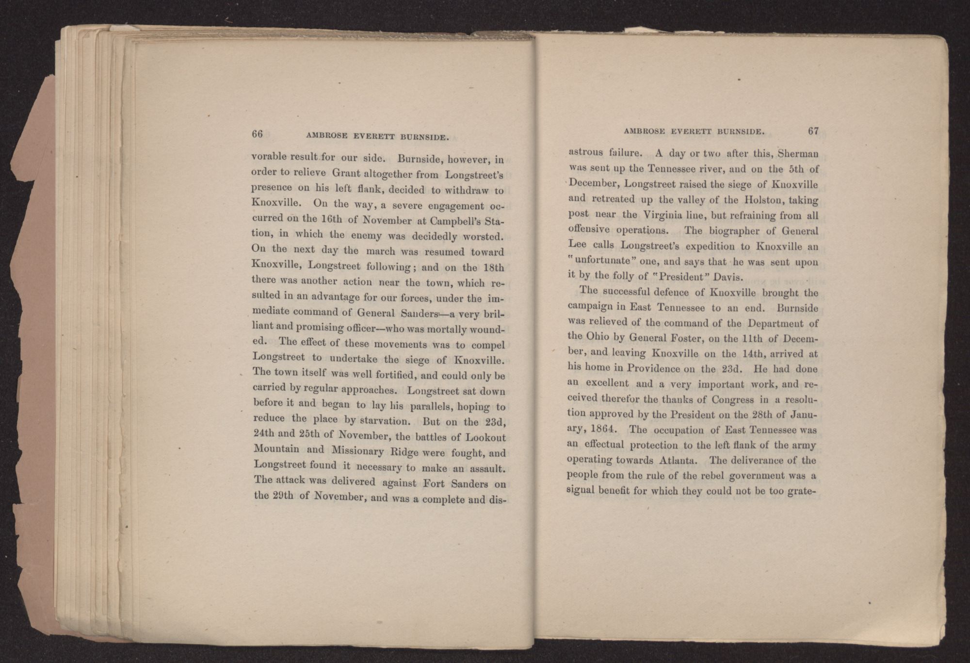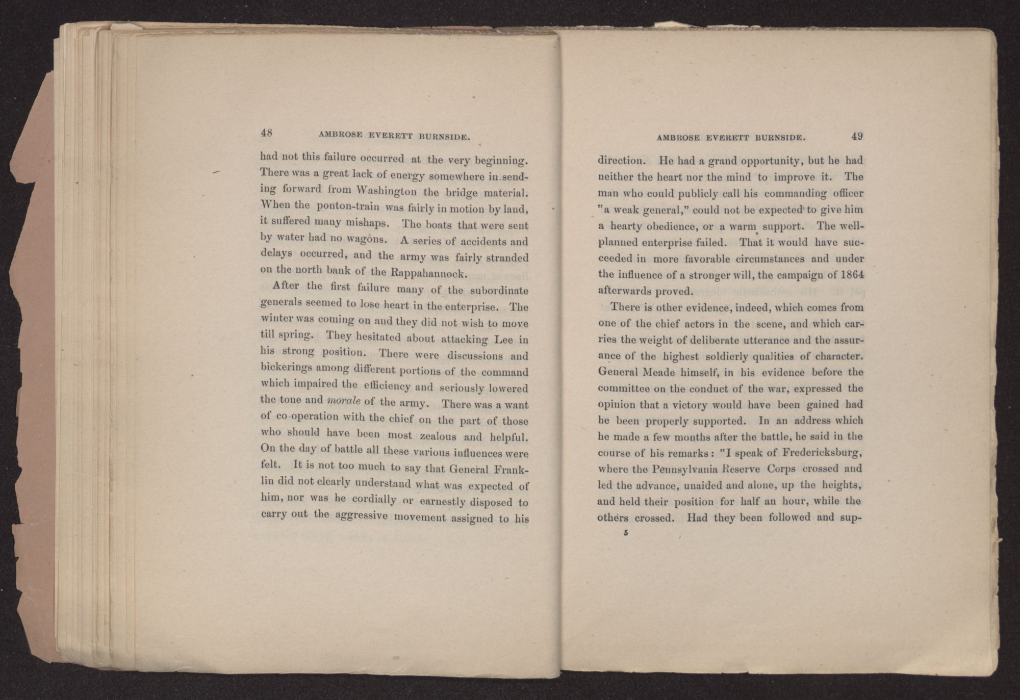 Ambrose Everett Burnside was born in Liberty, Indiana, May 23, 1824, and died in Bristol, Rhode Island, September 13, 1881. The interval between these two dates was filled with the events of a busy and useful life. It was also a life which attracted an unwonted measure of honor, esteem and affection. In public, it was spent in patriotic service. In private, it was the object of a devoted and fervent love. It exhibited and illustrated some of the best qualities of manhood. It is very fitting that it should be set forth before those who shared the perils of its career, and who, in the spirit of a generous comradeship, have rejoiced in the honors which marked its course. It is also fitting