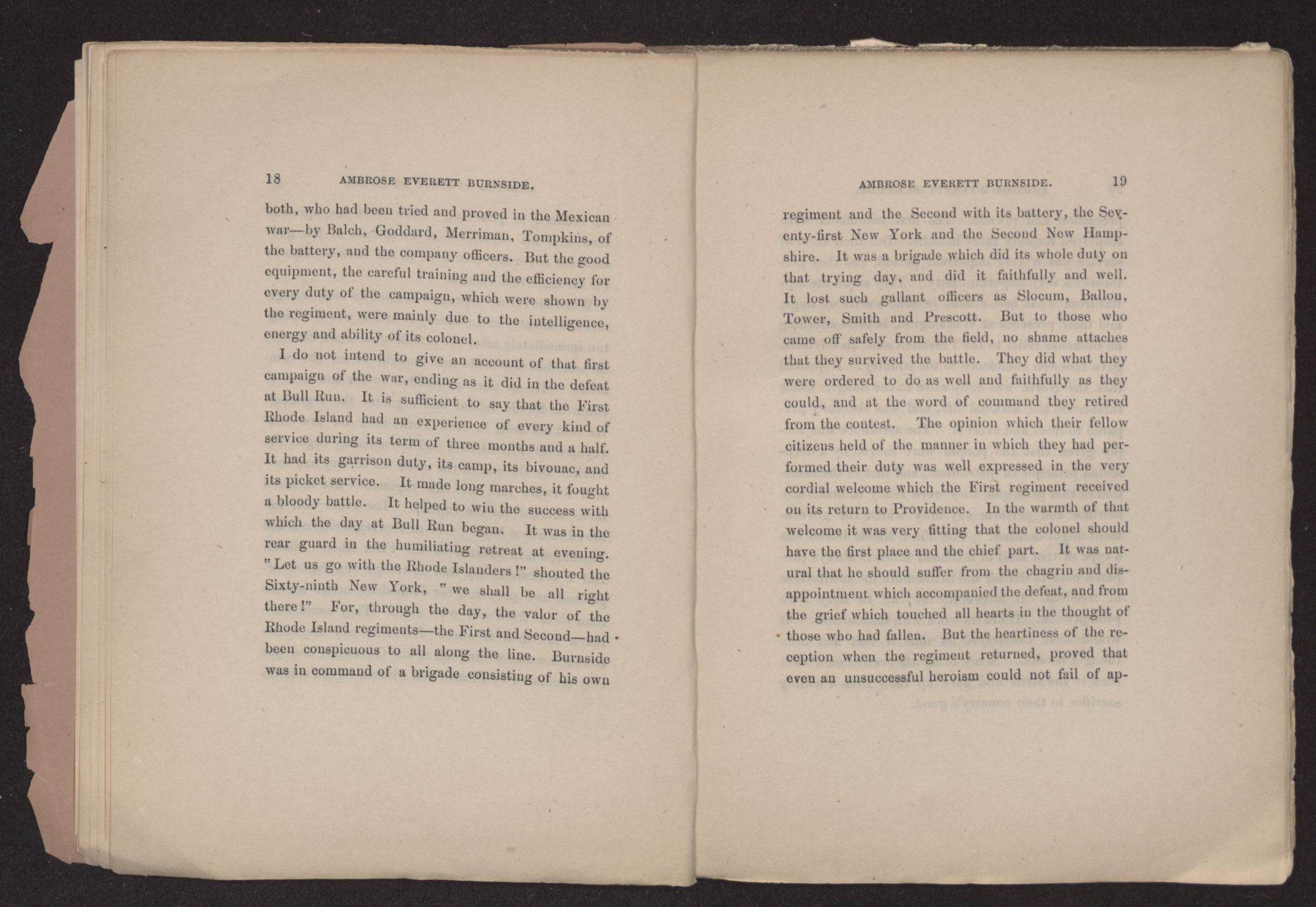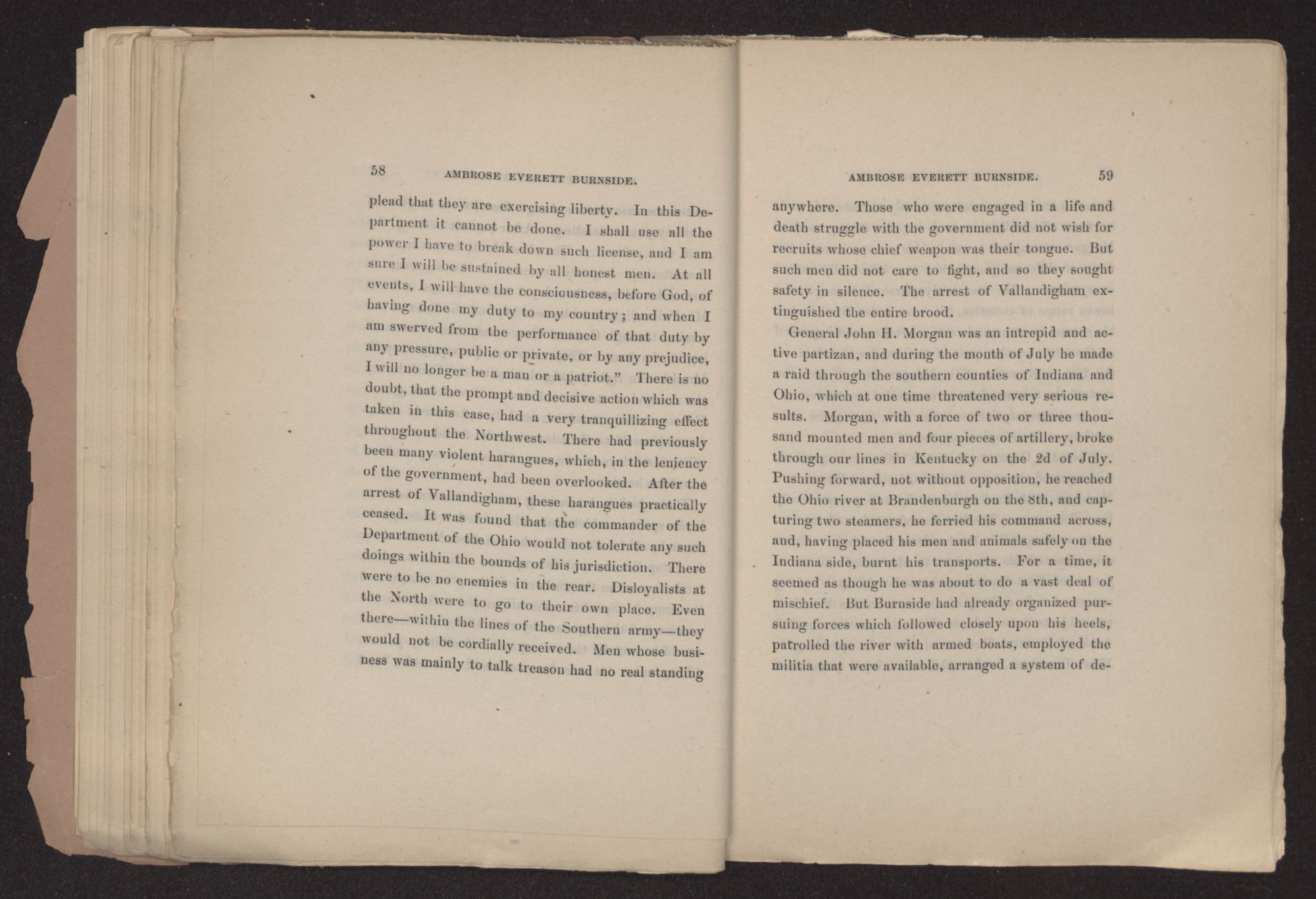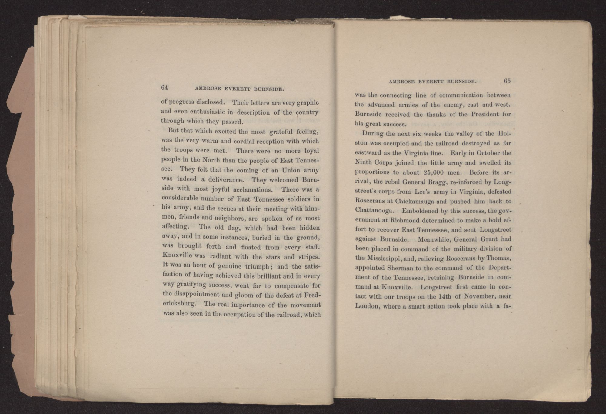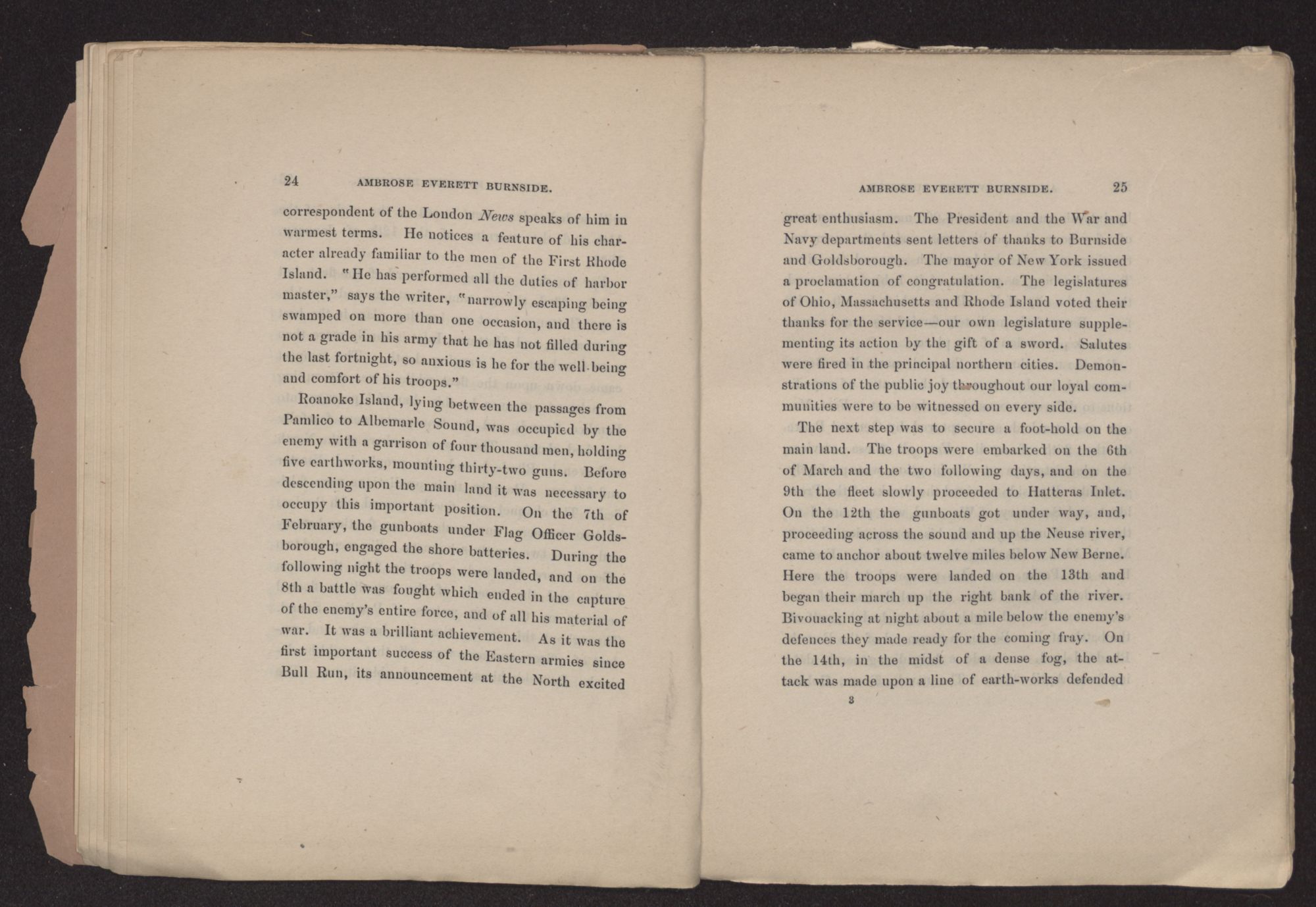 Ambrose Everett Burnside was born in Liberty, Indiana, May 23, 1824, and died in Bristol, Rhode Island, September 13, 1881. The interval between these two dates was filled with the events of a busy and useful life. It was also a life which attracted an unwonted measure of honor, esteem and affection. In public, it was spent in patriotic service. In private, it was the object of a devoted and fervent love. It exhibited and illustrated some of the best qualities of manhood. It is very fitting that it should be set forth before those who shared the perils of its career, and who, in the spirit of a generous comradeship, have rejoiced in the honors which marked its course. It is also fitting