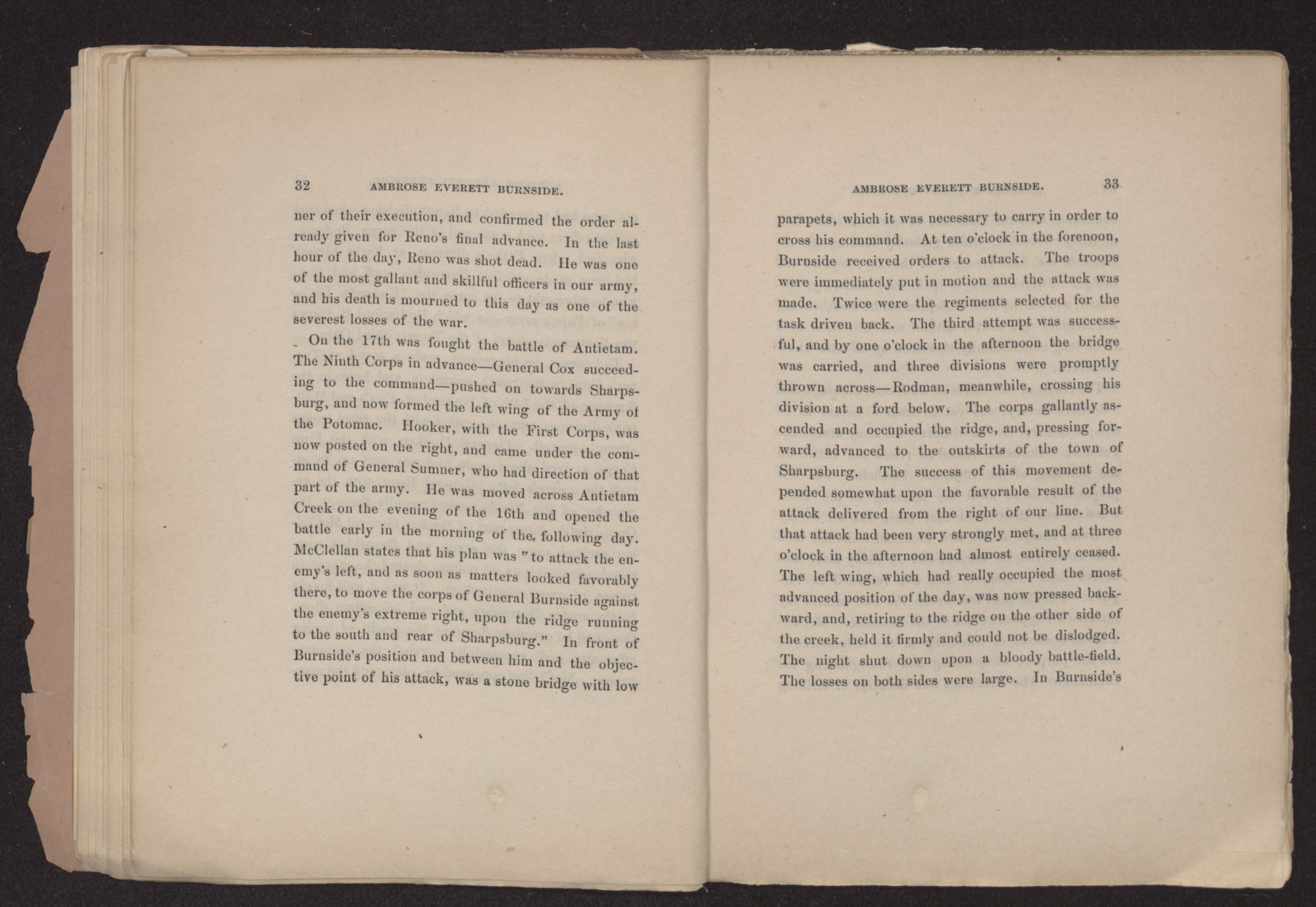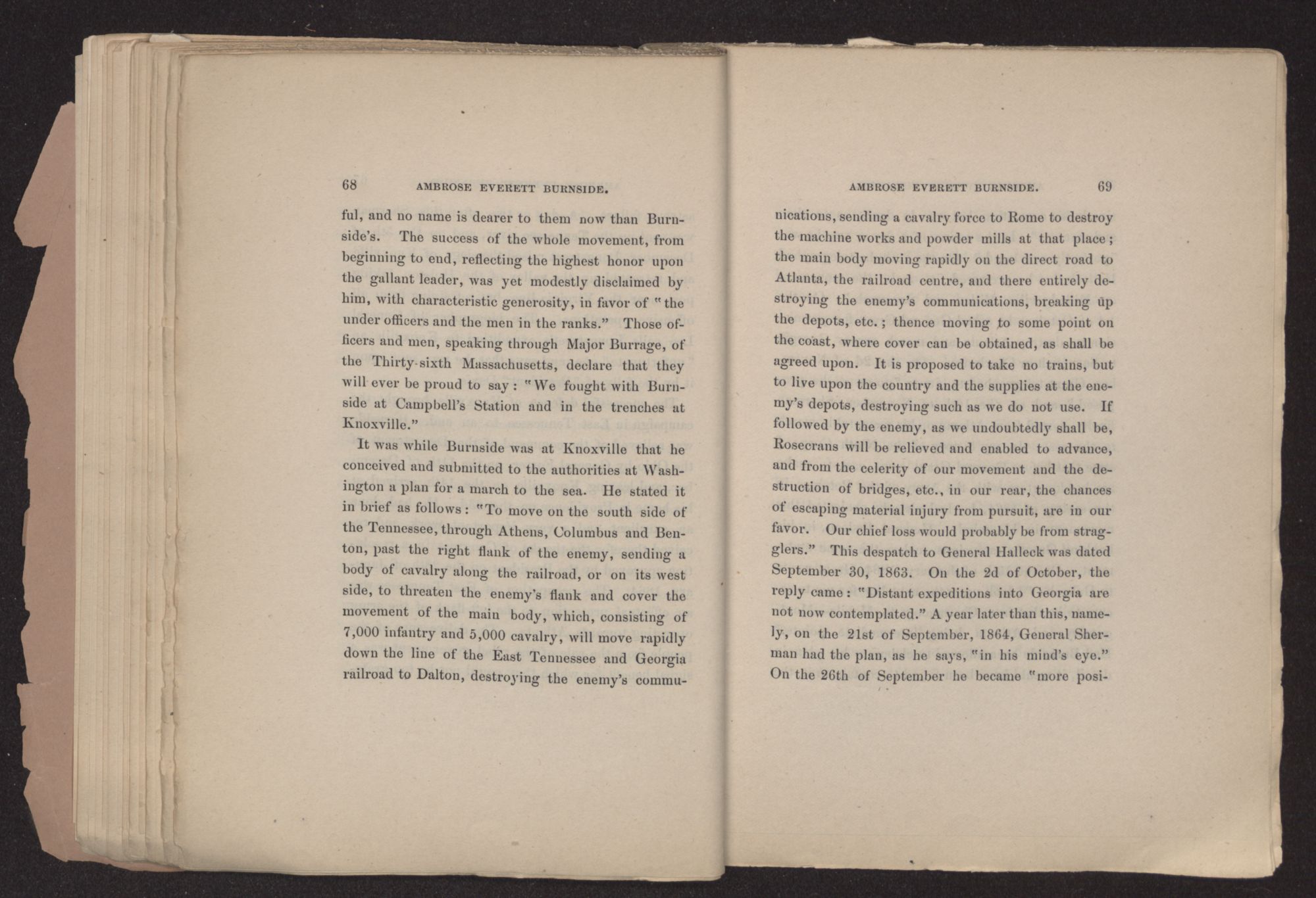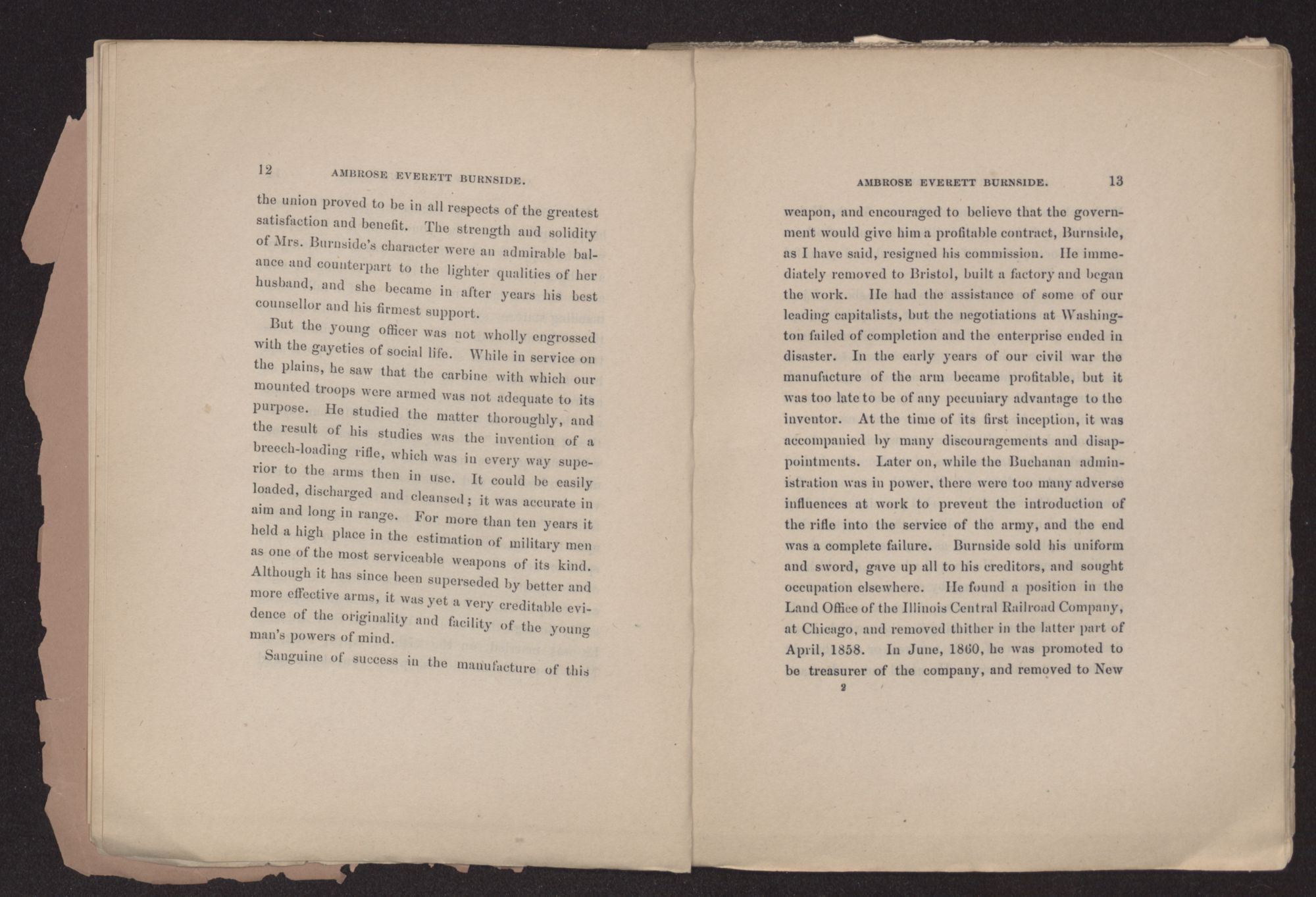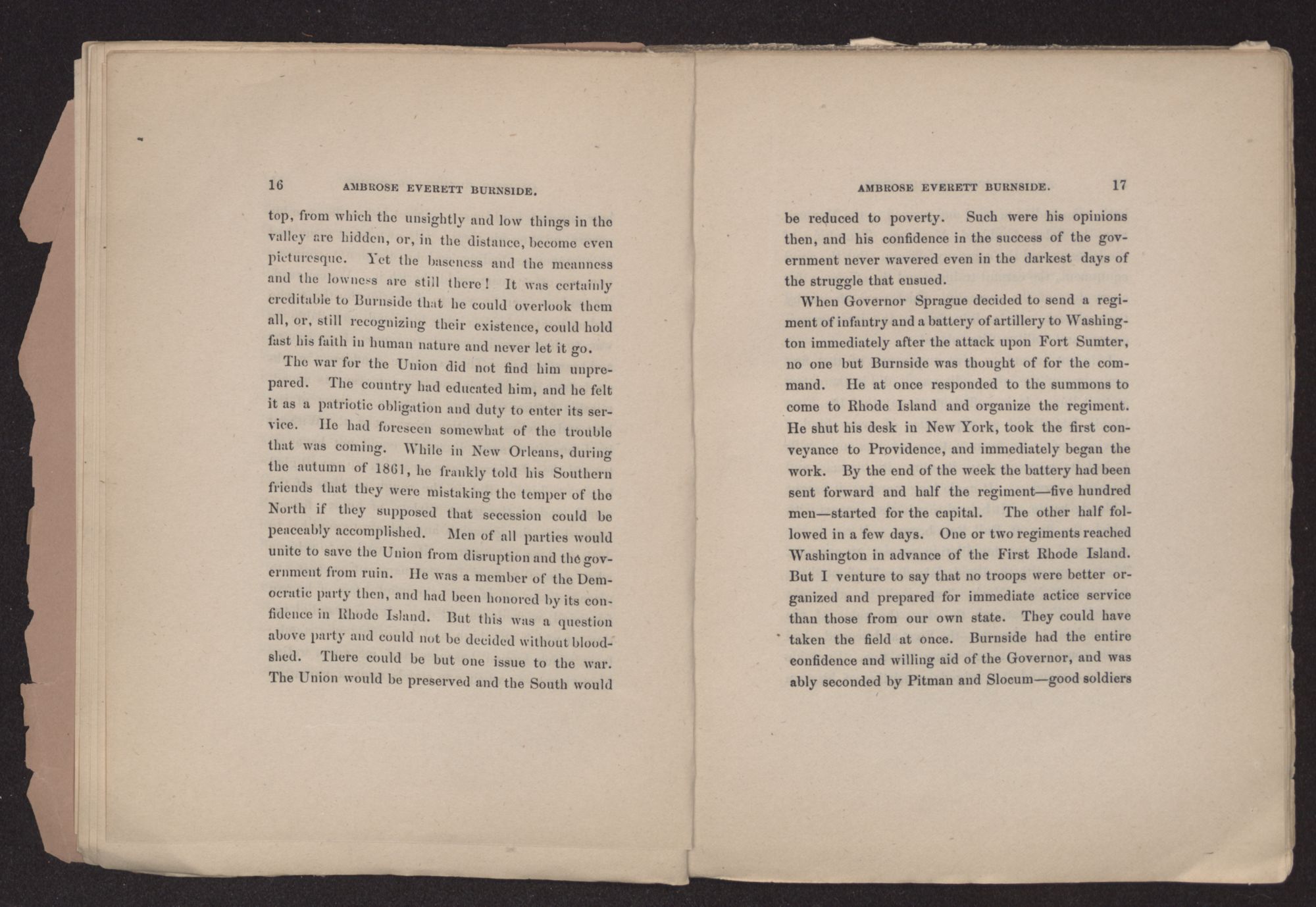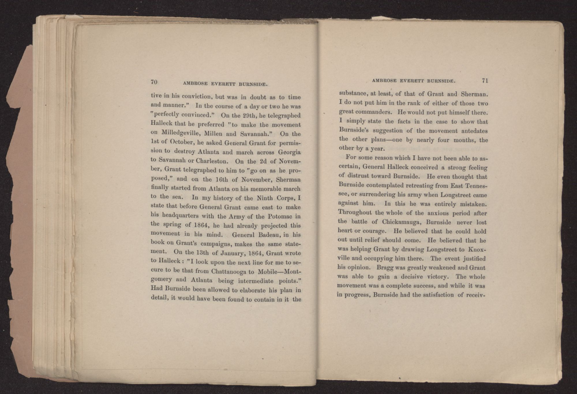 Ambrose Everett Burnside was born in Liberty, Indiana, May 23, 1824, and died in Bristol, Rhode Island, September 13, 1881. The interval between these two dates was filled with the events of a busy and useful life. It was also a life which attracted an unwonted measure of honor, esteem and affection. In public, it was spent in patriotic service. In private, it was the object of a devoted and fervent love. It exhibited and illustrated some of the best qualities of manhood. It is very fitting that it should be set forth before those who shared the perils of its career, and who, in the spirit of a generous comradeship, have rejoiced in the honors which marked its course. It is also fitting