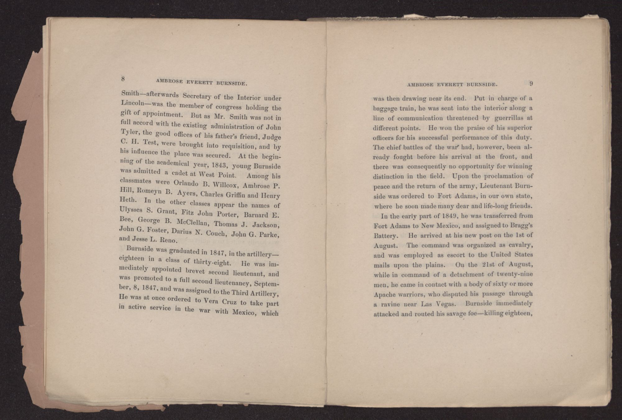 removed to Indiana was Miss Pamelia Brown, whom Mr. Burnside married. Nine children were born to them, of whom Ambrose was the fourth. He was named for the family physician, Dr. Everts, but, on his appointment to the military academy, at West Point, changed his second name to Everett, retaining it afterwards through his life-time. There is a story, that the boy at one time tried to learn the trade of a tailor, and that he was found by friends who became interested in him, conning a book of tactics, while working at the board. He was carefully brought up, and taught as well as he could be in the elementary schools of the time. It is known that he was of an ardent and adventurous character, with an active and sanguine temperament, which was hardly suited to a quiet occupation. His father, who held the office of associate judge of the county court, desired to give him a military education, and it is a pleasing proof of the esteem in which Mr. Burnside was held, that the young man received the almost, if not entirely, unanimous recommendation of the legislature of Indiana for an appointment to the national military academy. The Hon. Caleb B.Smith—afterwards