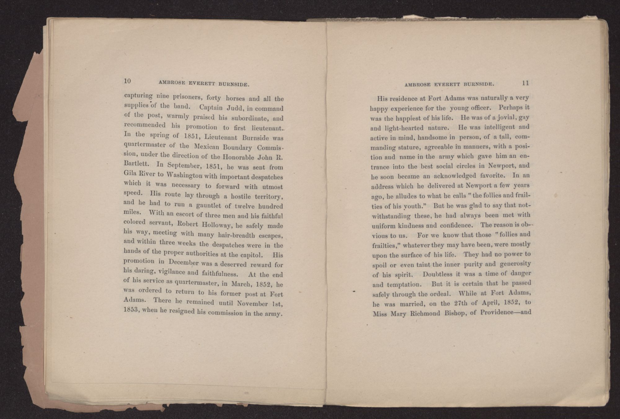 capturing nine prisoners, forty horses and all the supplies of the band. Captain Judd, in command of the post, warmly praised his subordinate, and recommended his promotion to first lieutenant. In the spring of 1851, Lieutenant Burnside was quartermaster of the Mexican Boundary Commission, under the direction of the Honorable John R. Bartlett. In September, 1851, he was sent from Gila River to Washington with important despatches which it was necessary to forward with utmost speed. His route lay through a hostile territory, and he had to run a gauntlet of twelve hundred miles. With an escort of three men and his faithful colored servant, Robert Holloway, he safely made his way, meeting with many hair-breadth escapes, and within three weeks the despatches were in the hands of the proper authorities at the capitol. His promotion in December was a deserved reward for his daring, vigilance and faithfulness. At the end of his service as quartermaster, in March, 1852, he was ordered to return to his former post at Fort Adams. There he remained until November 1st, 1853, when he resigned his commission in the army.