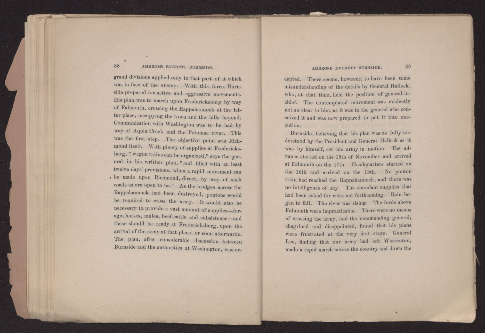 None of General Burnside's friends would wish to disguise the fact that his command of the Army of the Potomac was a failure in execution, if not in administration. He did not himself desire to disguise it. His plans were good. They were substantially the same which Grant followed in his Virginia campaign of 1864. The main difference was that Grant's lines of march were more in the interior than those which Burnside proposed. The objective point was the same. Burnside designed to march by way of Bowling Green, which would bring him nearer the coast of Chesapeake Bay. He hoped to take his supplies with him, or to be supplied from Port Royal and other accessible points until he reached the James, when he could hold his communications with Washington directly by water. Had the pontons been ready at Falmouth, had his supplies been sent there to meet him on his arrival, had he been able to cross the Rappahannock, as he intended, and seize the hills in the rear of Fredericksburg, in all human probability his movement would have been successful. All the grand division commanders have expressed the opinion that he would have succeeded