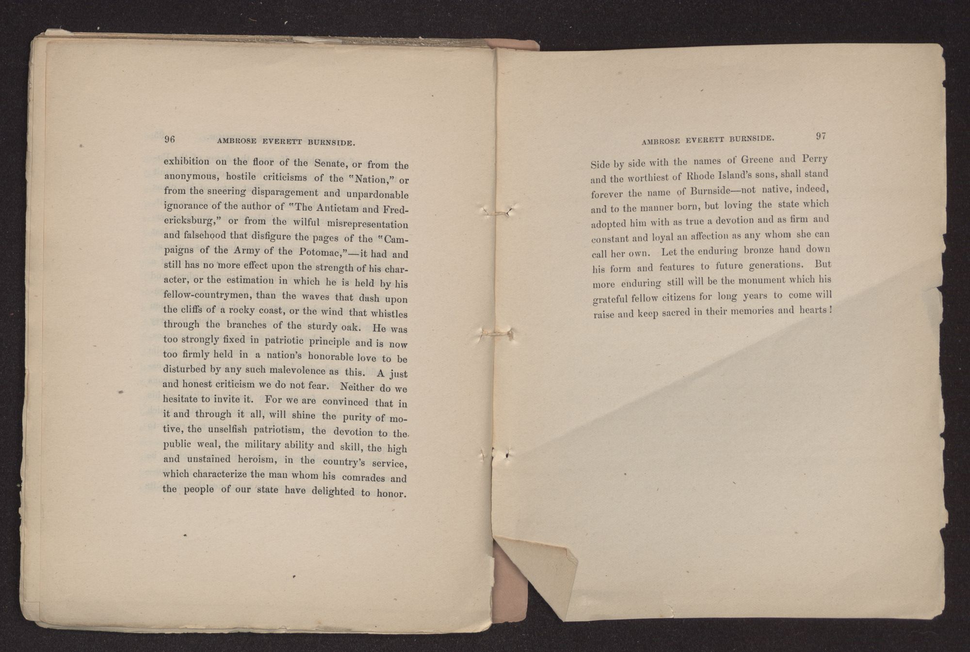 Side by side with the names of Greene and Perry and the worthiest of Rhode Island's sons, shall stand forever the name of Burnside—not native, indeed, and to the manner born, but loving the state which adopted him with as true a devotion and as firm and constant and loyal an affection as any whom she can call her own. Let the enduring bronze hand down his form and features to future generations. But more enduring still will be the monument which his grateful fellow citizens for long years to come will raise and keep sacred in their memories and hearts!