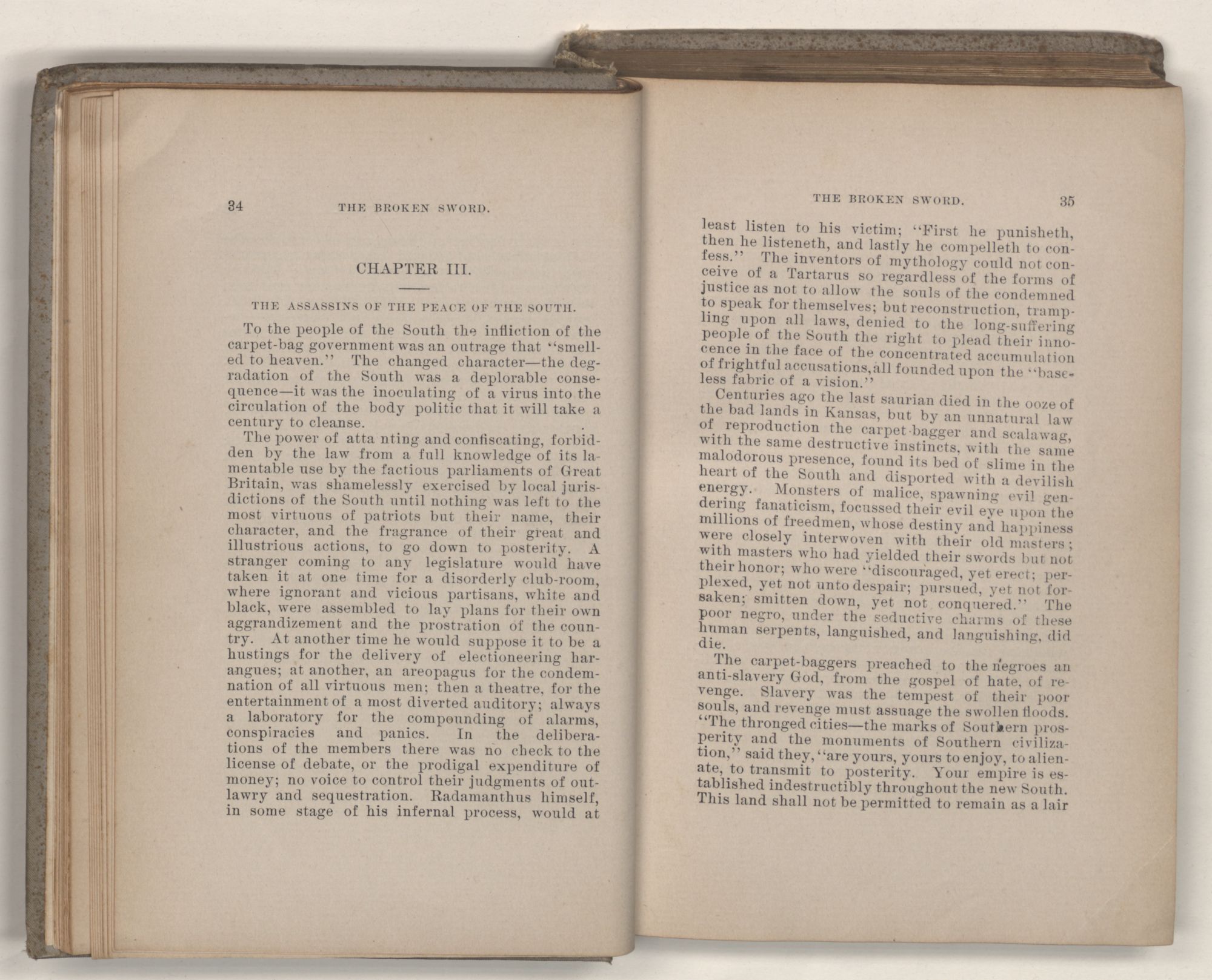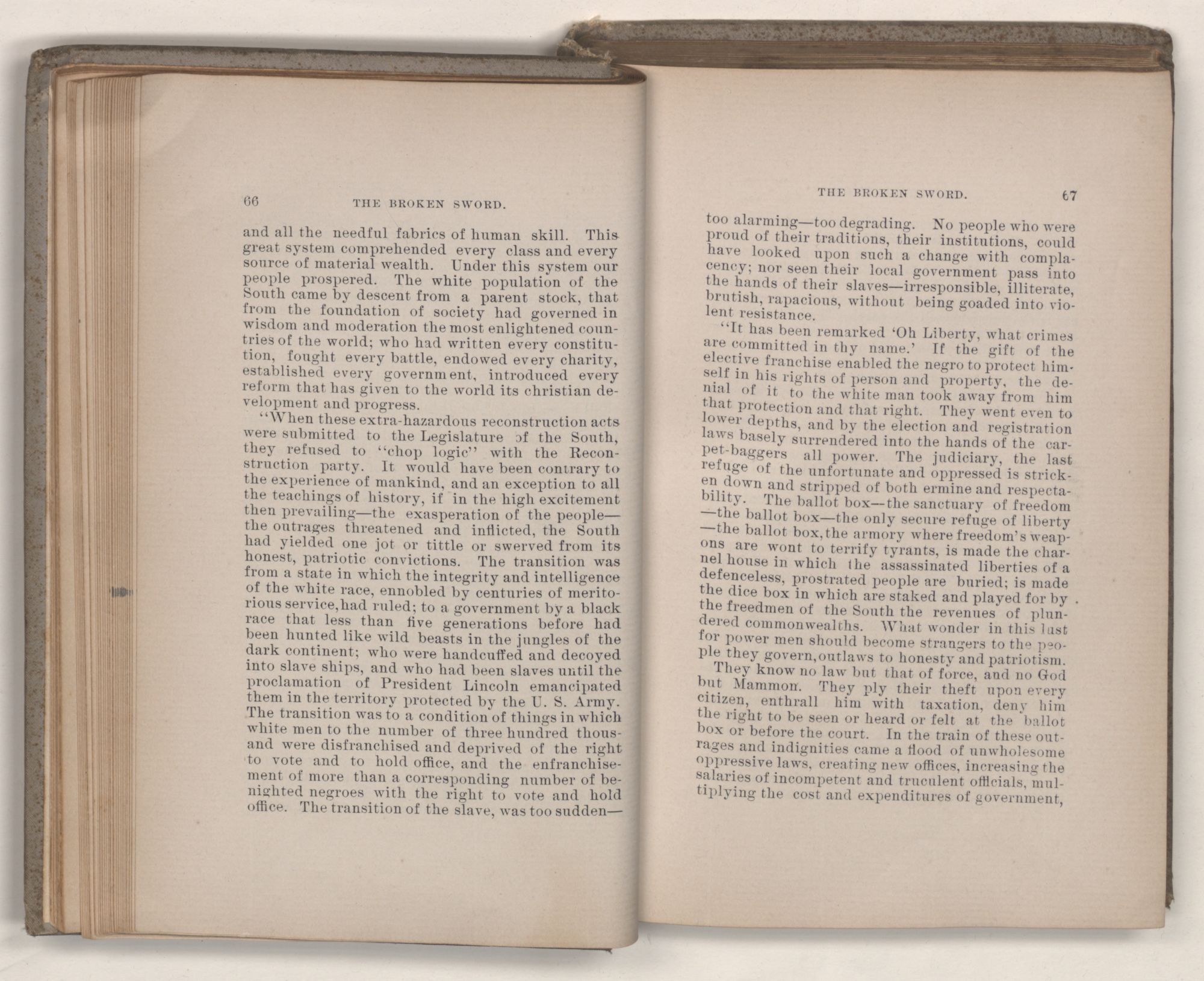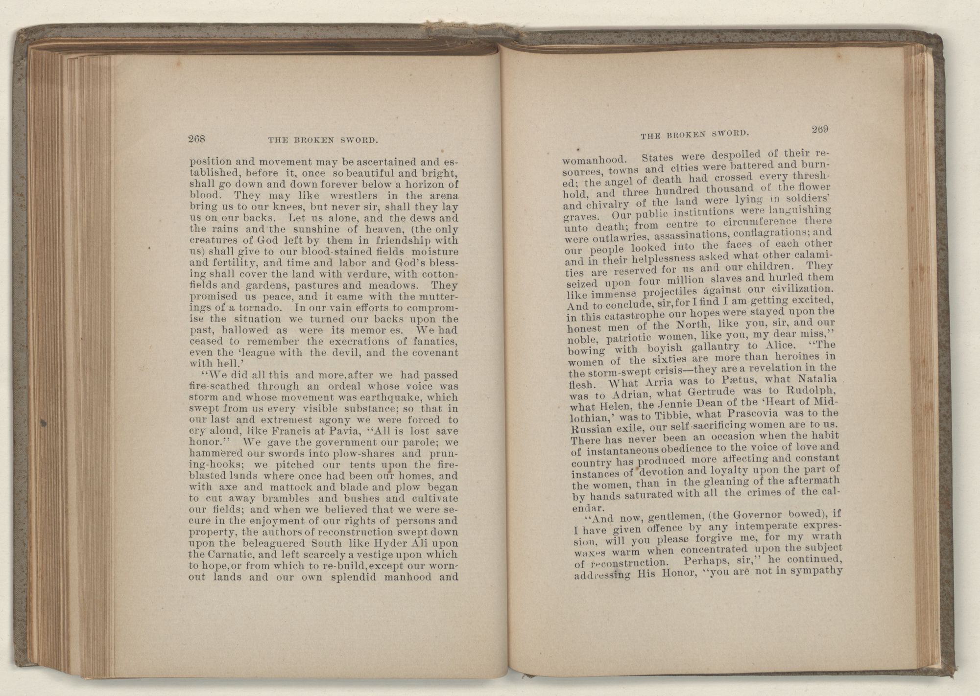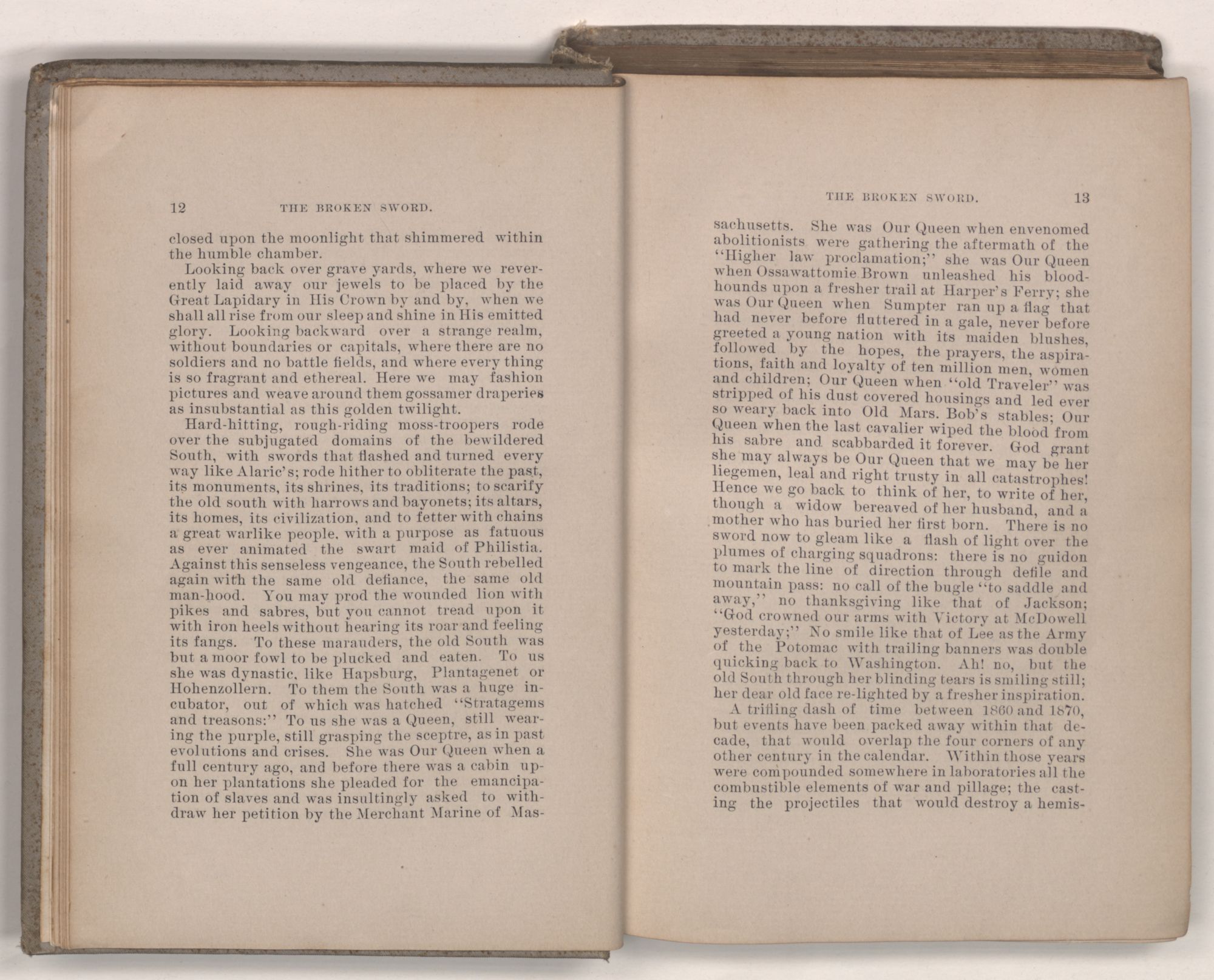 Hard-hitting, rough-riding moss-troopers rode over the subjugated domains of the bewildered South, with swords that flashed and turned every way like Alaric's; rode hither to obliterate the past, its monuments, its shrines, its traditions; to scarify the old south with harrows and bayonets; its altars, its homes, its civilization, and to fetter with chains a great warlike people, with a purpose as fatuous as ever animated the swart maid of Philistia. Against this senseless vengeance, the South rebelled again with the same old defiance, the same old man-hood. You may prod the wounded lion with pikes and sabres, but you cannot tread upon it with iron heels without hearing its roar and feeling its fangs. To these marauders, the old South was but a moor fowl to be plucked and eaten. To us she was dynastic, like Hapsburg, Plantagenet or Hohenzollern. To them the South was a huge incubator, out of which was hatched “Stratagems and treasons:” To us she was a Queen, still wearing the purple, still grasping the sceptre, as in past evolutions and crises. She was Our Queen when a full century ago, and before there was a cabin upon her plantations she pleaded for the emancipation of slaves and was insultingly asked to withdraw her petition by the Merchant Marine of Massachusetts.