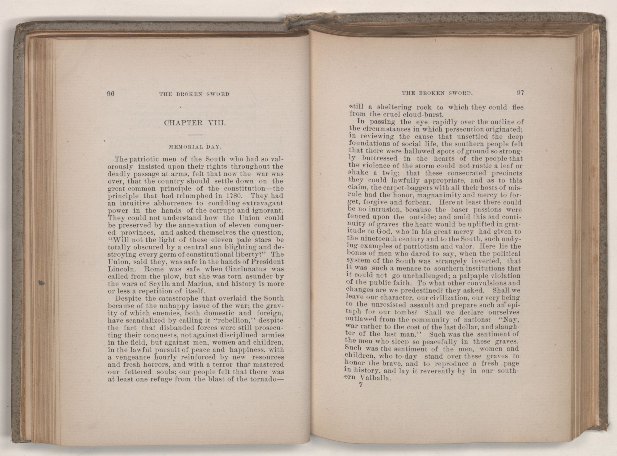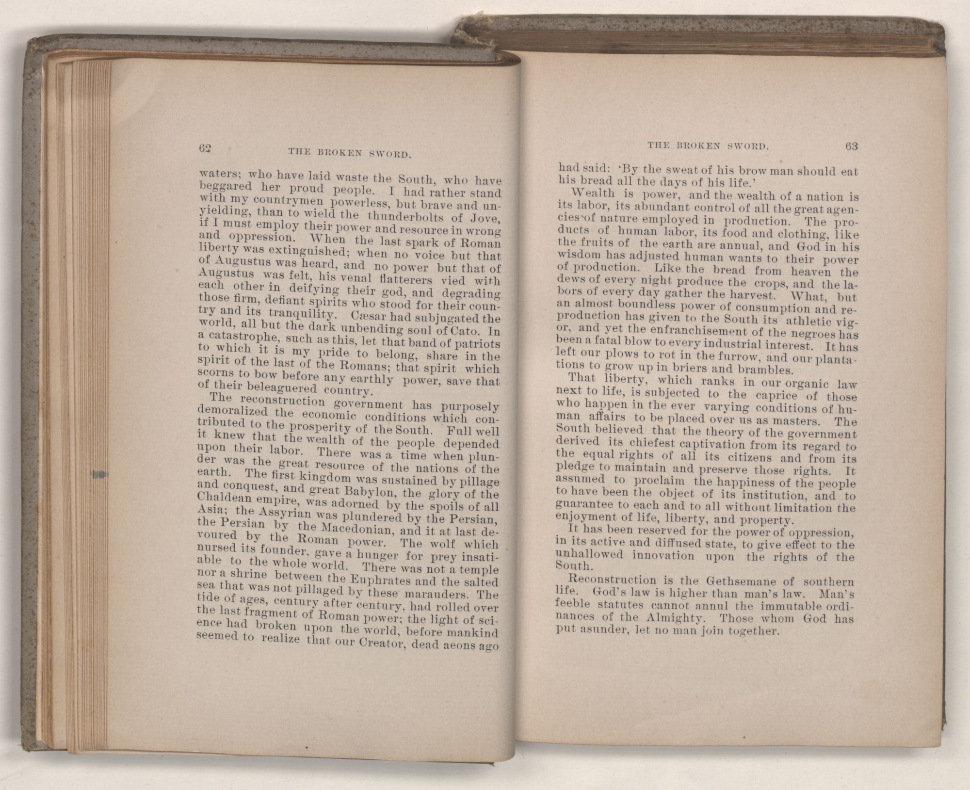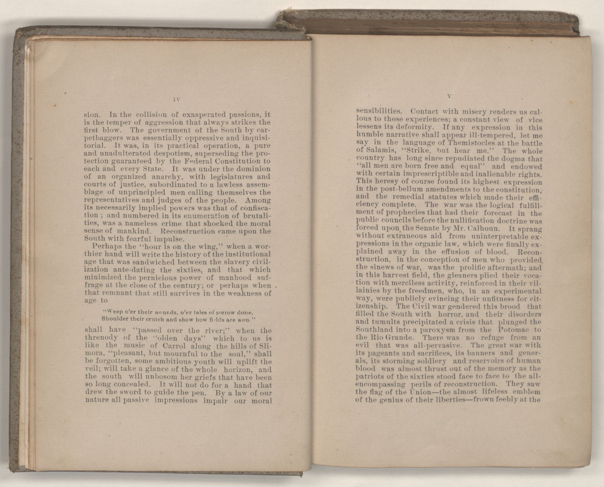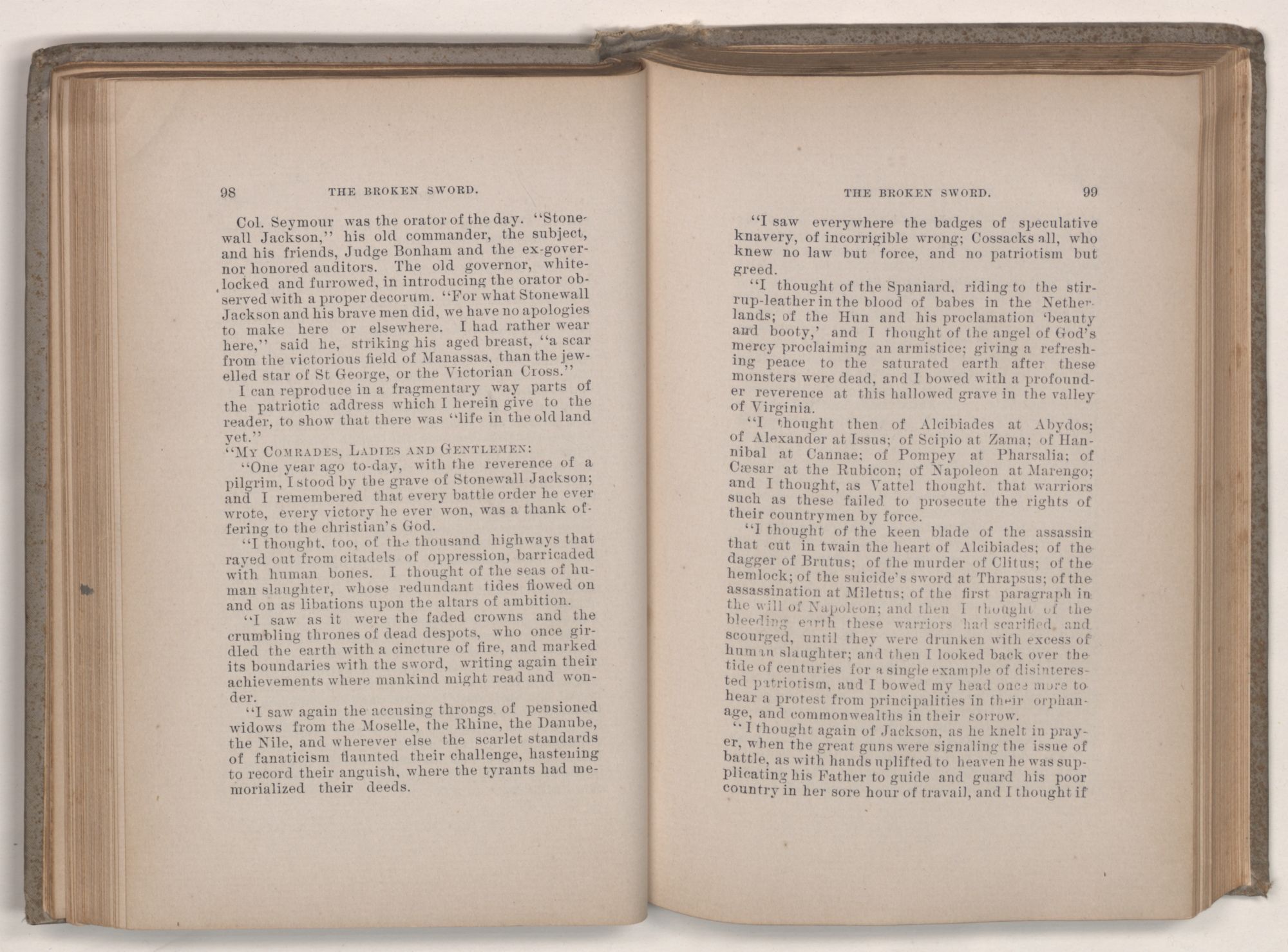 Hard-hitting, rough-riding moss-troopers rode over the subjugated domains of the bewildered South, with swords that flashed and turned every way like Alaric's; rode hither to obliterate the past, its monuments, its shrines, its traditions; to scarify the old south with harrows and bayonets; its altars, its homes, its civilization, and to fetter with chains a great warlike people, with a purpose as fatuous as ever animated the swart maid of Philistia. Against this senseless vengeance, the South rebelled again with the same old defiance, the same old man-hood. You may prod the wounded lion with pikes and sabres, but you cannot tread upon it with iron heels without hearing its roar and feeling its fangs. To these marauders, the old South was but a moor fowl to be plucked and eaten. To us she was dynastic, like Hapsburg, Plantagenet or Hohenzollern. To them the South was a huge incubator, out of which was hatched “Stratagems and treasons:” To us she was a Queen, still wearing the purple, still grasping the sceptre, as in past evolutions and crises. She was Our Queen when a full century ago, and before there was a cabin upon her plantations she pleaded for the emancipation of slaves and was insultingly asked to withdraw her petition by the Merchant Marine of Massachusetts.