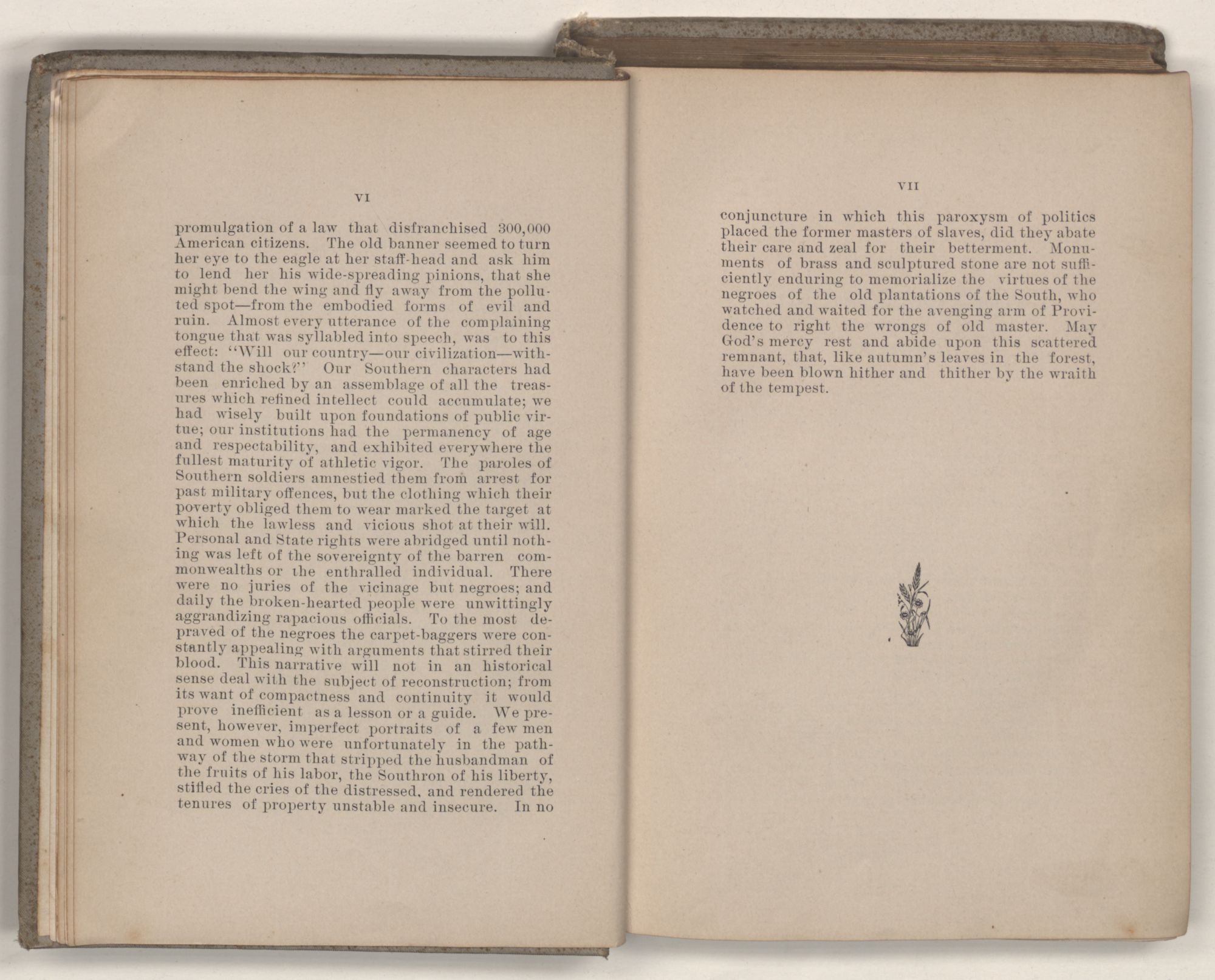 sensibilities. Contact with misery renders us callous to those experiences; a constant view of vice lessens its deformity. If any expression in this humble narrative shall appear ill-tempered, let me say in the language of Themistocles at the battle of Salamis, “Strike, but hear me.” The whole country has long since repudiated the dogma that “all men are born free and equal” and endowed with certain imprescriptible and inalienable rights. This heresy of course found its highest expression in the post-bellum amendments to the constitution, and the remedial statutes which made their efficiency complete. The war was the logical fulfillment of prophecies that had their forecast in the public councils before the nullification doctrine was forced upon the Senate by Mr. Calhoun. It sprang without extraneous aid from uninterpretable expressions in the organic law, which were finally explained away in the effusion of blood. Reconstruction, in the conception of men who provided the sinews of war, was the prolific aftermath; and in this harvest field, the gleaners plied their vocation with merciless activity, reinforced in their villainies by the freedmen, who, in an experimental way, were publicly evincing their unfitness for citizenship. The Civil war gendered this brood that filled the South with horror, and their disorders and tumults precipitated a crisis that plunged the Southland into a paroxysm from the Potomac to the Rio Grande. There was no refuge from an evil that was all-pervasive. The great war with its pageants and sacrifices, its banners and generals, its storming soldiery and reservoirs of human blood was almost thrust out of the memory as the patriots of the sixties stood face to face to the all-encompassing perils of reconstruction. They saw the flag of the Union—the almost lifeless emblem of the genius of their liberties—frown feebly at the