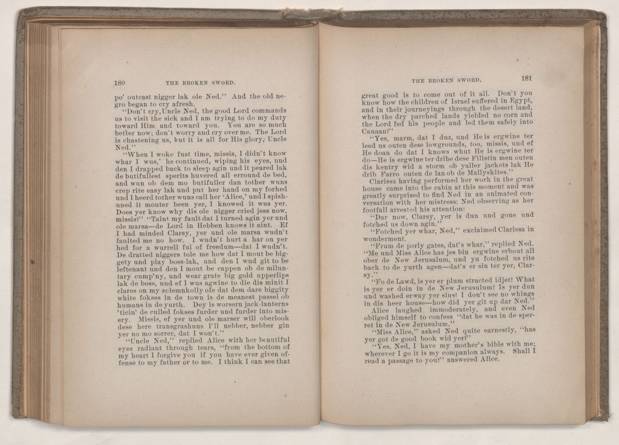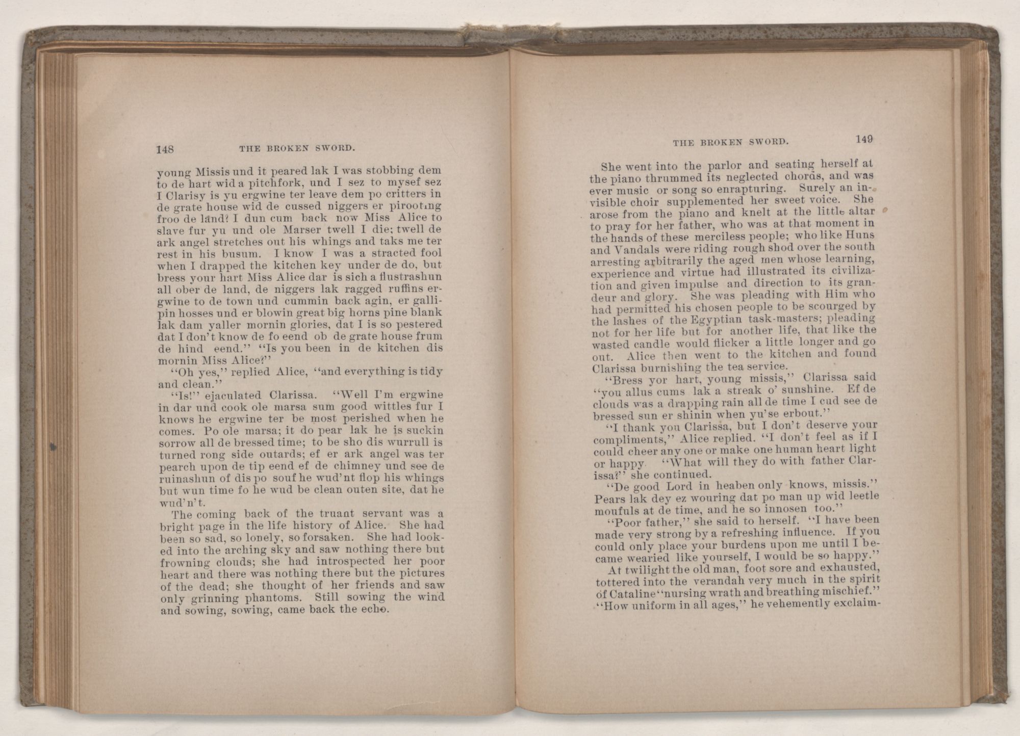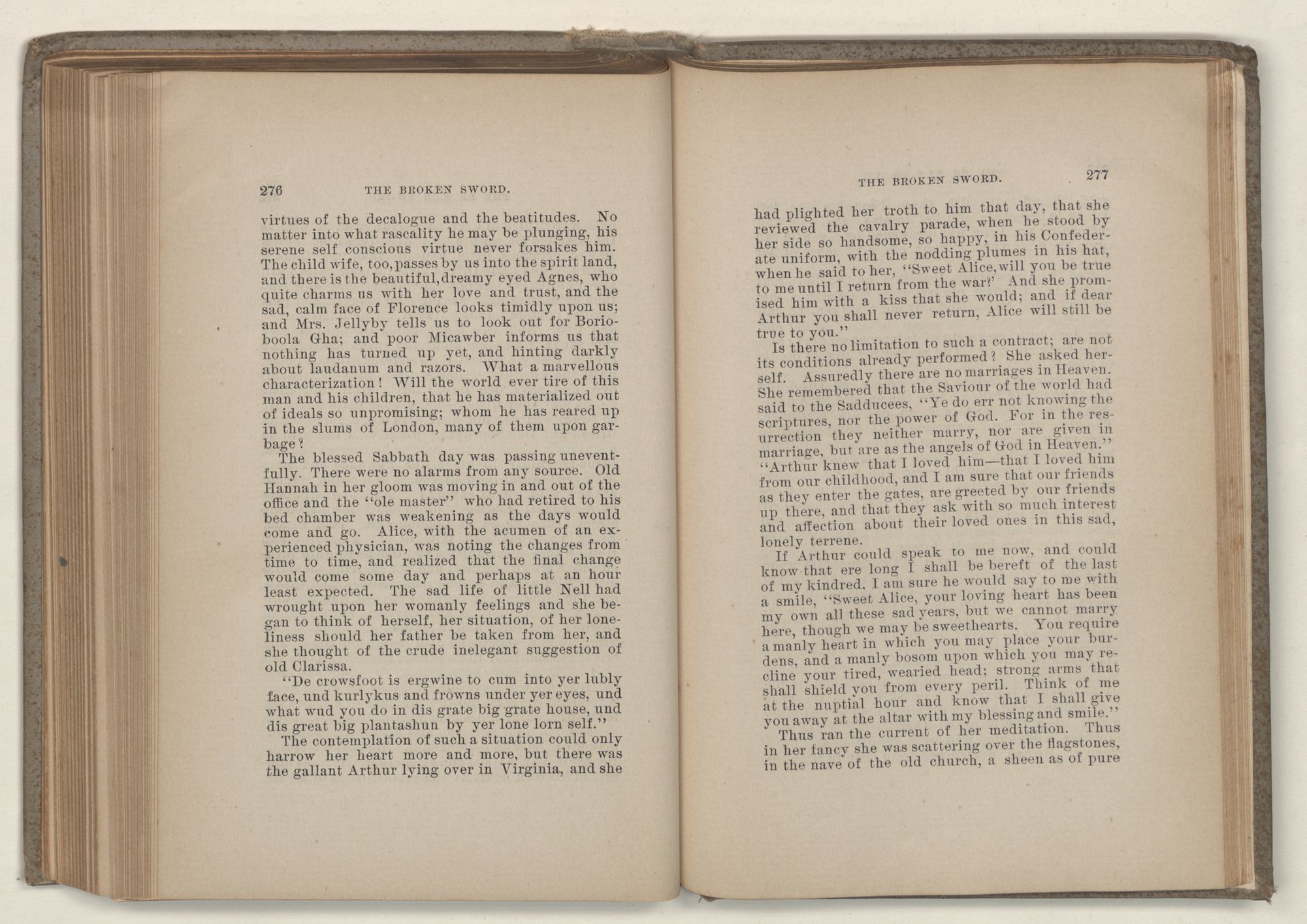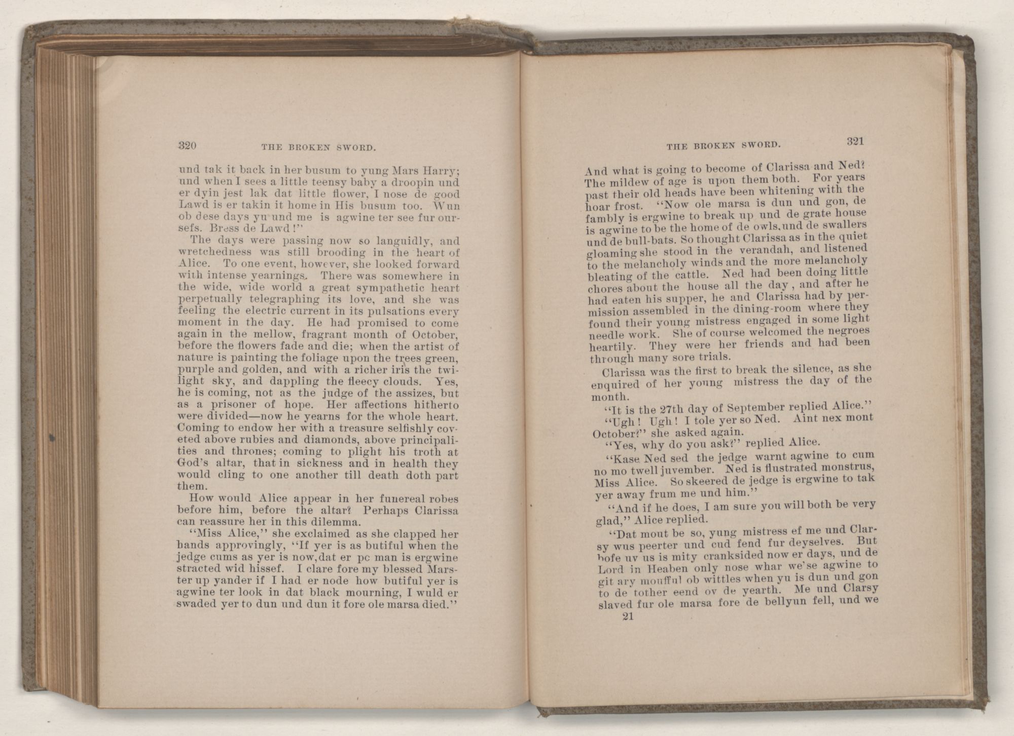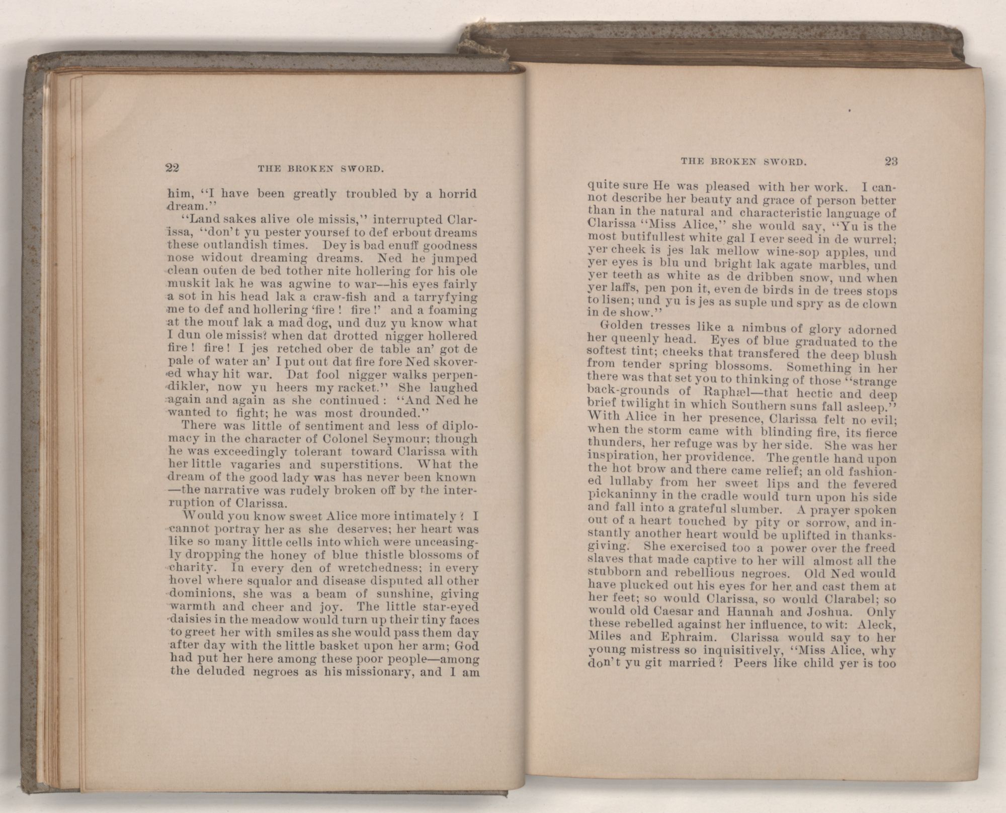 “Po Miss Alice, she do suffer mazin. Pears lak ebery now und den when her eyes gits bright und her face is sunny und sweet, und her lafter is lak de ripplin ob de little brook in de medder, dat de good Lord draps anudder drug in de cup und maks her drink ebery drap. Dere aint a gwine to be no mo sorrer for Miss Alice now; yung Mars Harry is gon, und missis is gon, und ole marser is gon, und