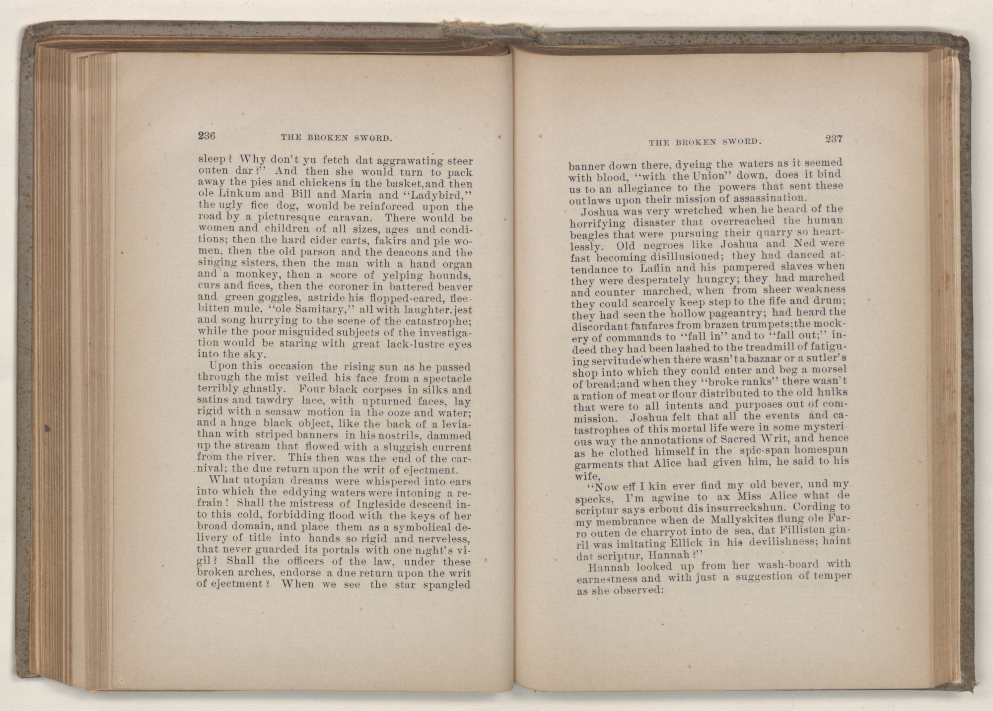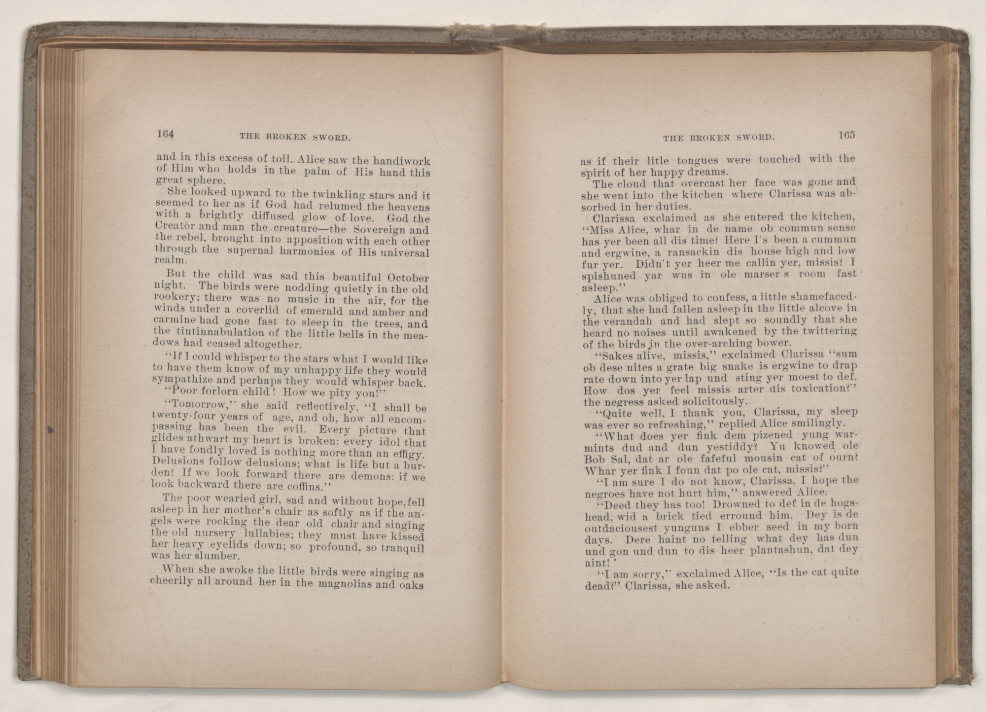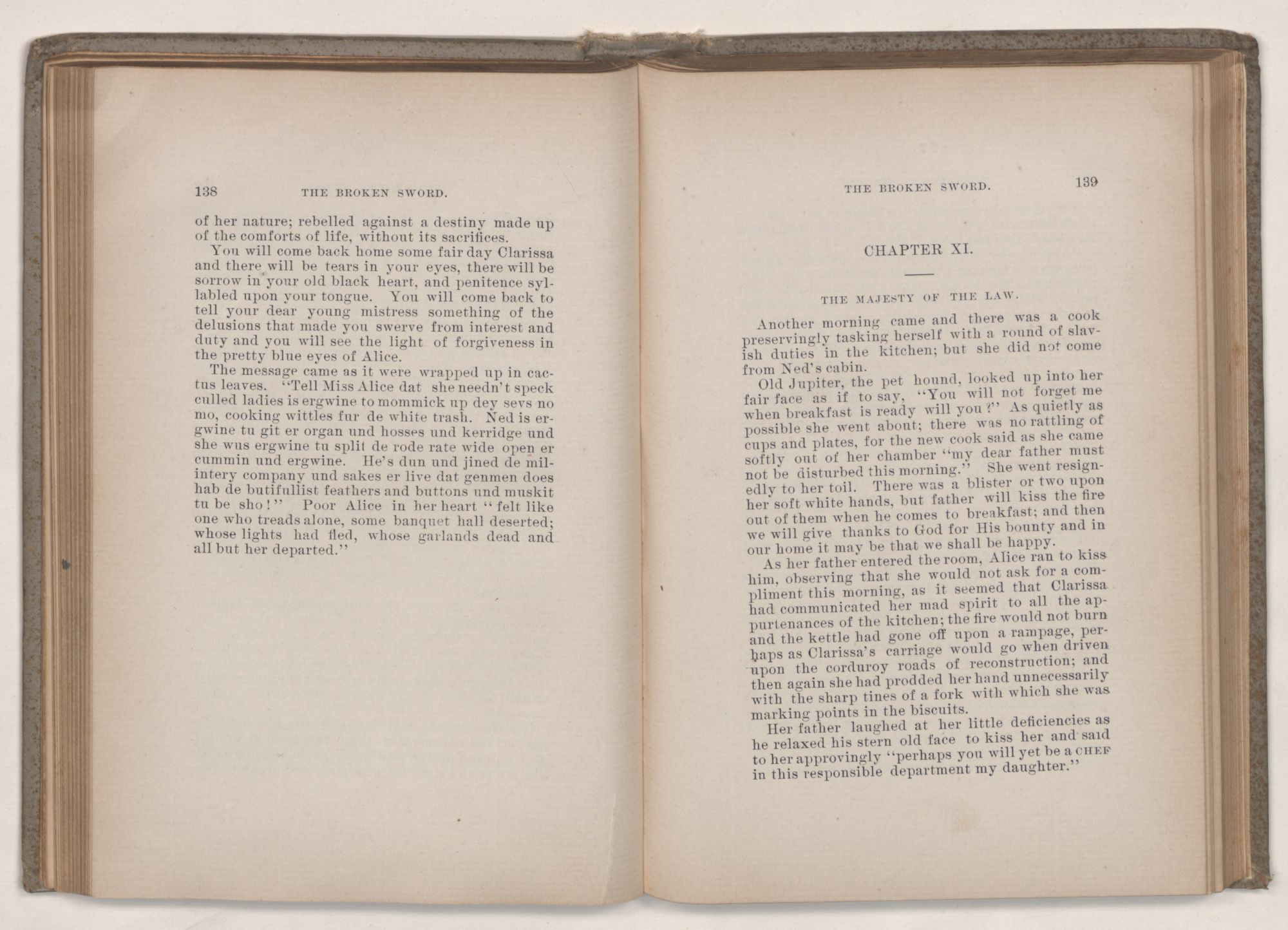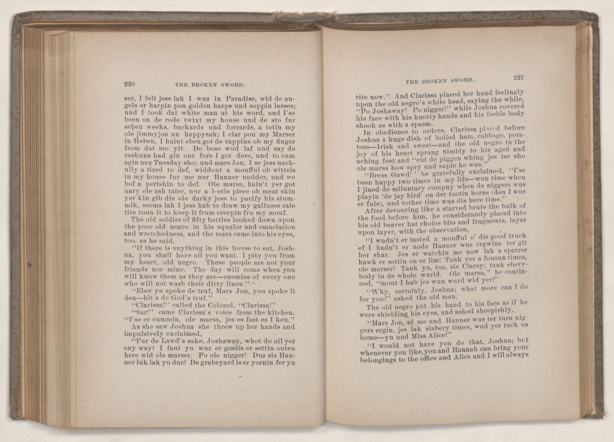 “Po Miss Alice, she do suffer mazin. Pears lak ebery now und den when her eyes gits bright und her face is sunny und sweet, und her lafter is lak de ripplin ob de little brook in de medder, dat de good Lord draps anudder drug in de cup und maks her drink ebery drap. Dere aint a gwine to be no mo sorrer for Miss Alice now; yung Mars Harry is gon, und missis is gon, und ole marser is gon, und