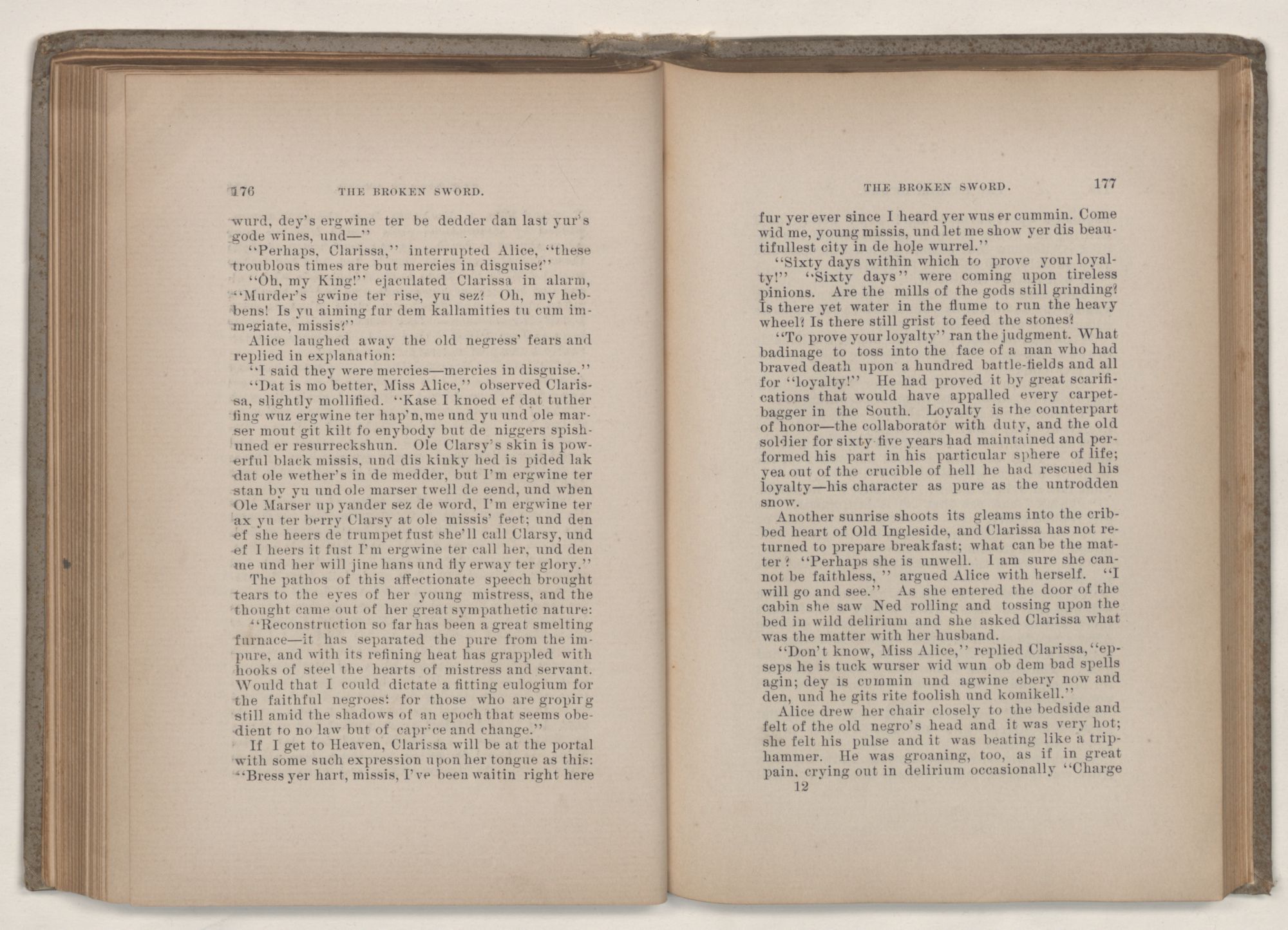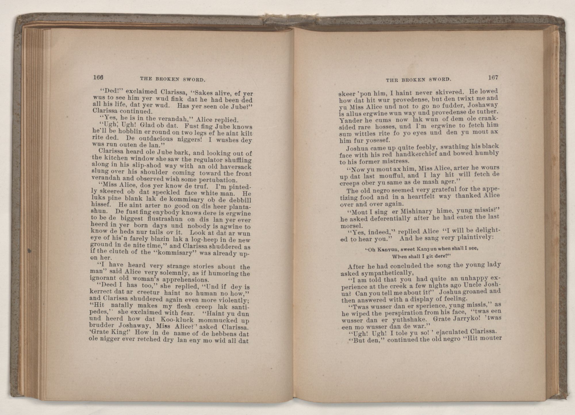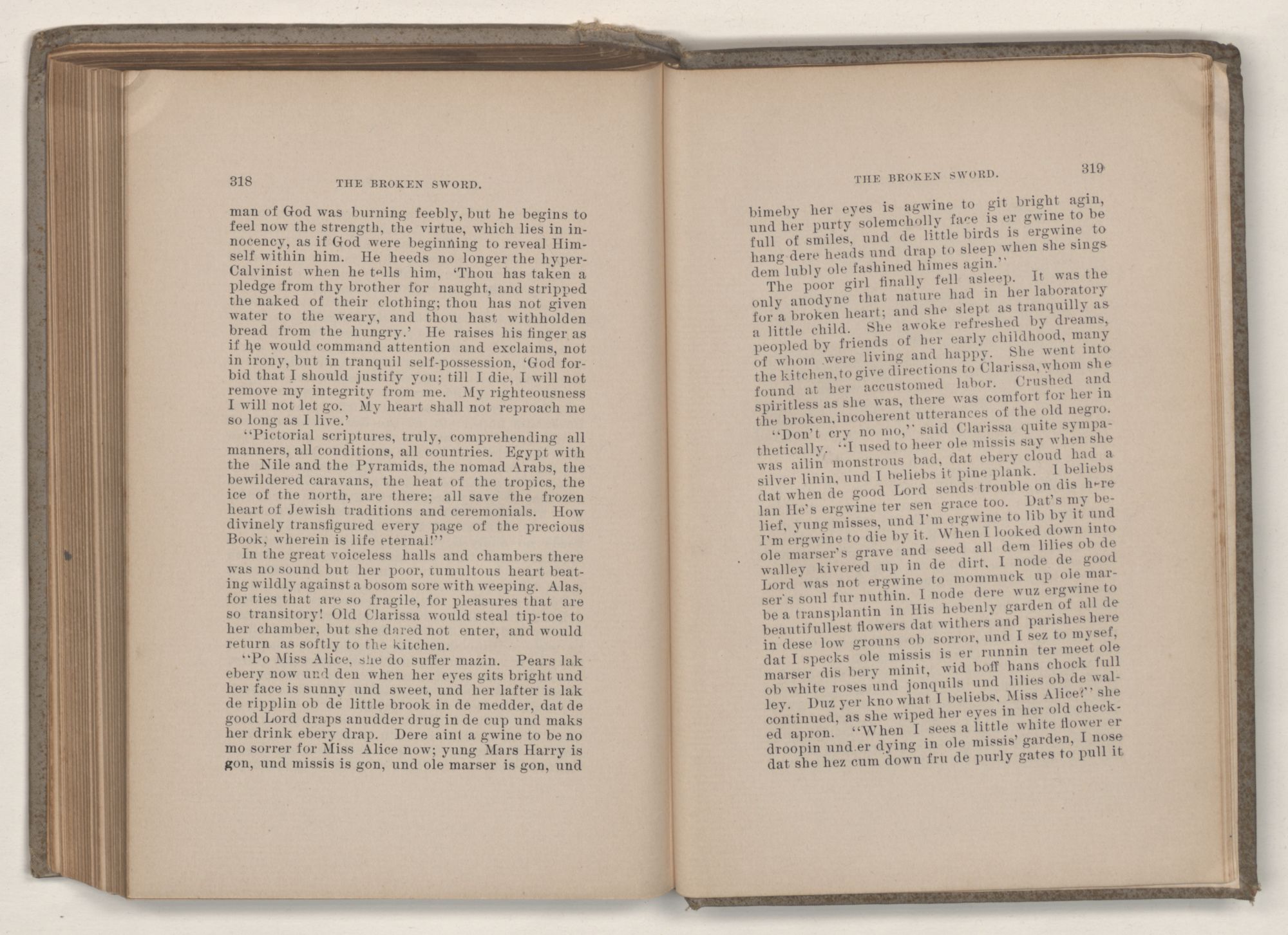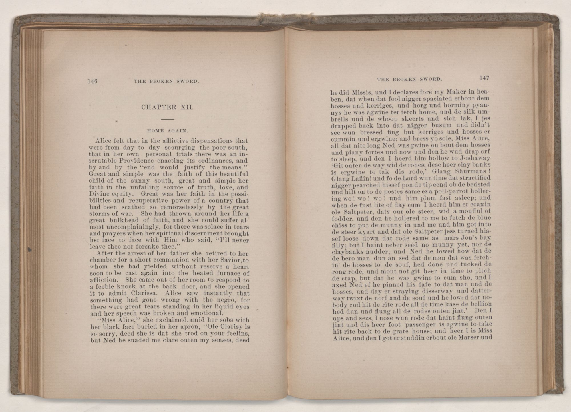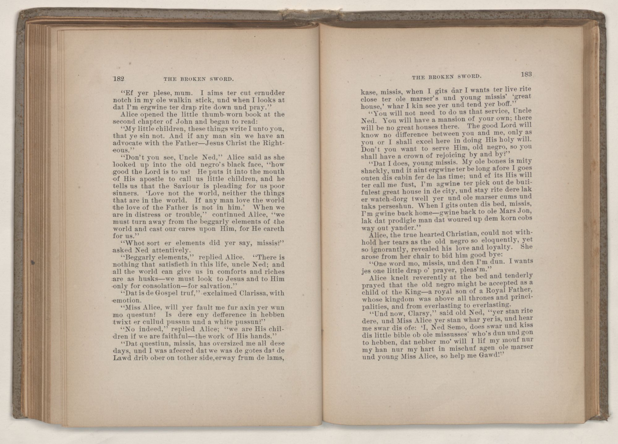 “Po Miss Alice, she do suffer mazin. Pears lak ebery now und den when her eyes gits bright und her face is sunny und sweet, und her lafter is lak de ripplin ob de little brook in de medder, dat de good Lord draps anudder drug in de cup und maks her drink ebery drap. Dere aint a gwine to be no mo sorrer for Miss Alice now; yung Mars Harry is gon, und missis is gon, und ole marser is gon, und