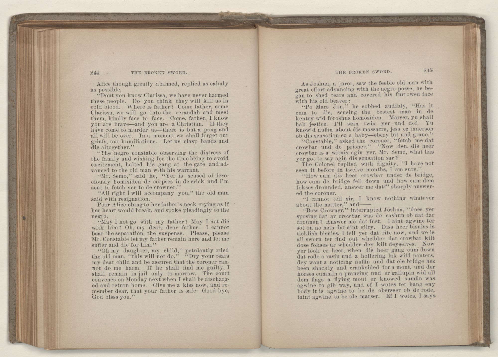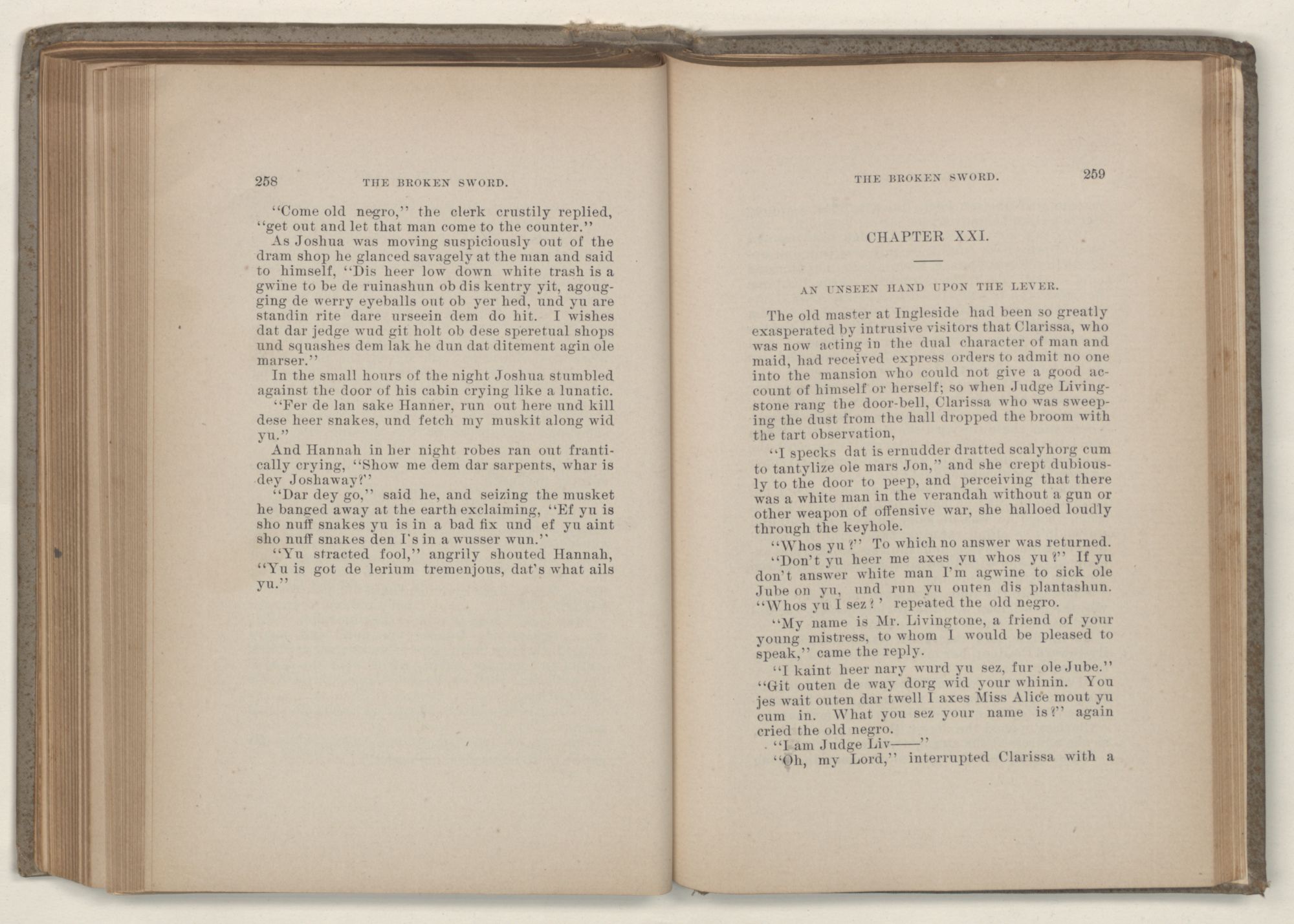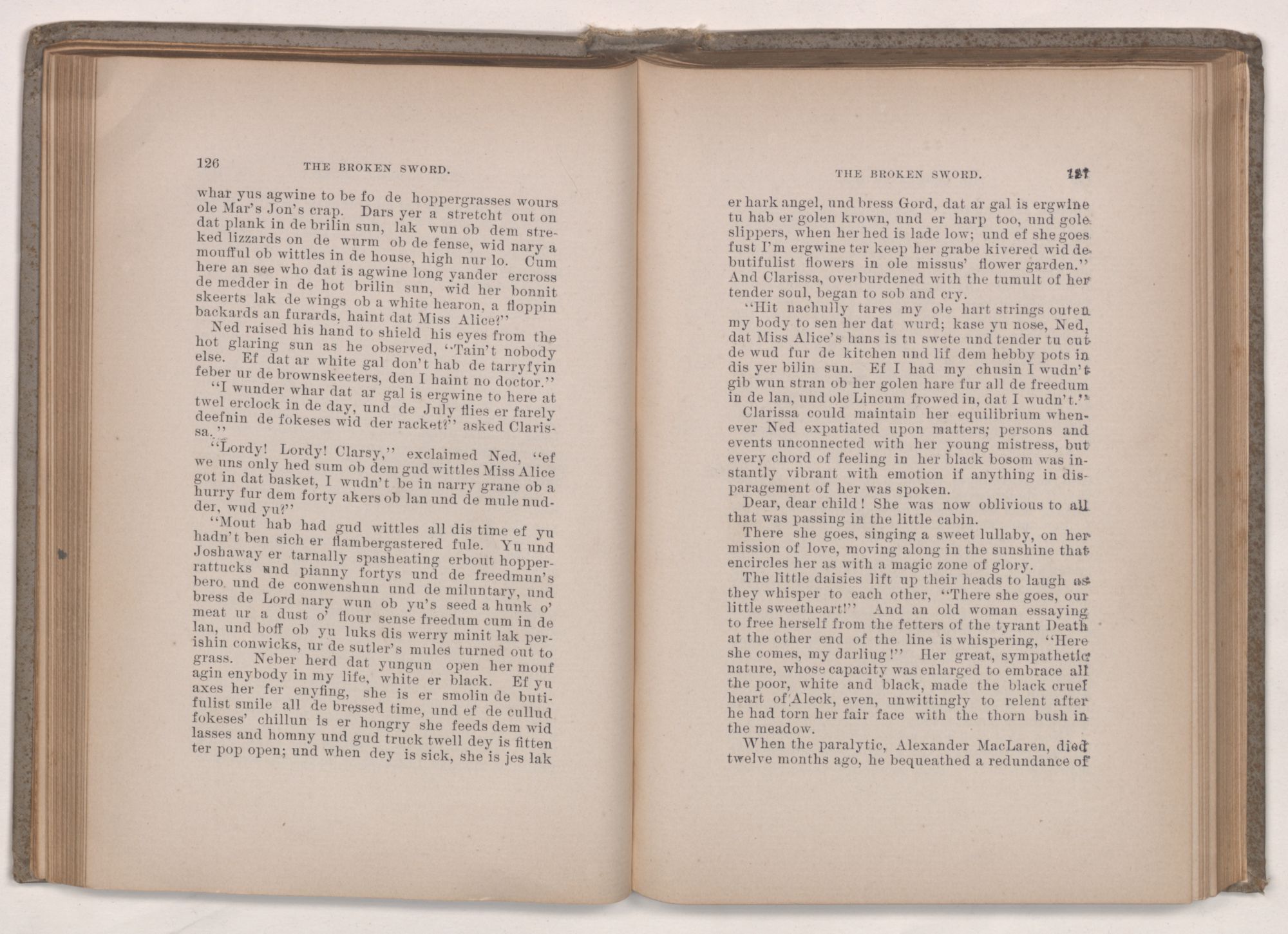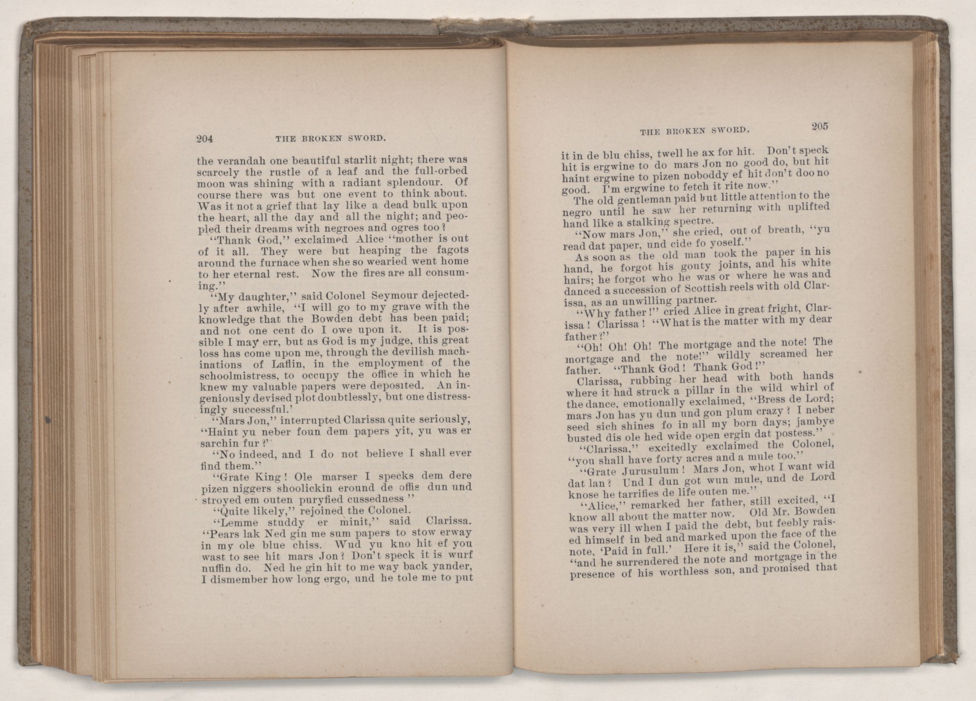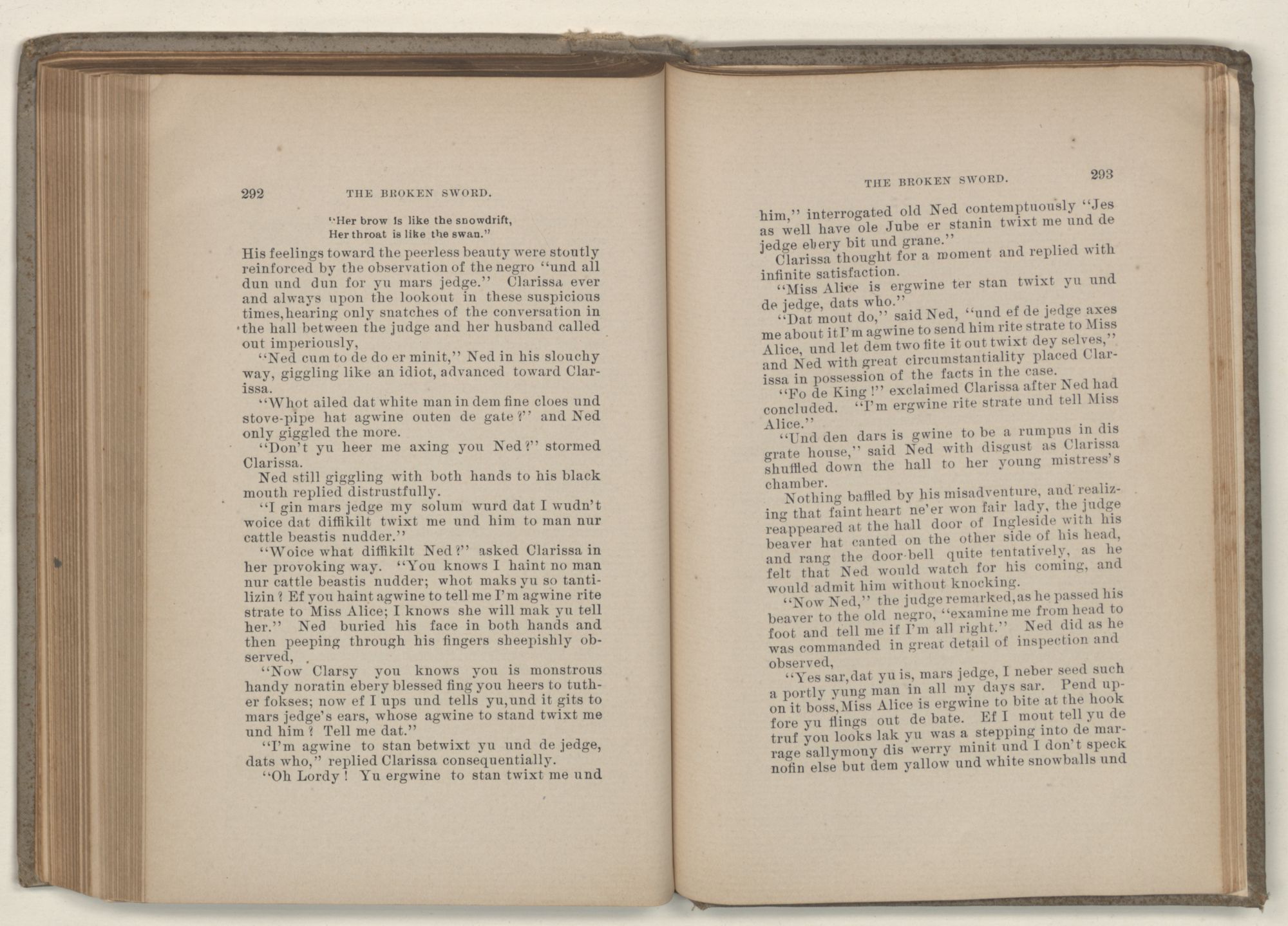 “Po Miss Alice, she do suffer mazin. Pears lak ebery now und den when her eyes gits bright und her face is sunny und sweet, und her lafter is lak de ripplin ob de little brook in de medder, dat de good Lord draps anudder drug in de cup und maks her drink ebery drap. Dere aint a gwine to be no mo sorrer for Miss Alice now; yung Mars Harry is gon, und missis is gon, und ole marser is gon, und