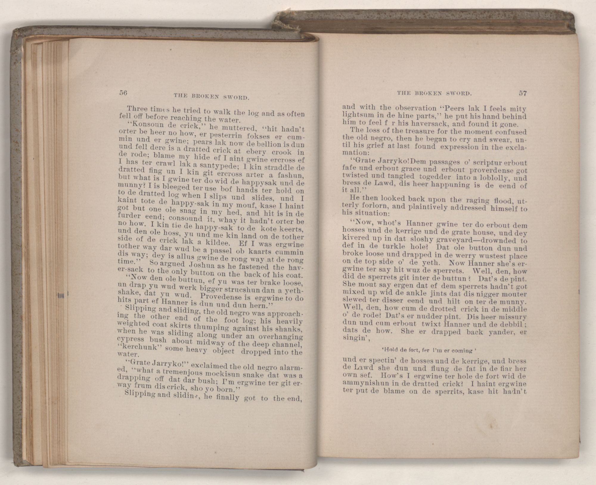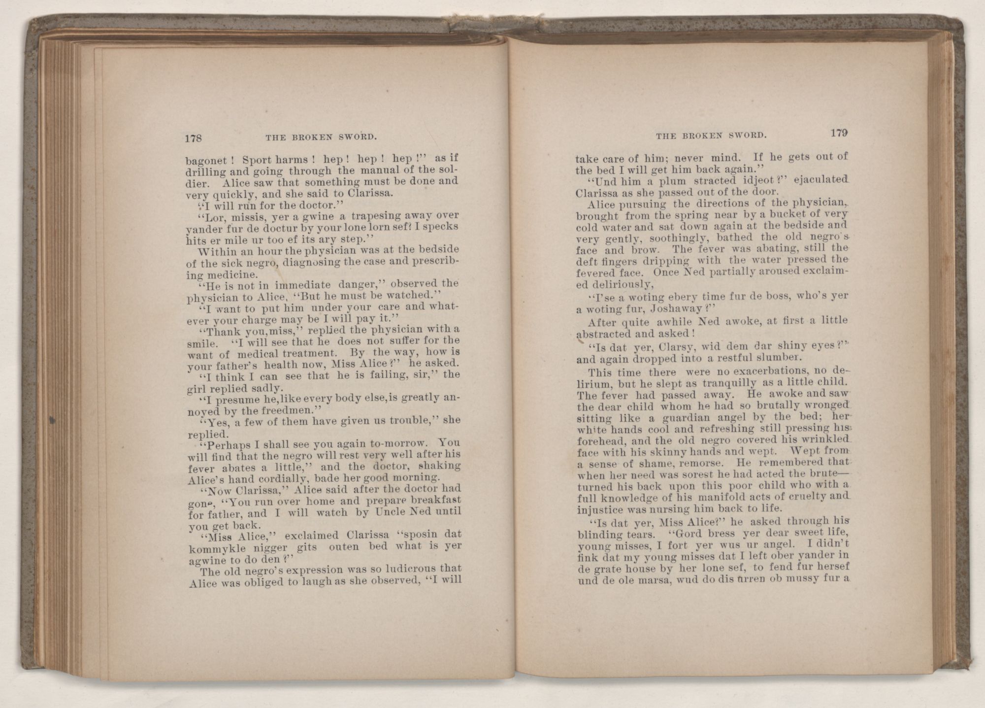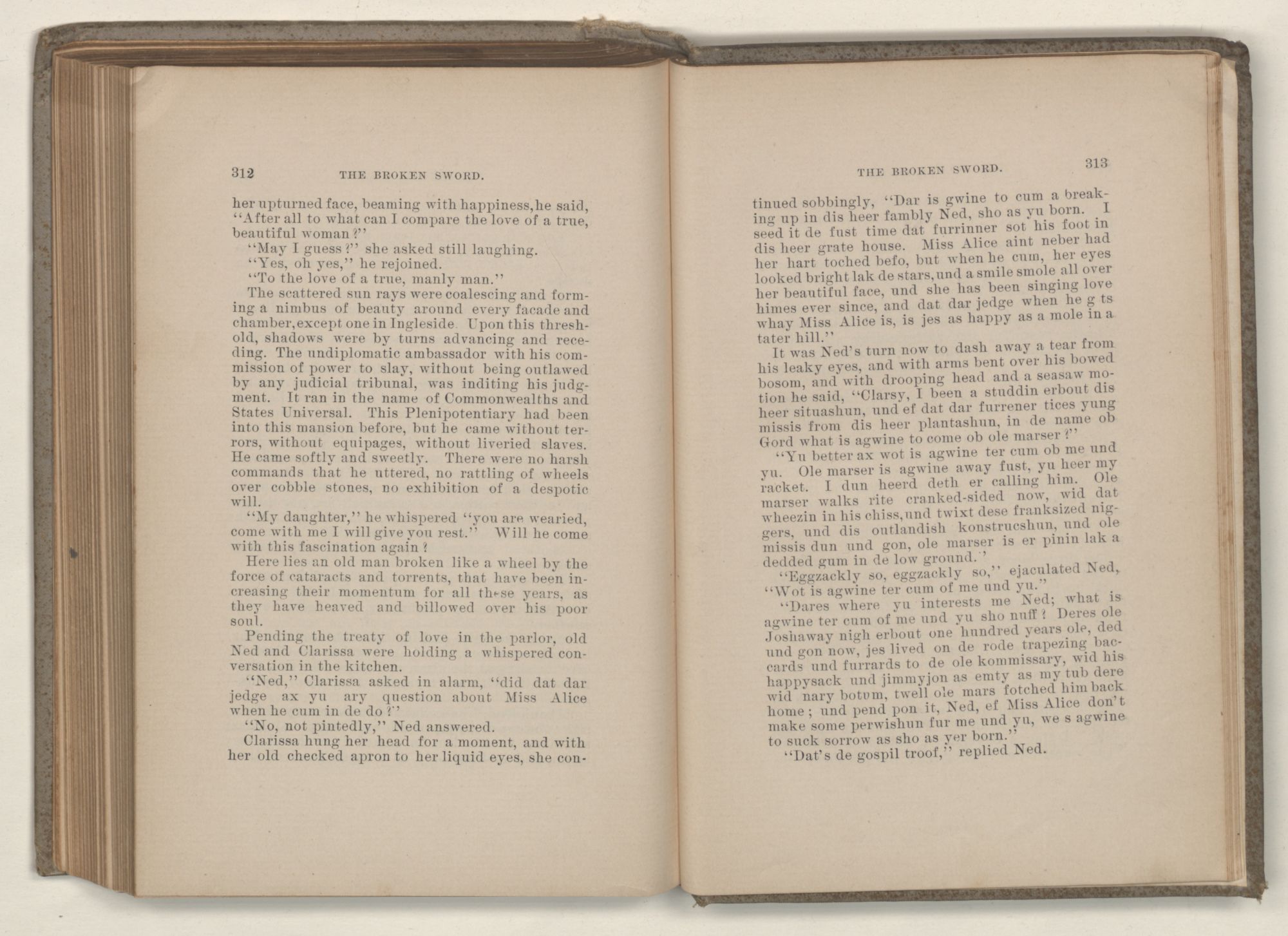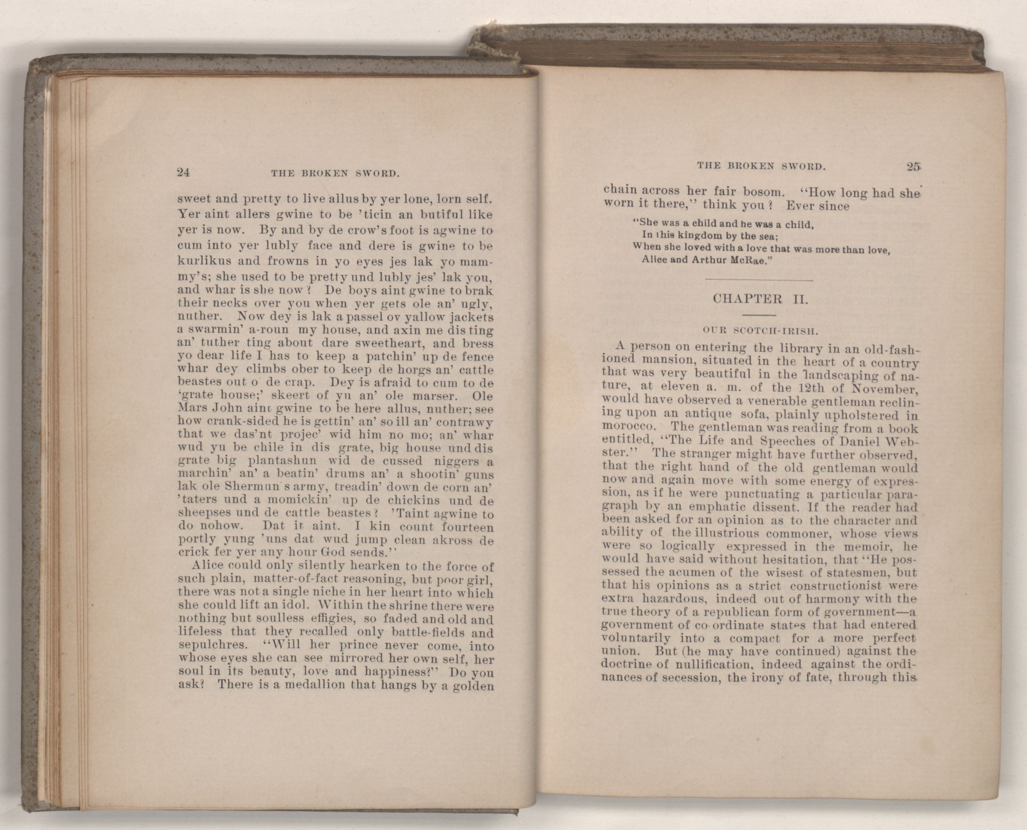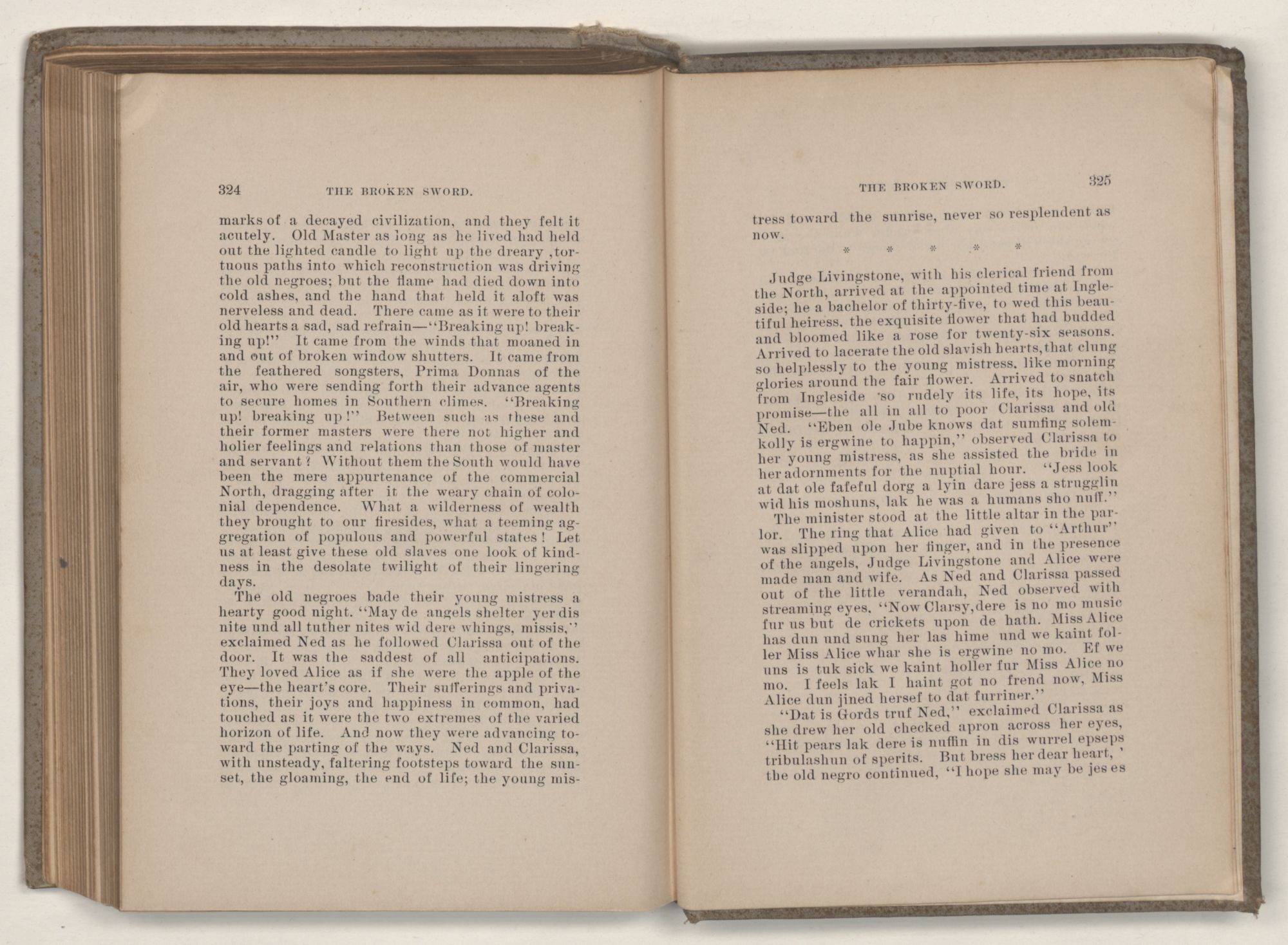 “Po Miss Alice, she do suffer mazin. Pears lak ebery now und den when her eyes gits bright und her face is sunny und sweet, und her lafter is lak de ripplin ob de little brook in de medder, dat de good Lord draps anudder drug in de cup und maks her drink ebery drap. Dere aint a gwine to be no mo sorrer for Miss Alice now; yung Mars Harry is gon, und missis is gon, und ole marser is gon, und