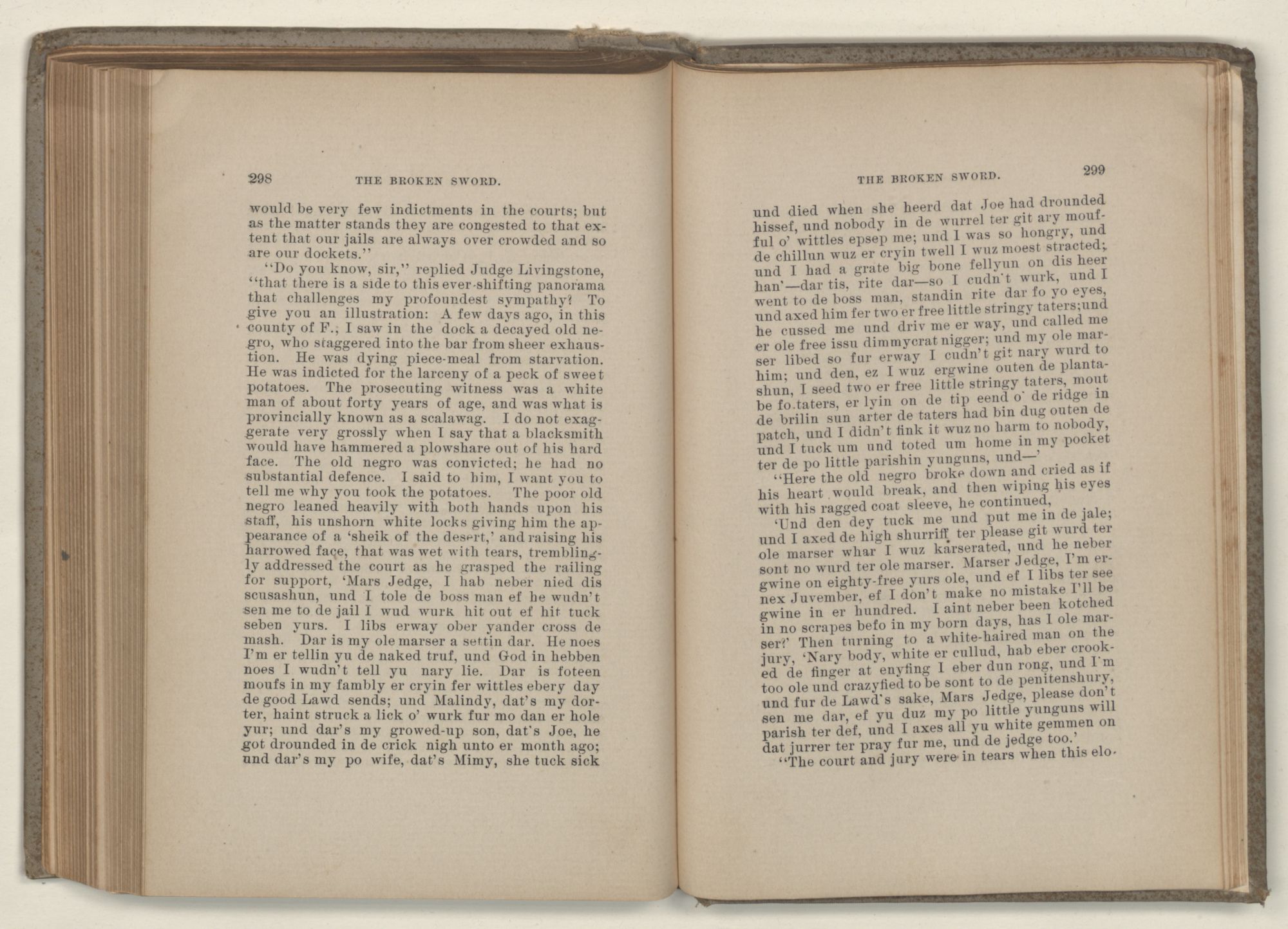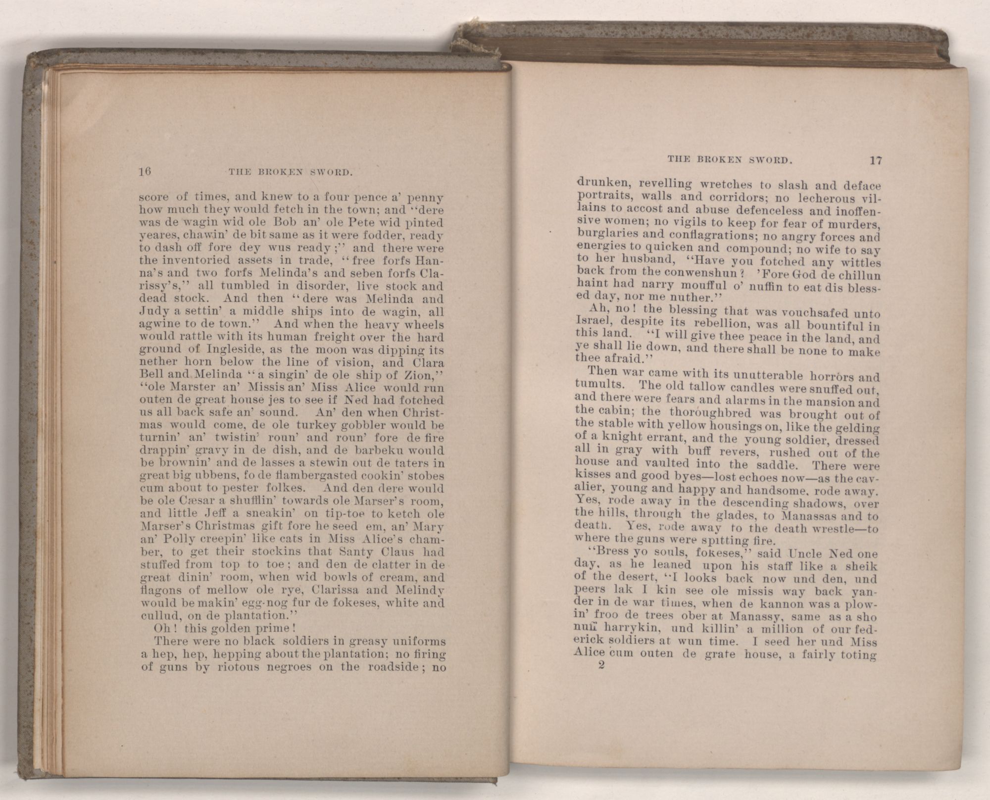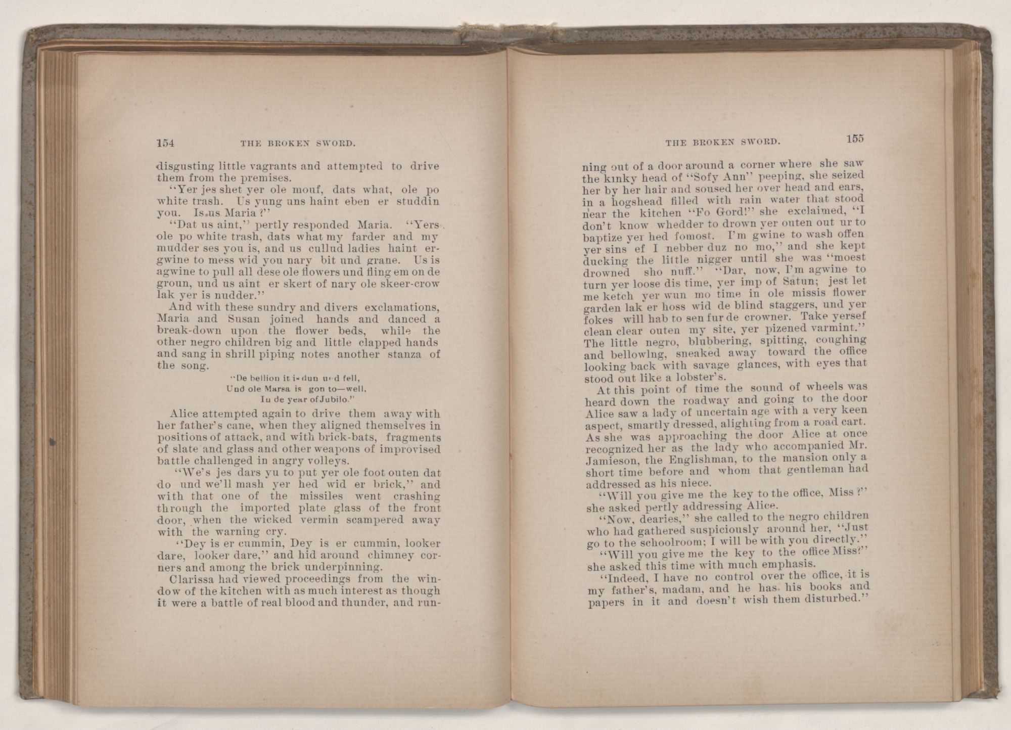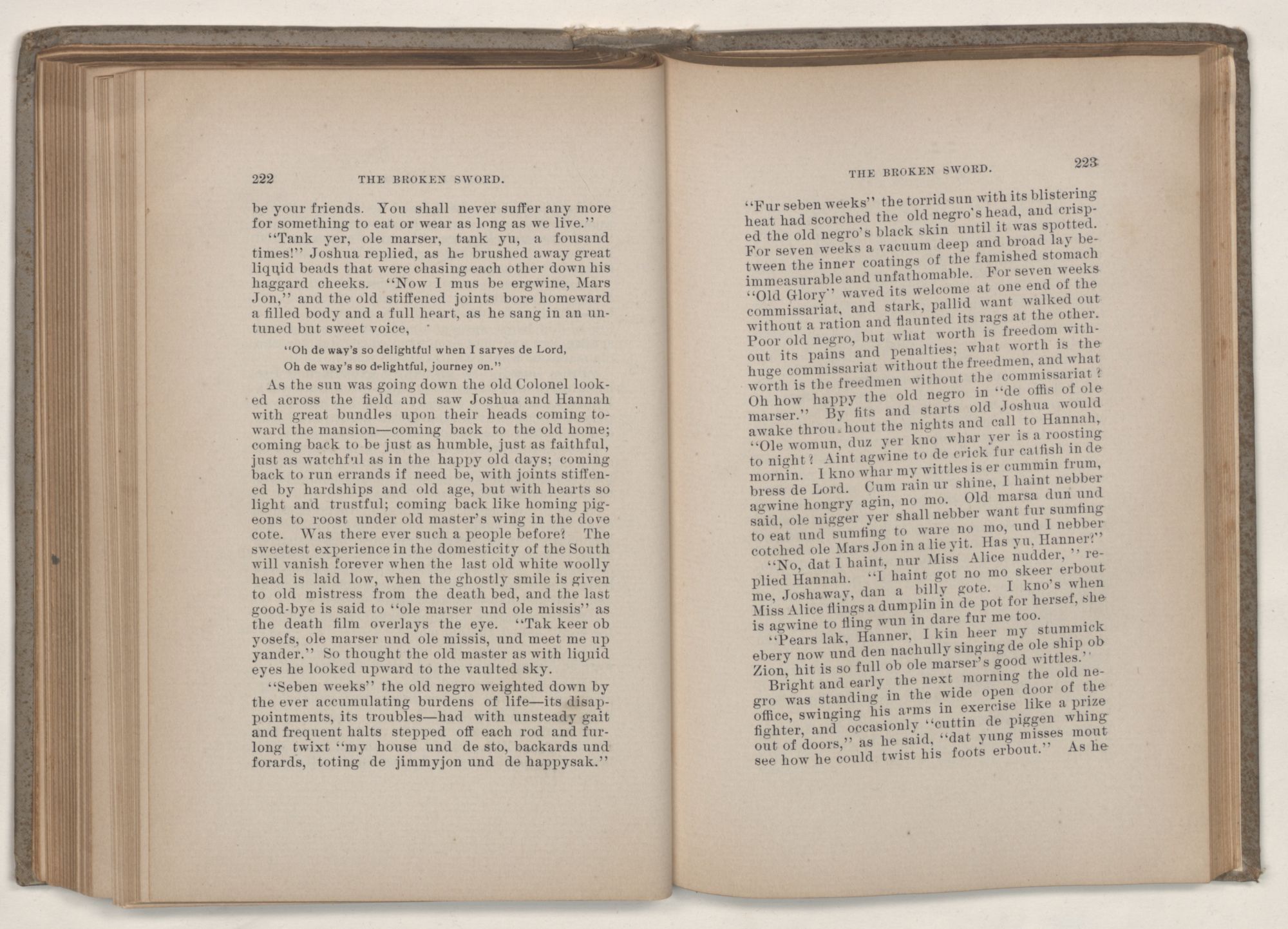 “Po Miss Alice, she do suffer mazin. Pears lak ebery now und den when her eyes gits bright und her face is sunny und sweet, und her lafter is lak de ripplin ob de little brook in de medder, dat de good Lord draps anudder drug in de cup und maks her drink ebery drap. Dere aint a gwine to be no mo sorrer for Miss Alice now; yung Mars Harry is gon, und missis is gon, und ole marser is gon, und