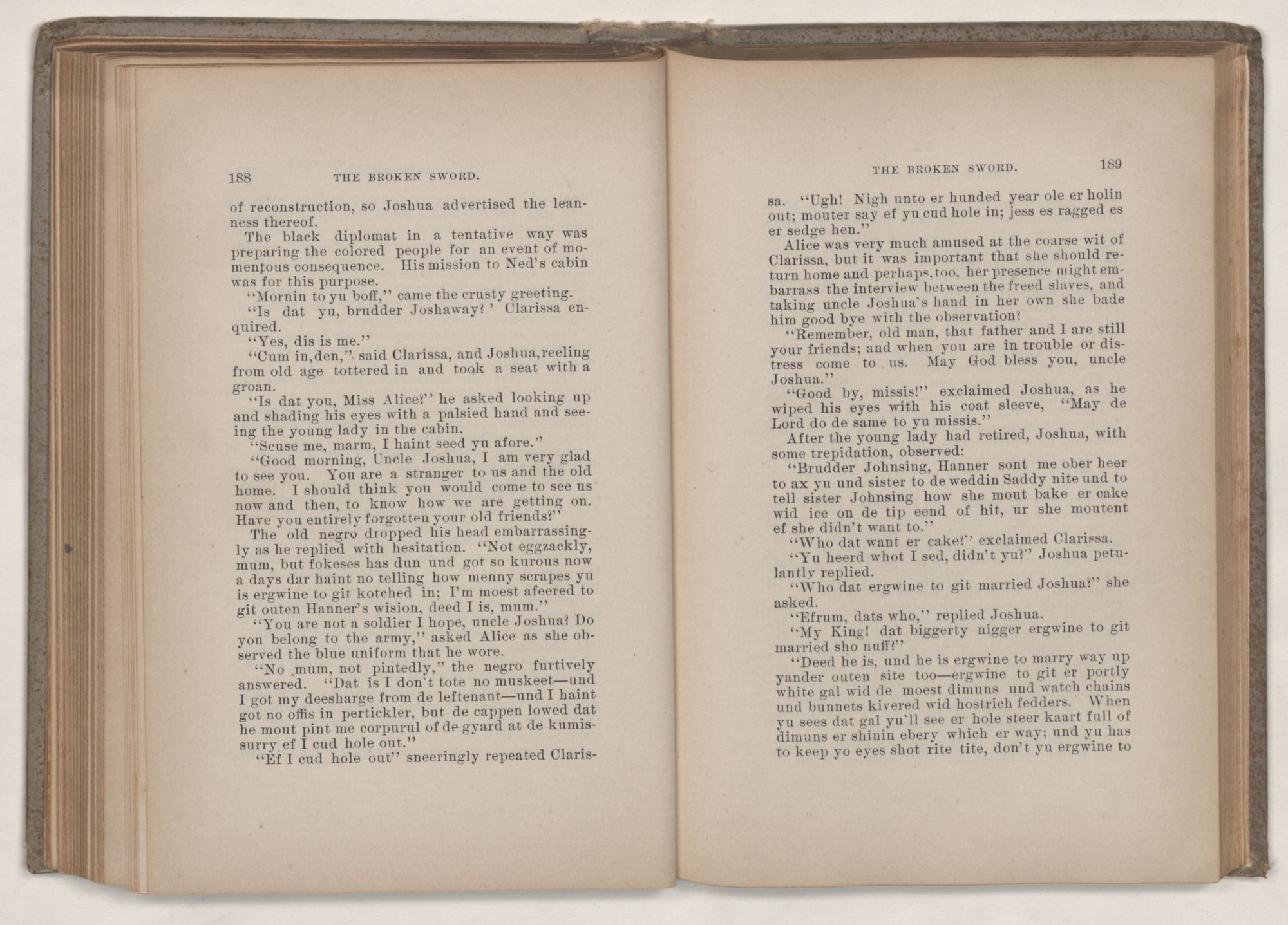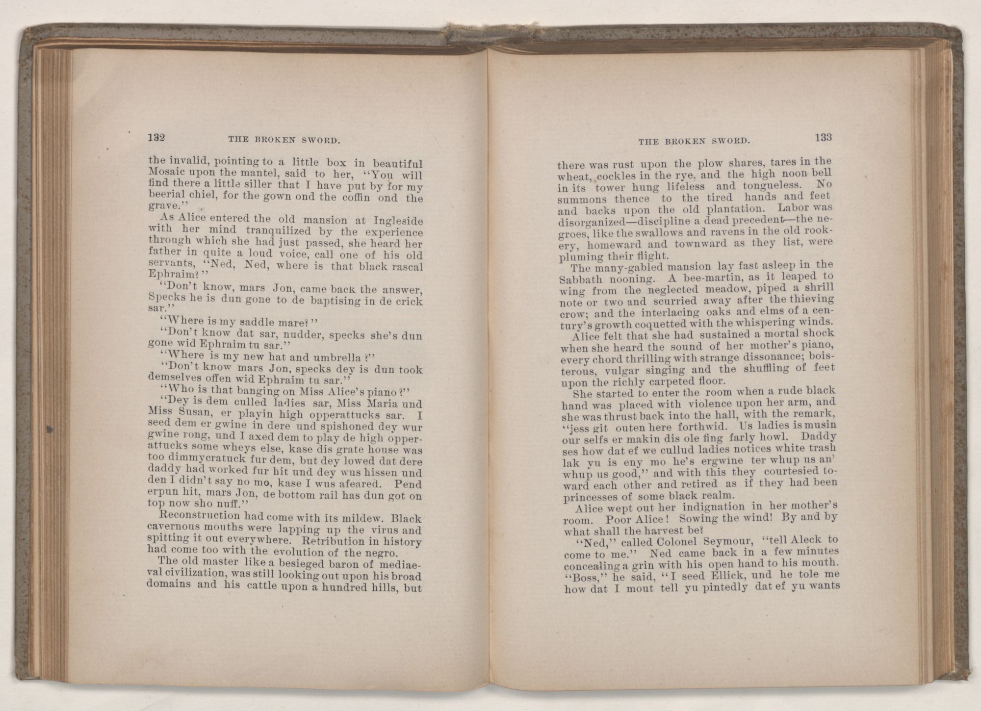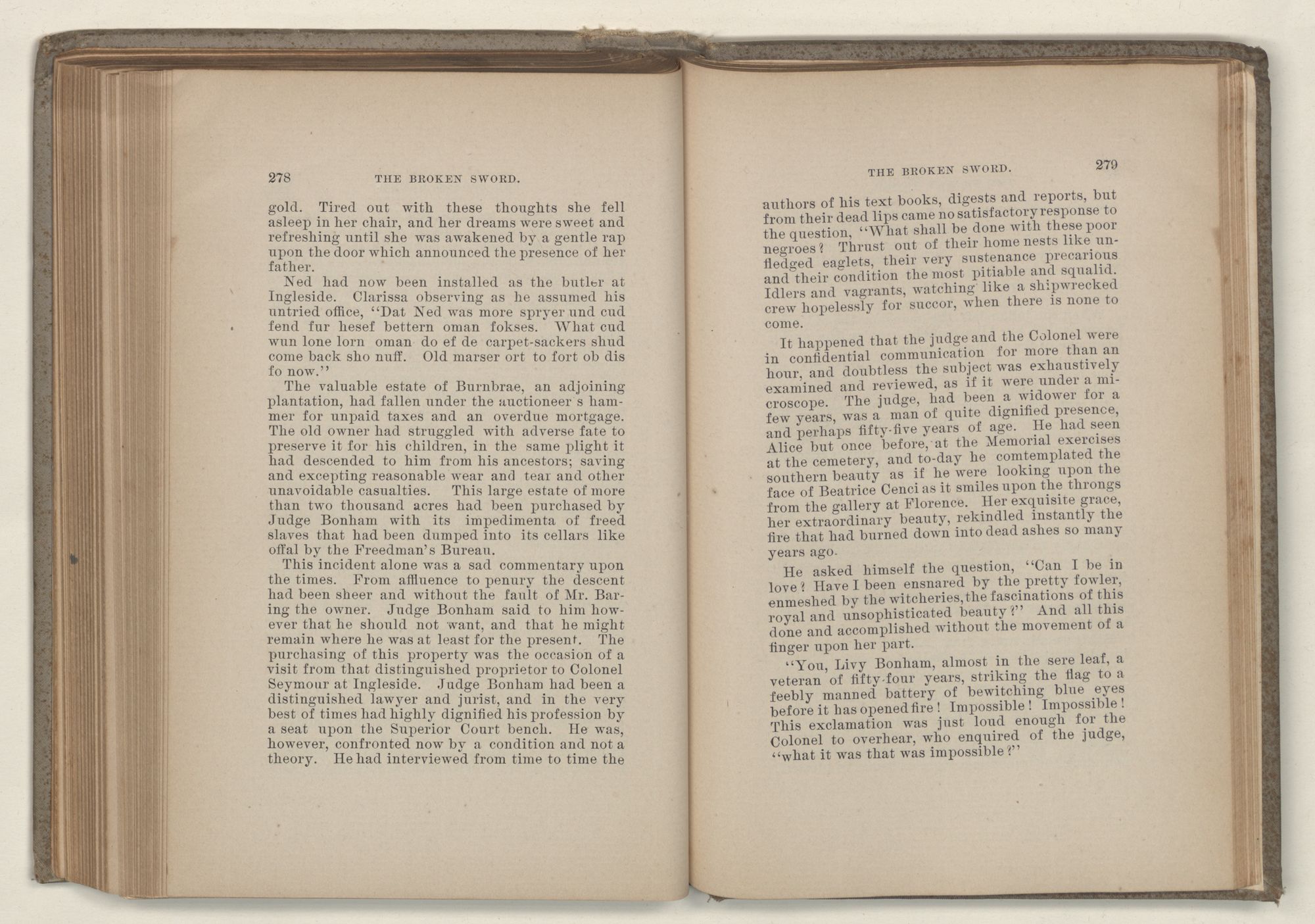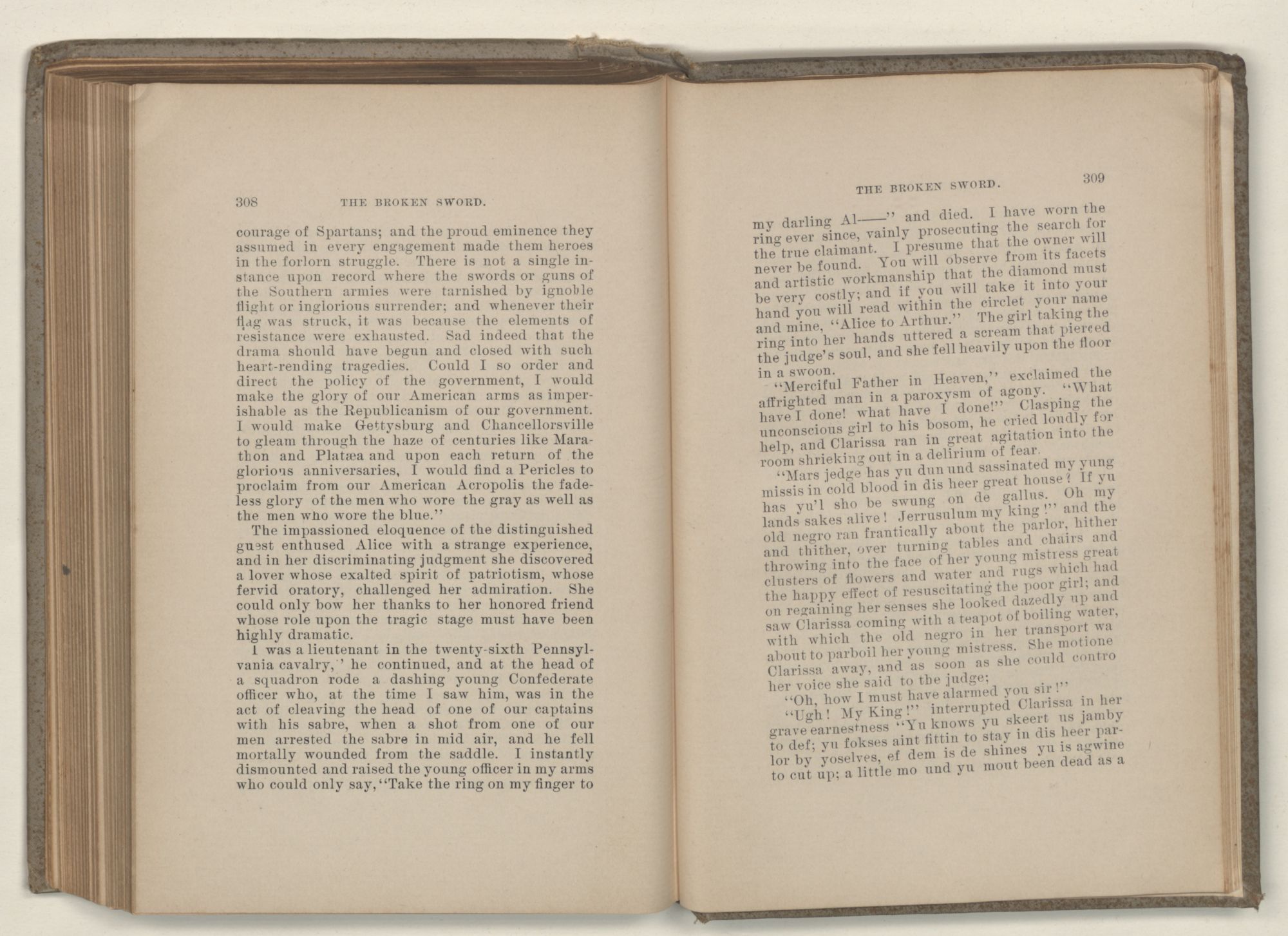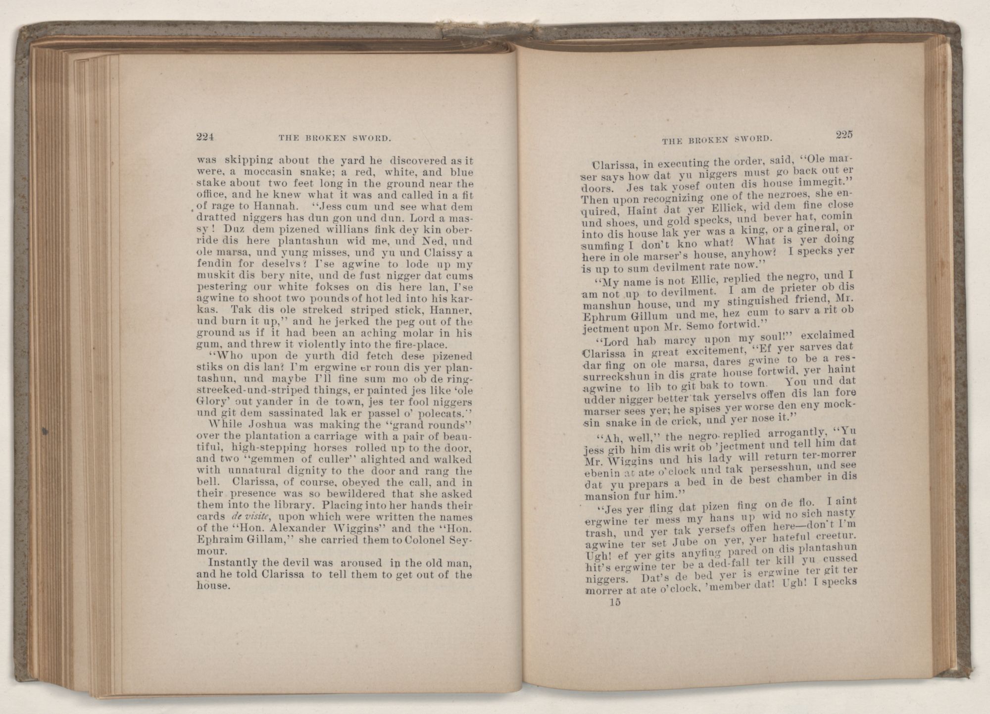 “Po Miss Alice, she do suffer mazin. Pears lak ebery now und den when her eyes gits bright und her face is sunny und sweet, und her lafter is lak de ripplin ob de little brook in de medder, dat de good Lord draps anudder drug in de cup und maks her drink ebery drap. Dere aint a gwine to be no mo sorrer for Miss Alice now; yung Mars Harry is gon, und missis is gon, und ole marser is gon, und