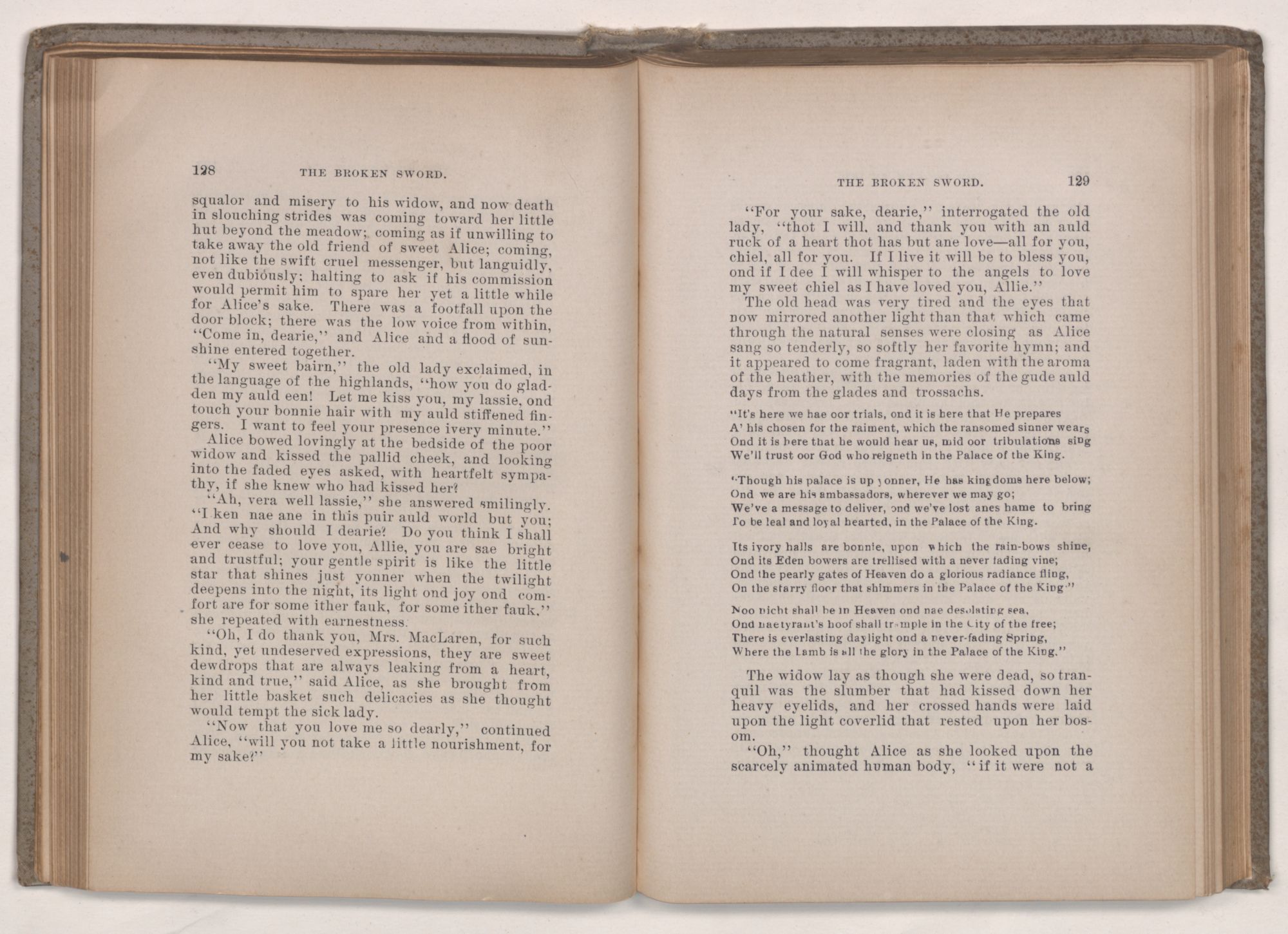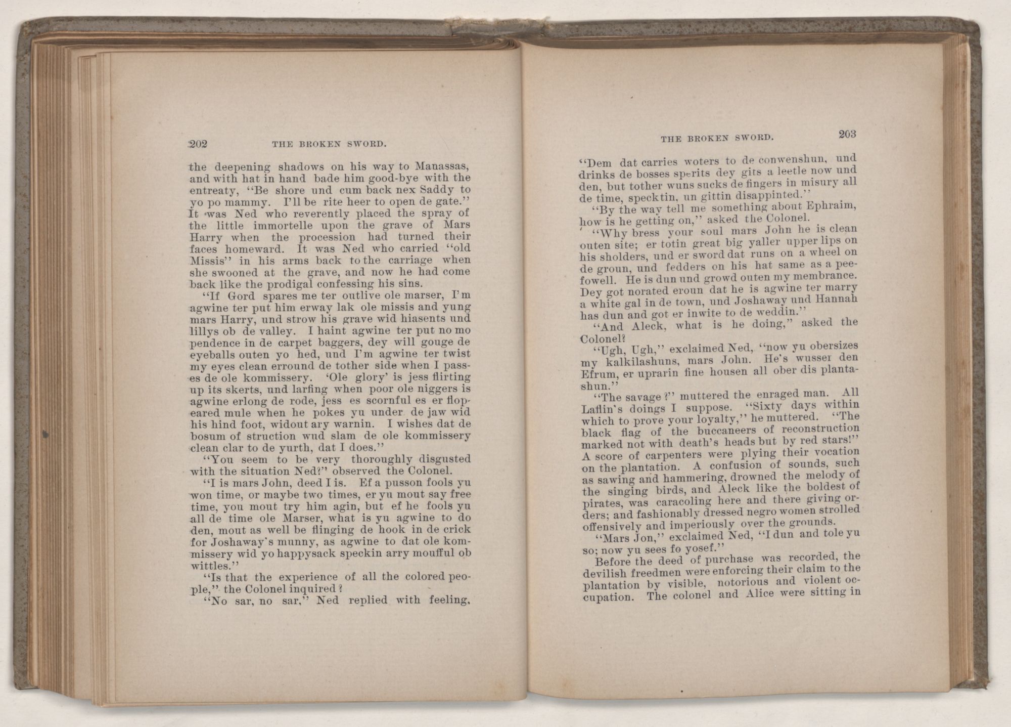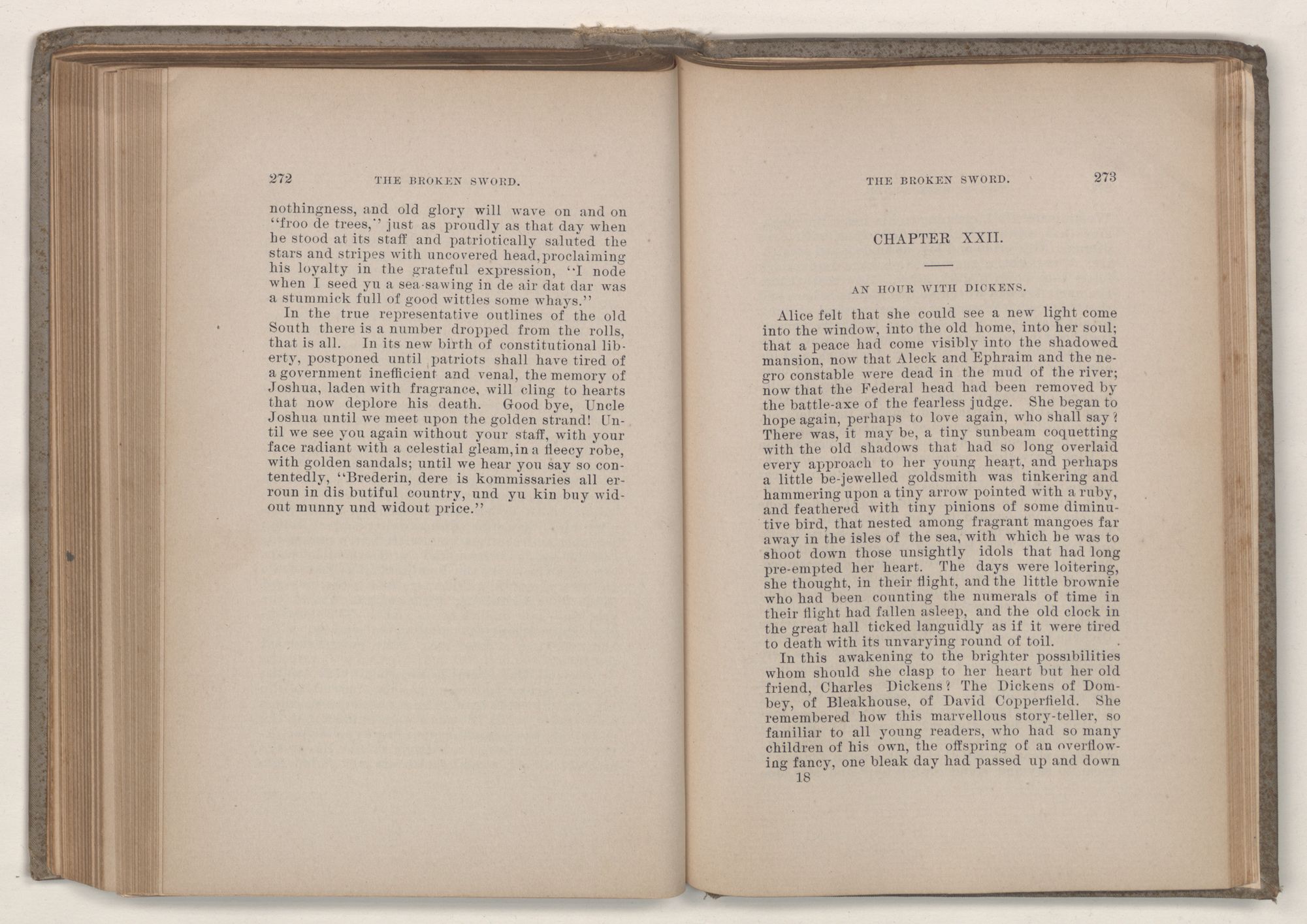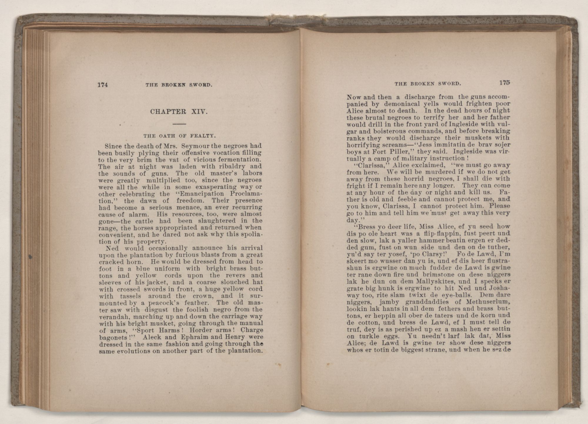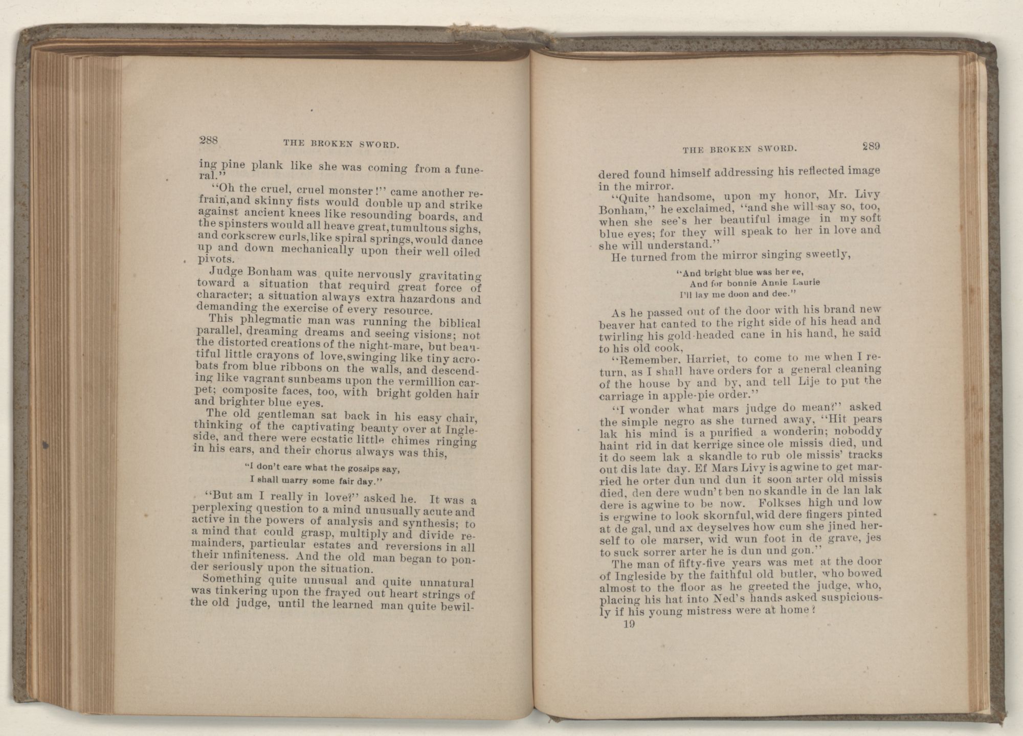 “Po Miss Alice, she do suffer mazin. Pears lak ebery now und den when her eyes gits bright und her face is sunny und sweet, und her lafter is lak de ripplin ob de little brook in de medder, dat de good Lord draps anudder drug in de cup und maks her drink ebery drap. Dere aint a gwine to be no mo sorrer for Miss Alice now; yung Mars Harry is gon, und missis is gon, und ole marser is gon, und