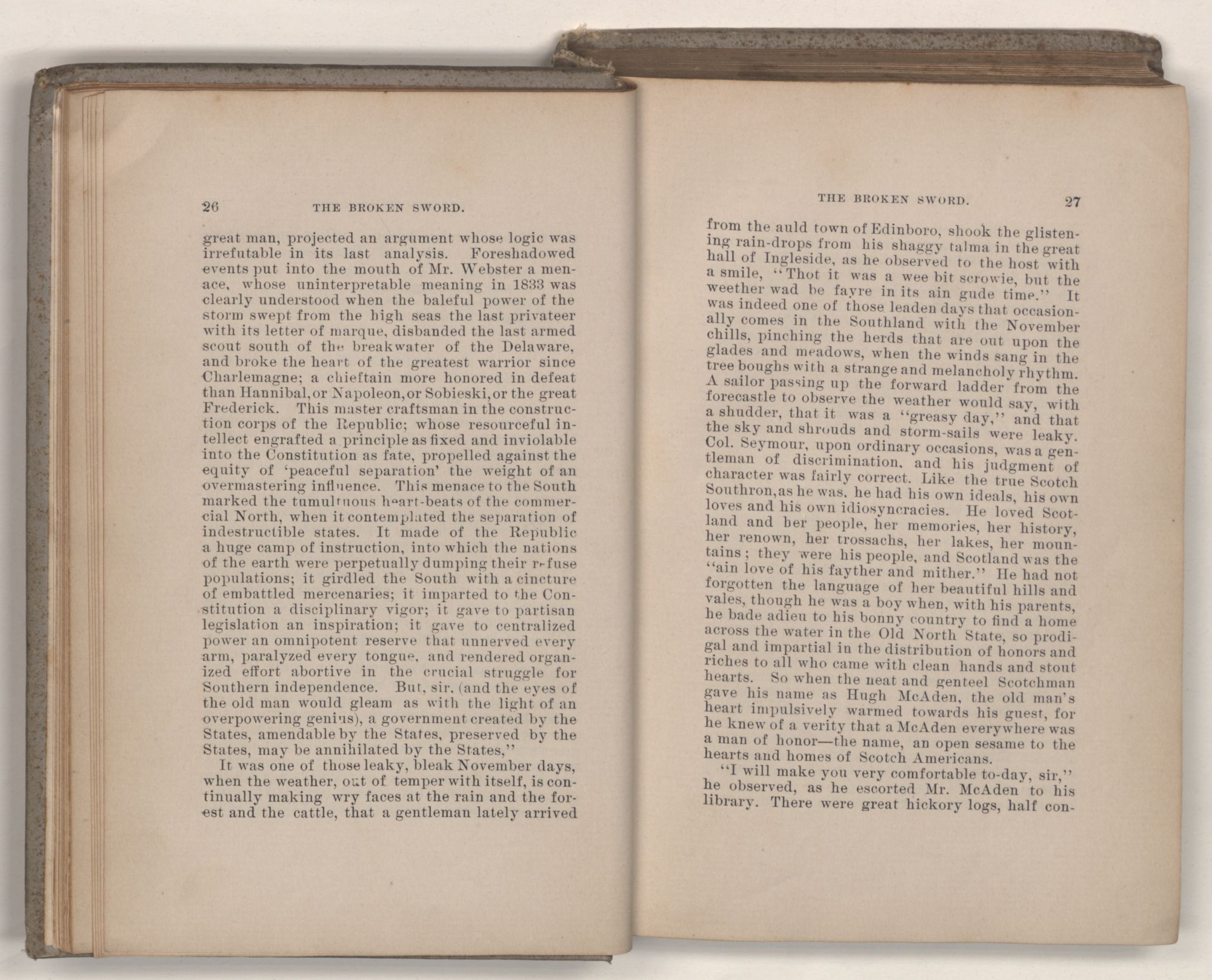 “She was a child and he was a child,In this kingdom by the sea;When she loved with a love that was more than love,Alice and Arthur McRae.”CHAPTER II. OUR SCOTCH-IRISH.A person on entering the library in an old-fashioned mansion, situated in the heart of a country that was very beautiful in the landscaping of nature, at eleven a. m. of the 12th of November, would have observed a venerable gentleman reclining upon an antique sofa, plainly upholstered in morocco. The gentleman was reading from a book entitled, “The Life and Speeches of Daniel Webster.” The stranger might have further observed, that the right hand of the old gentleman would now and again move with some energy of expression, as if he were punctuating a particular paragraph by an emphatic dissent. If the reader had been asked for an opinion as to the character and ability of the illustrious commoner, whose views were so logically expressed in the memoir, he would have said without hesitation, that “He possessed the acumen of the wisest of statesmen, but that his opinions as a strict constructionist were extra hazardous, indeed out of harmony with the true theory of a republican form of government—a government of co-ordinate states that had entered voluntarily into a compact for a more perfect union. But (he may have continued) against the doctrine of nullification, indeed against the ordinances of secession, the irony of fate, through this