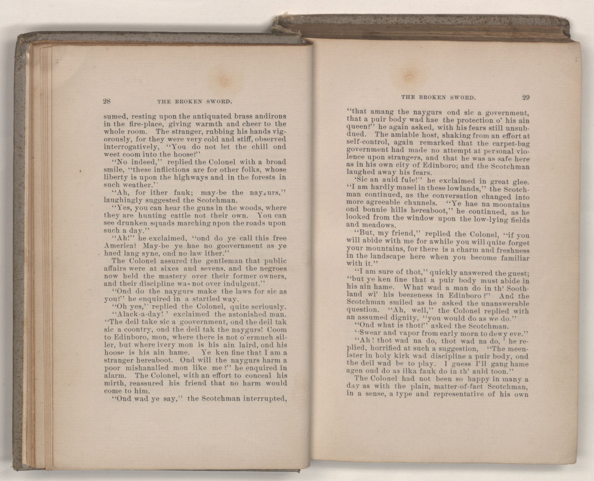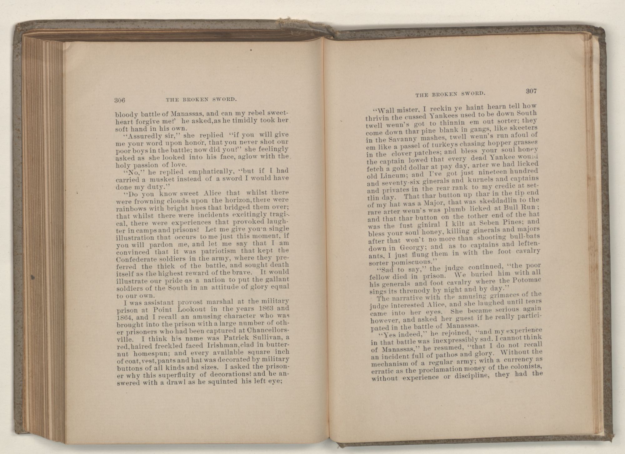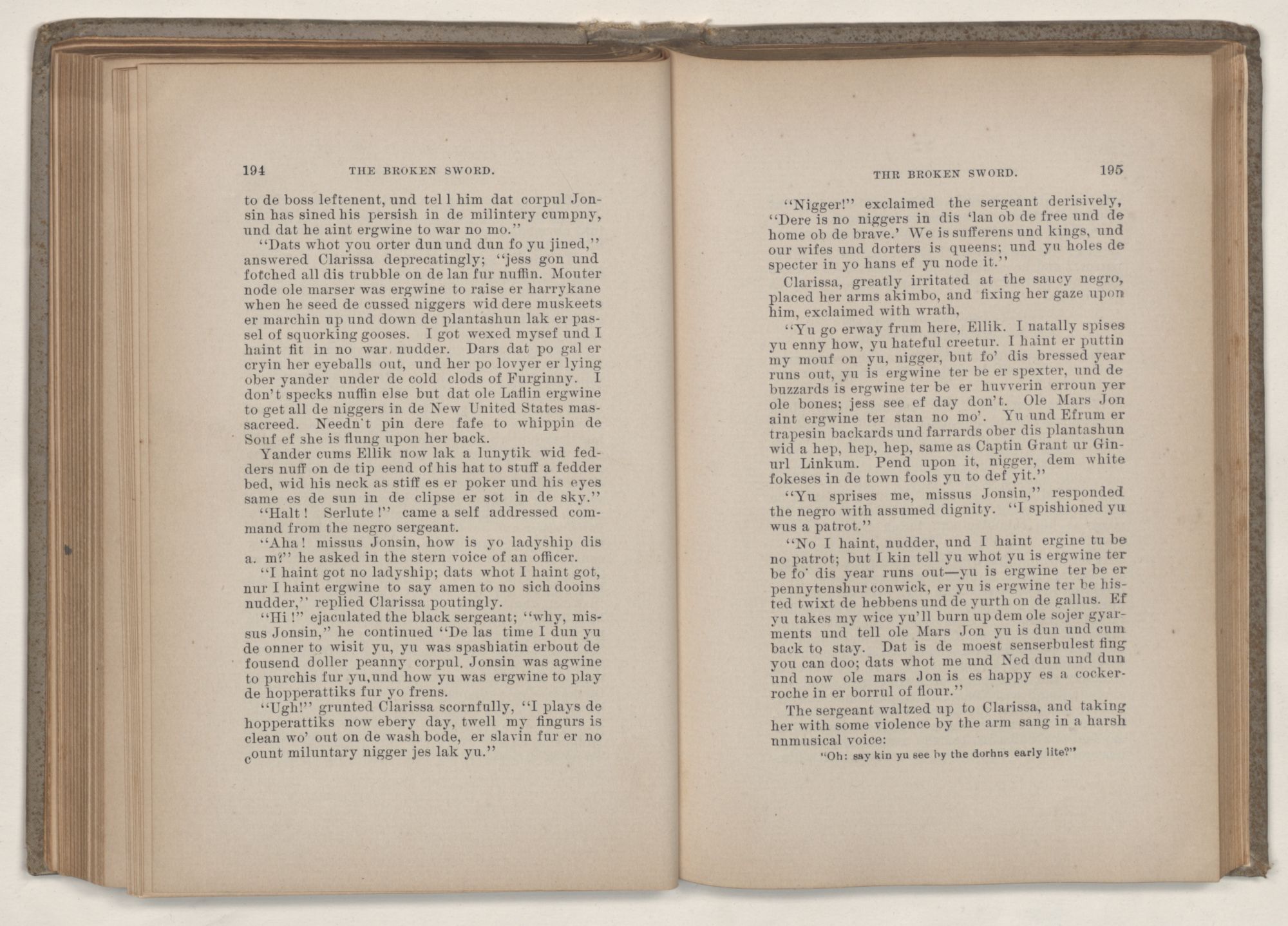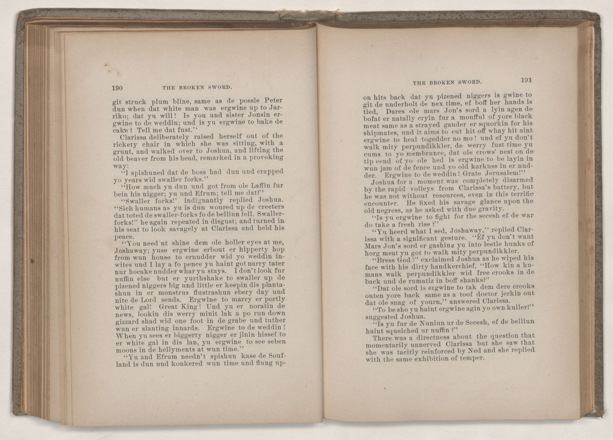 Ned shuffled back to Clarissa with his old bandana to his eyes with the observation “Taint wuff while to pester yosef er sobbing und er sighing no mo Clarsy, I dun und seed de margige sealed und livered. I heerd the nupshall wows sploding same as er passel of poppercrackers.”