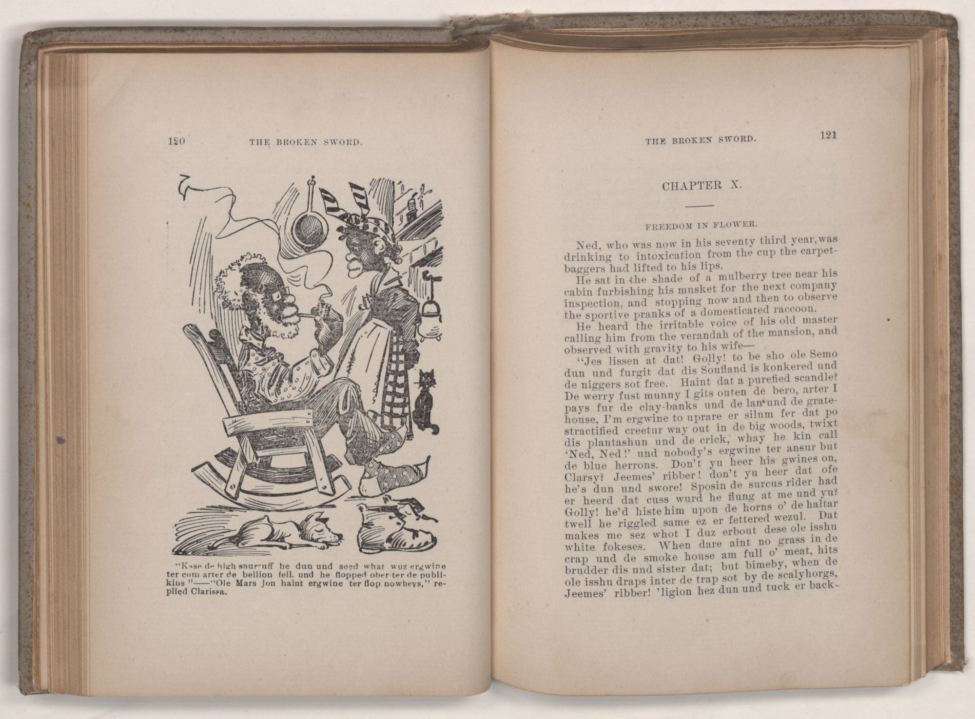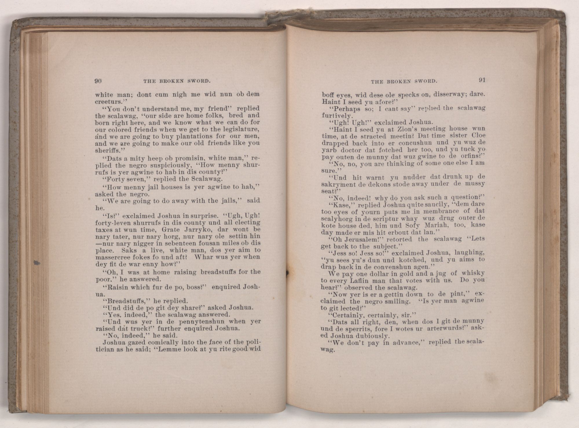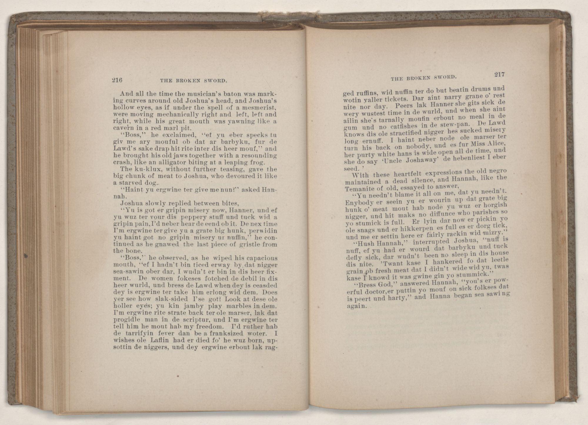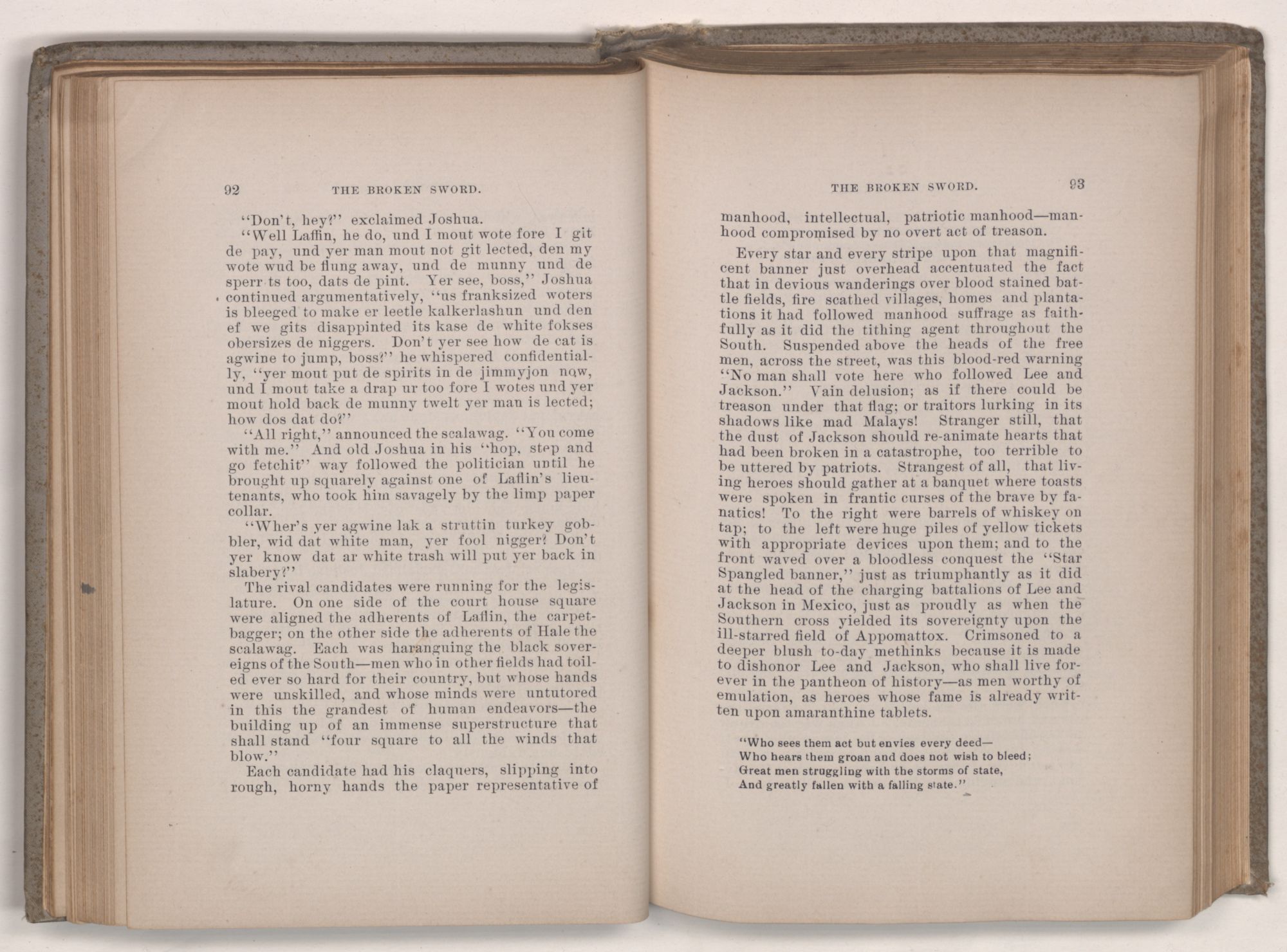 “Yer mout be miserabler dan yer is, misses. Heep er times our white gals finks dey is er upsotting de yearth by gittin jined to de furreners when dey is er flinging de fat in de fire. Look at dat white gal ober de medder. She run away wid wun ob dese carpetsackers, und she wus dat proud dat she wud hold her nose ef de po white trash breshed up agin her cote skeerts. Und where is she now?”