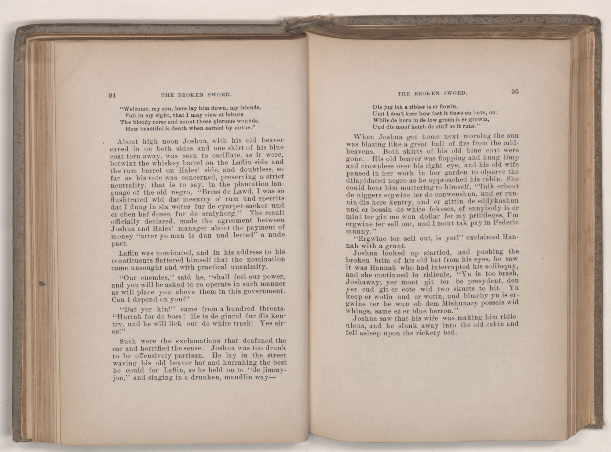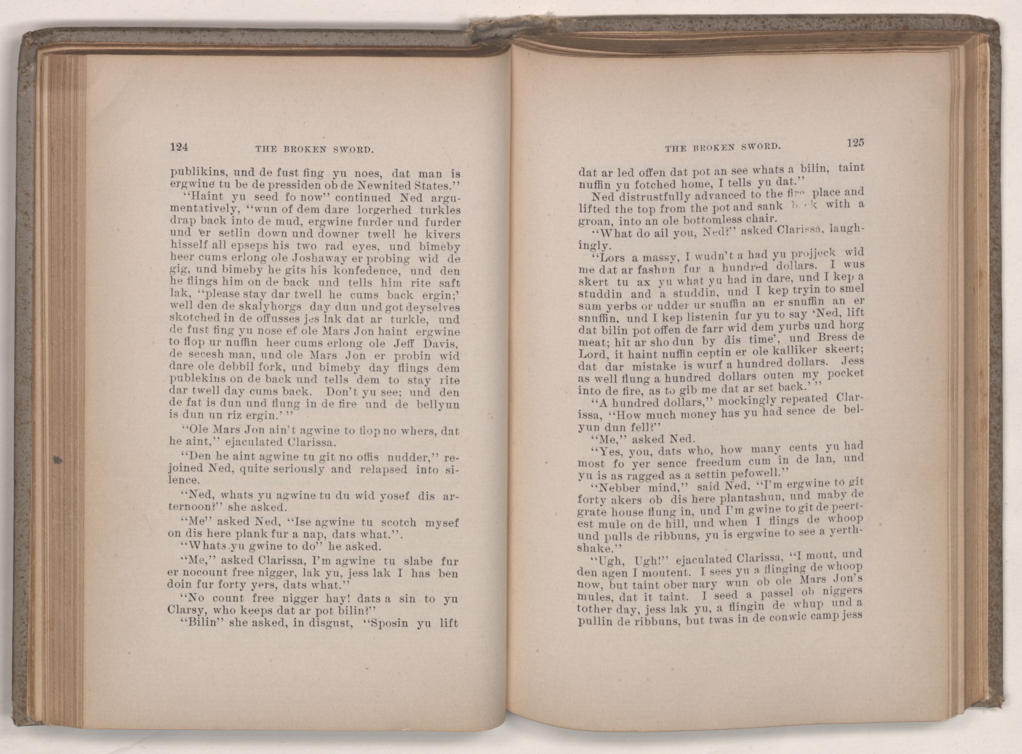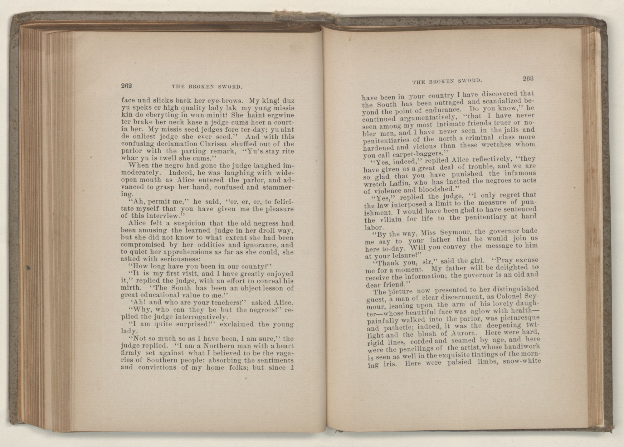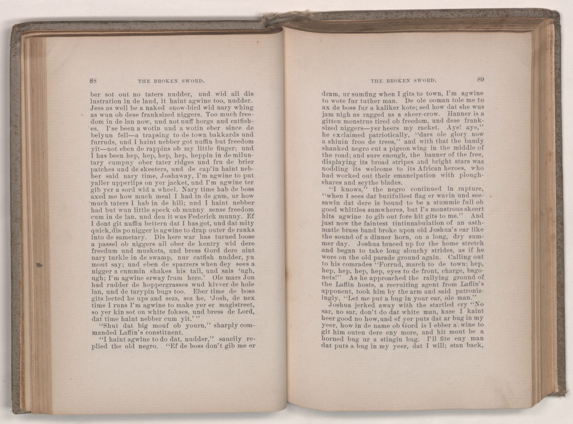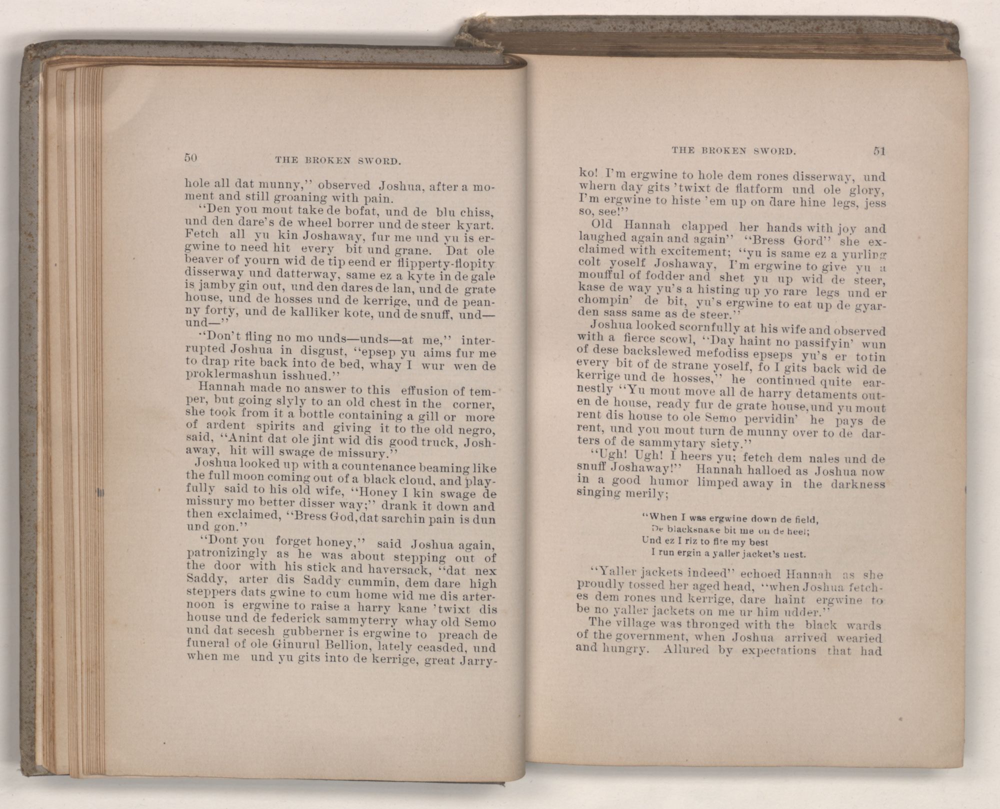 “Yer mout be miserabler dan yer is, misses. Heep er times our white gals finks dey is er upsotting de yearth by gittin jined to de furreners when dey is er flinging de fat in de fire. Look at dat white gal ober de medder. She run away wid wun ob dese carpetsackers, und she wus dat proud dat she wud hold her nose ef de po white trash breshed up agin her cote skeerts. Und where is she now?”