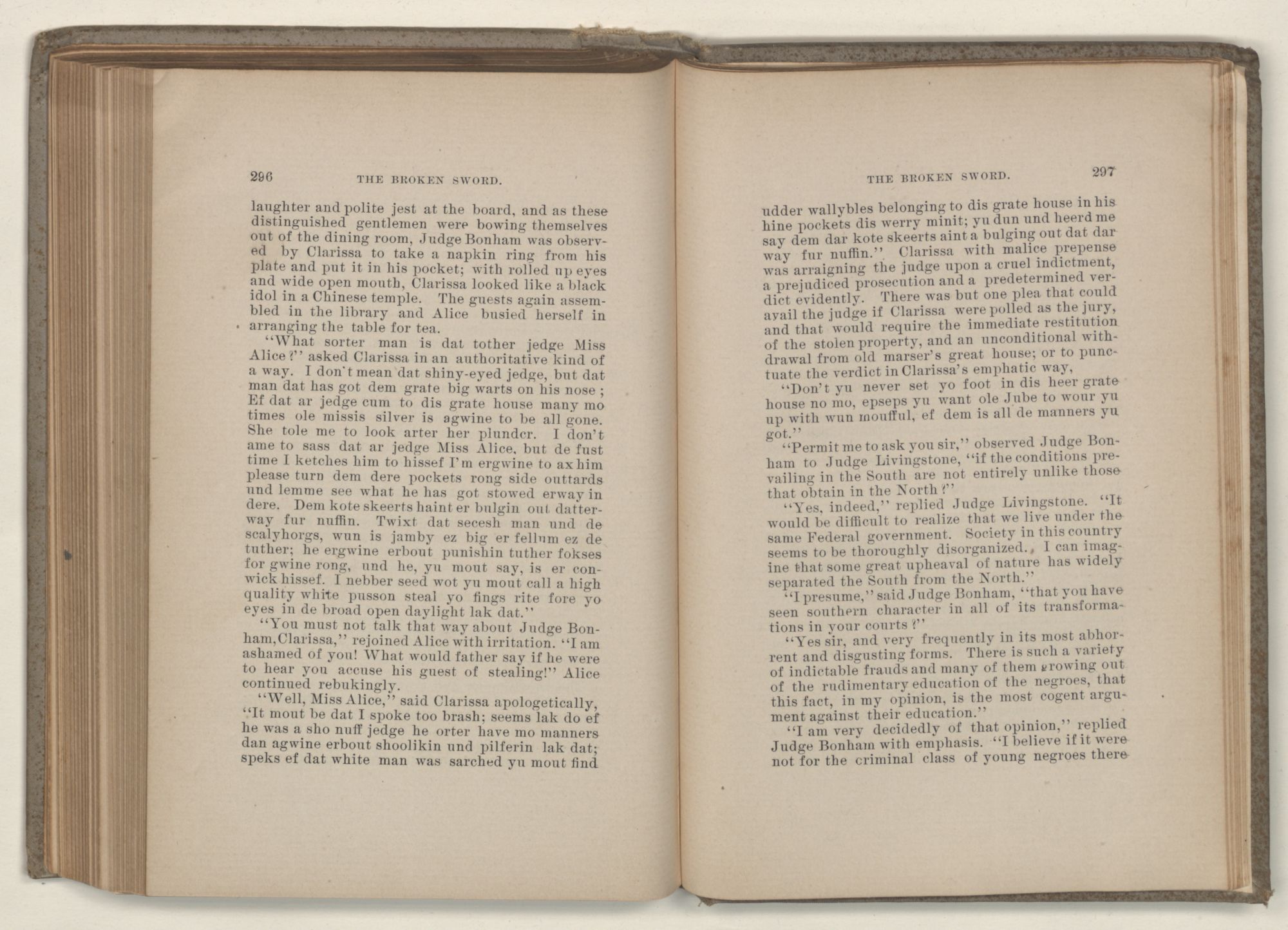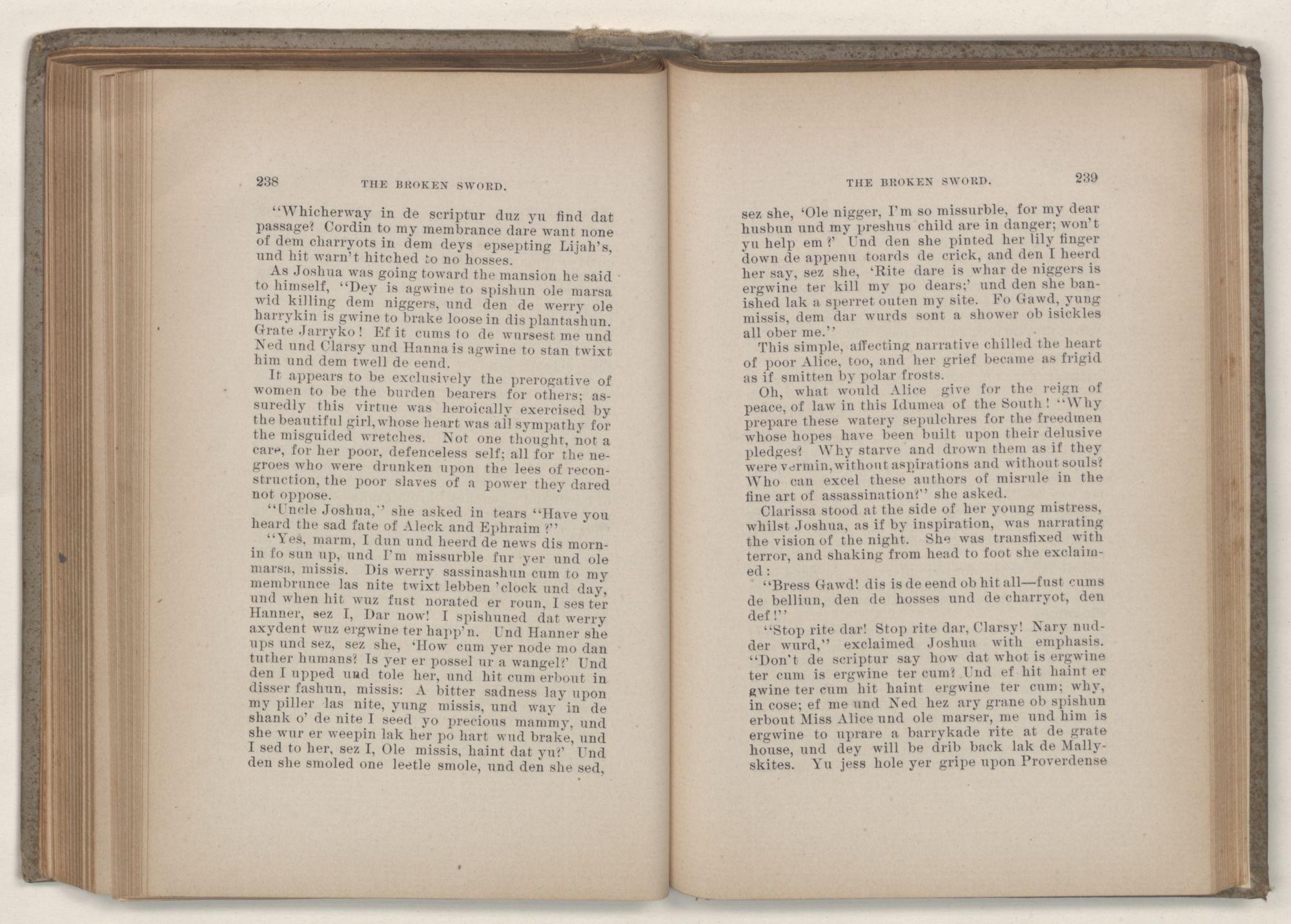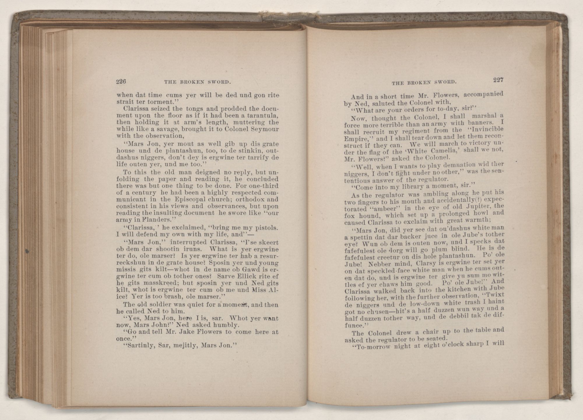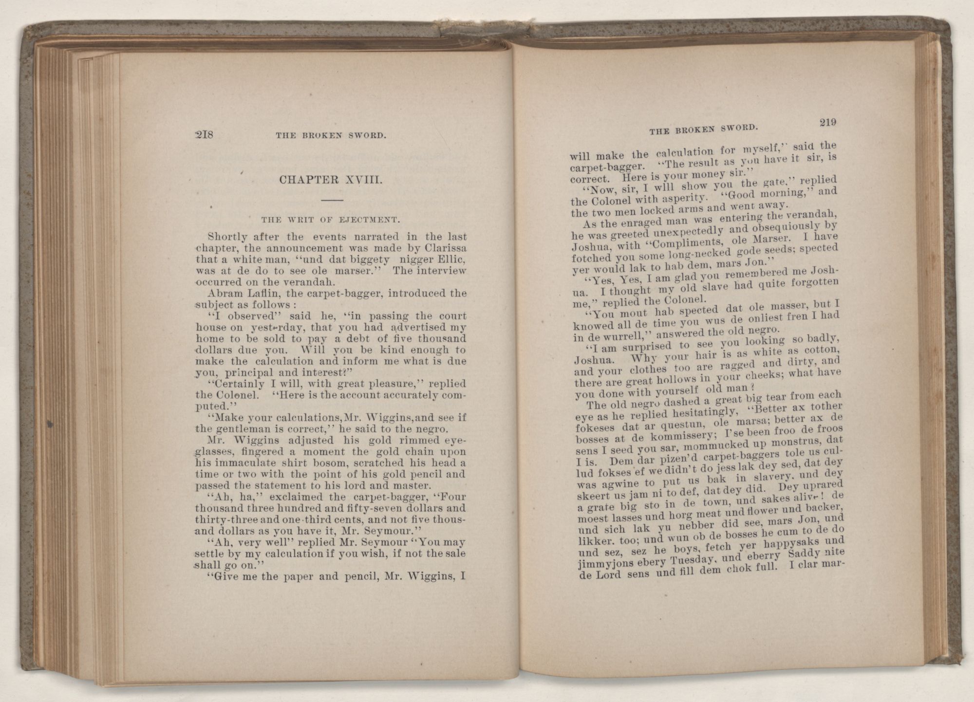 “Yer mout be miserabler dan yer is, misses. Heep er times our white gals finks dey is er upsotting de yearth by gittin jined to de furreners when dey is er flinging de fat in de fire. Look at dat white gal ober de medder. She run away wid wun ob dese carpetsackers, und she wus dat proud dat she wud hold her nose ef de po white trash breshed up agin her cote skeerts. Und where is she now?”