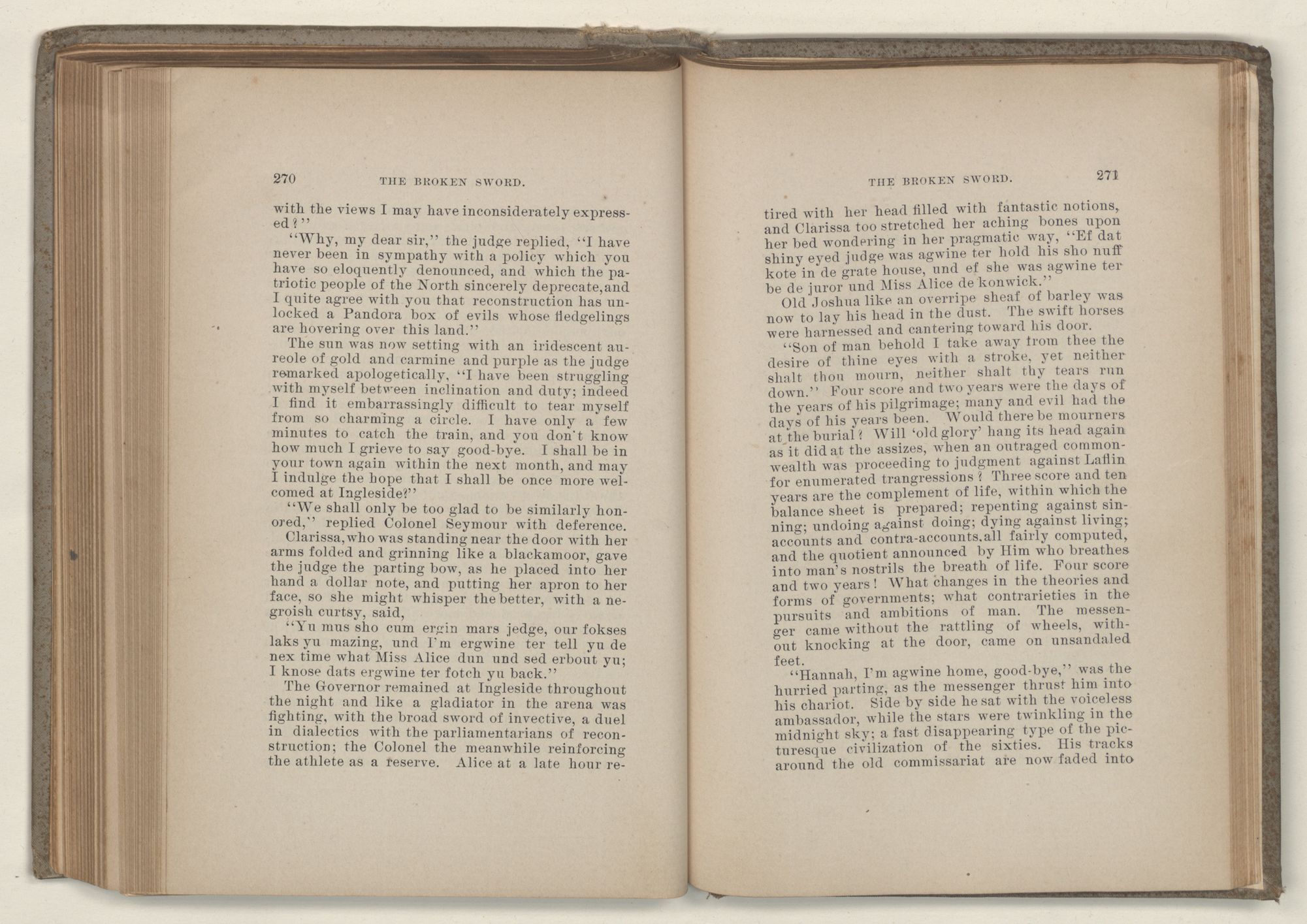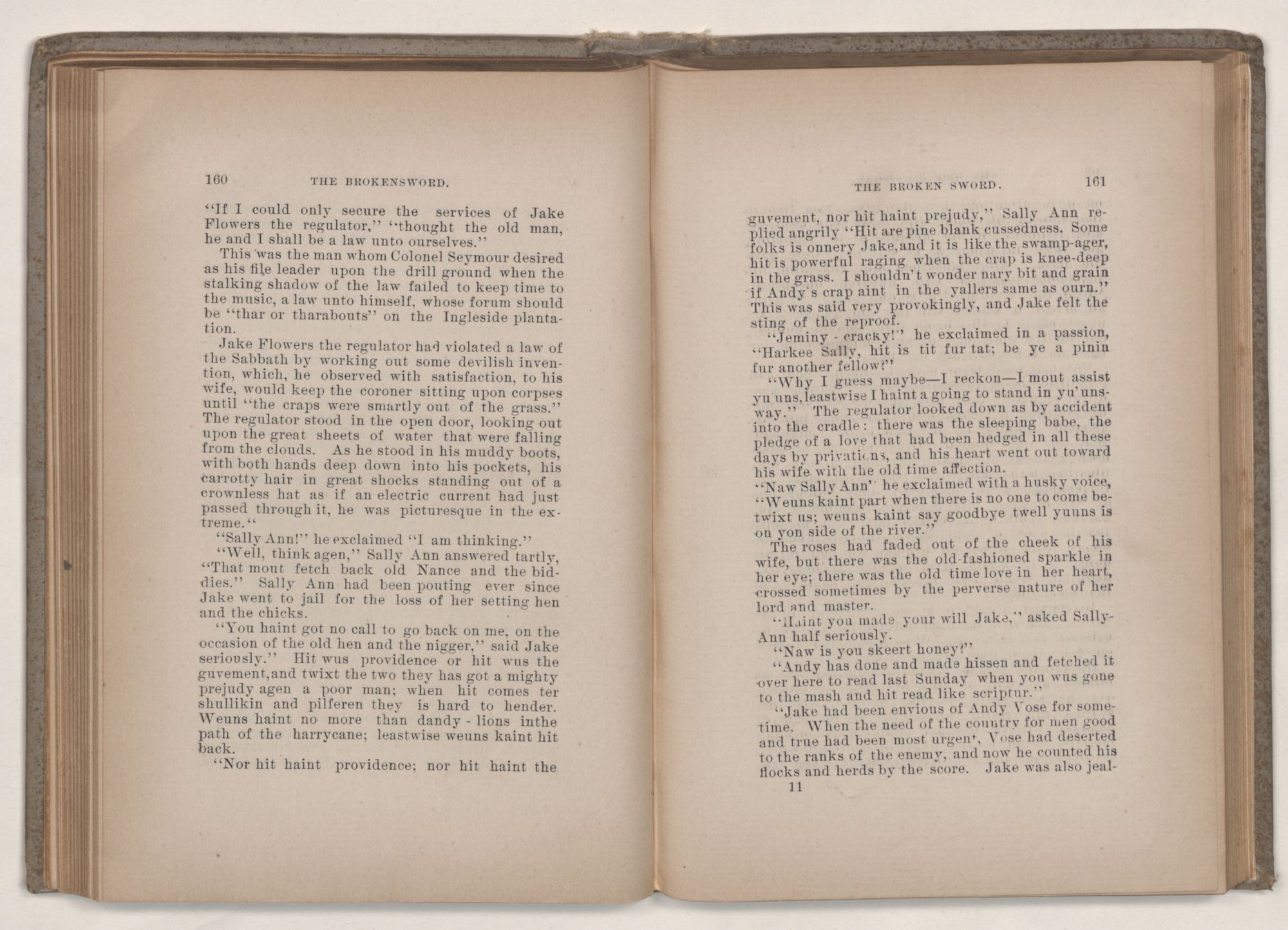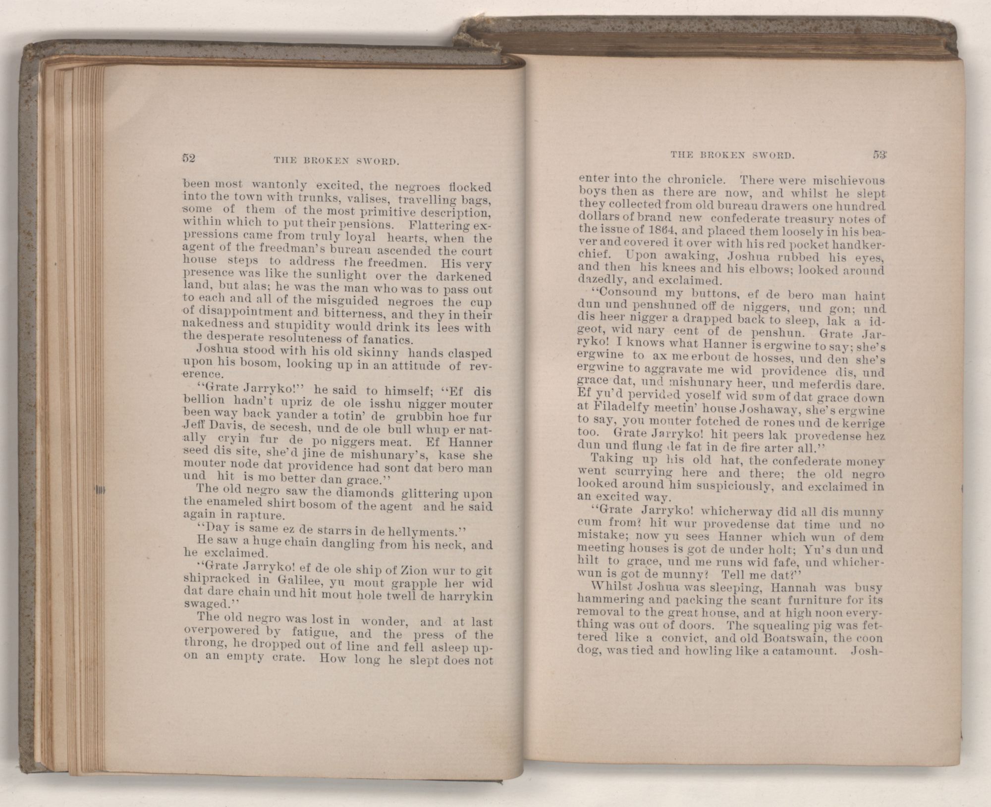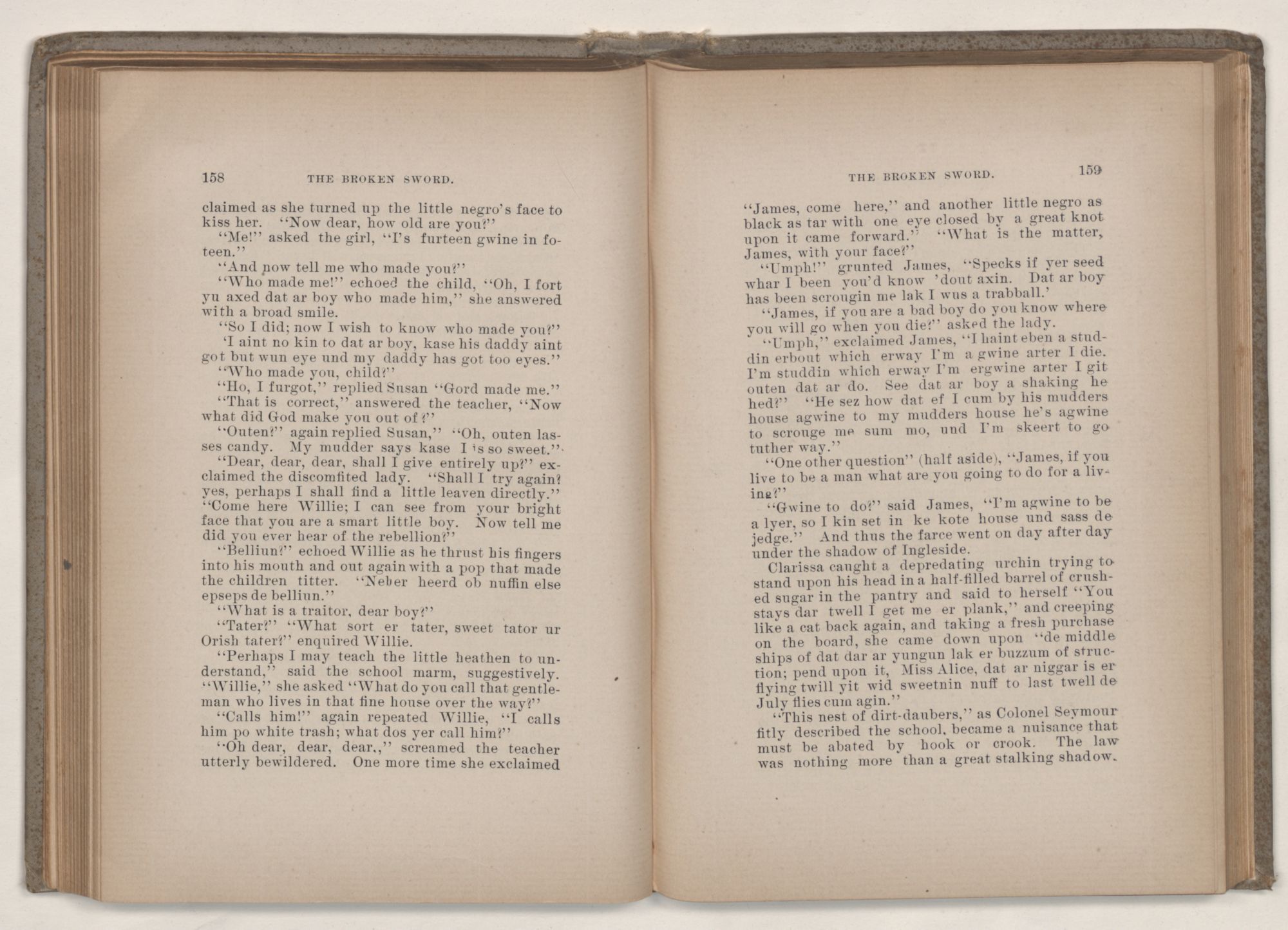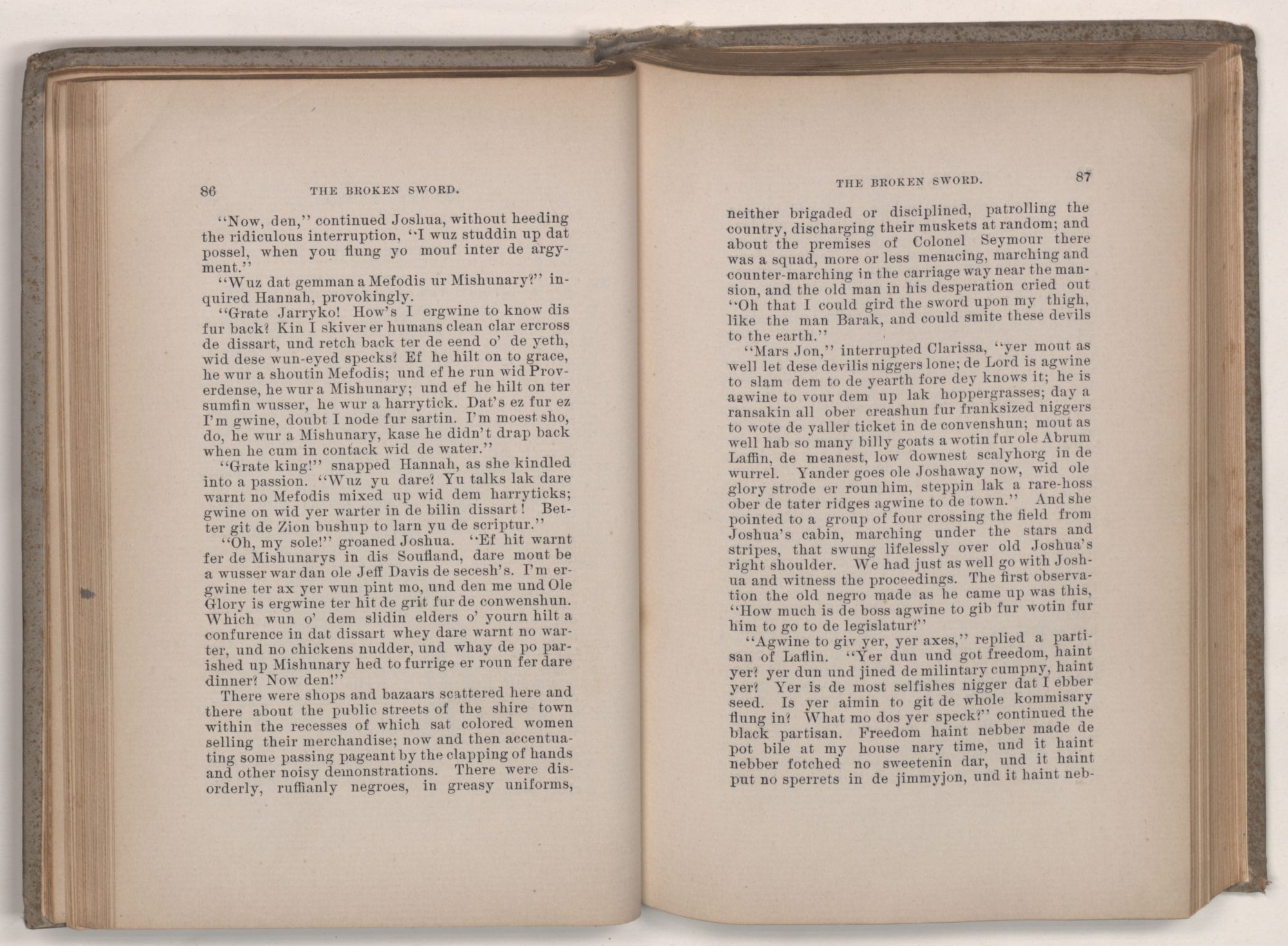 “Yer mout be miserabler dan yer is, misses. Heep er times our white gals finks dey is er upsotting de yearth by gittin jined to de furreners when dey is er flinging de fat in de fire. Look at dat white gal ober de medder. She run away wid wun ob dese carpetsackers, und she wus dat proud dat she wud hold her nose ef de po white trash breshed up agin her cote skeerts. Und where is she now?”