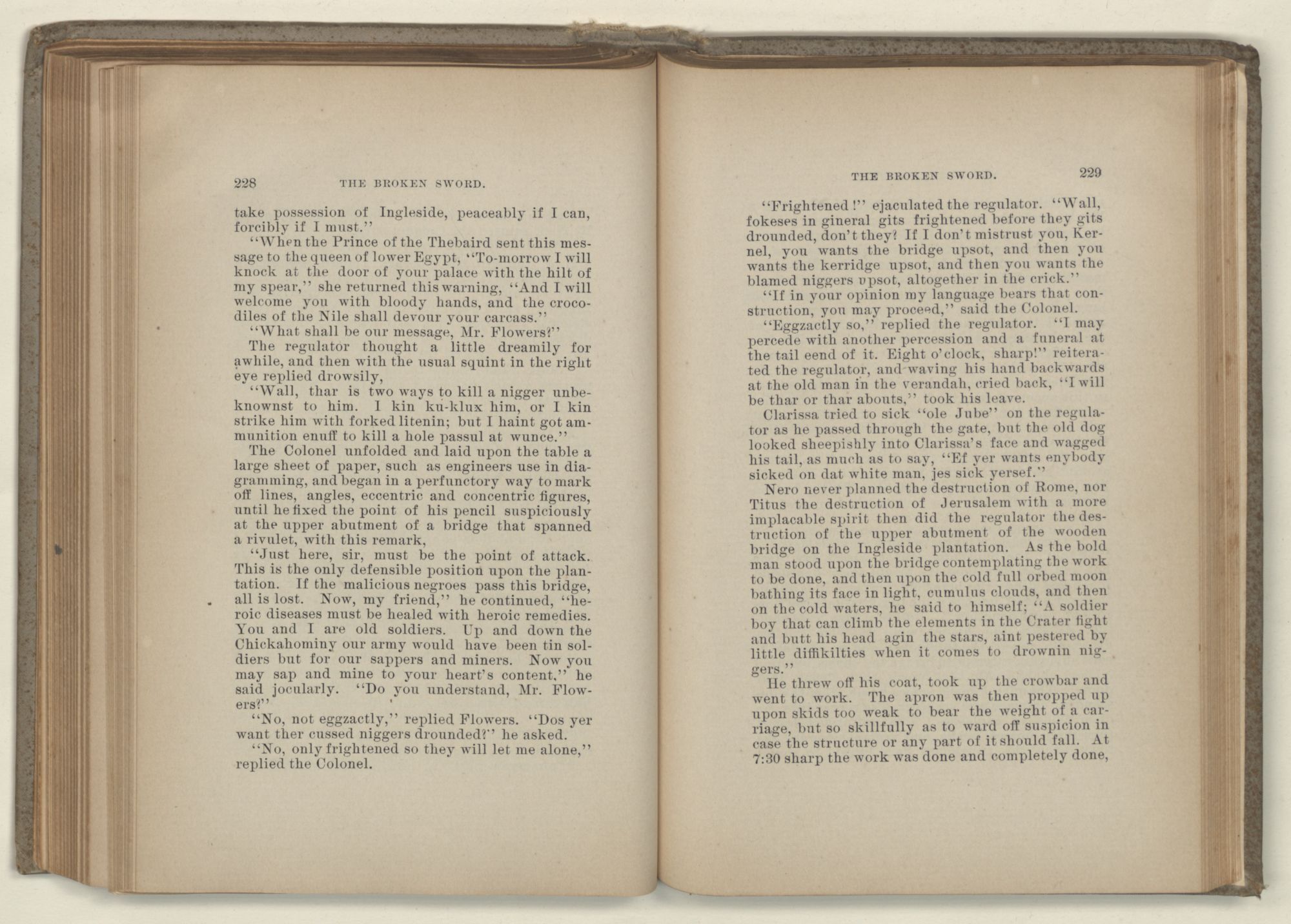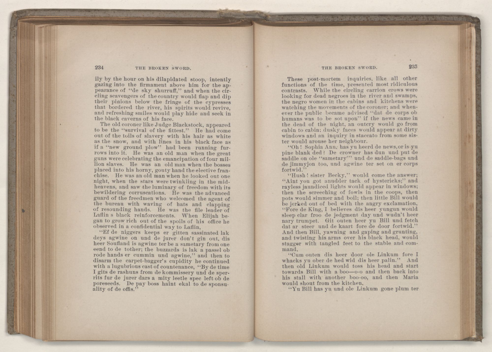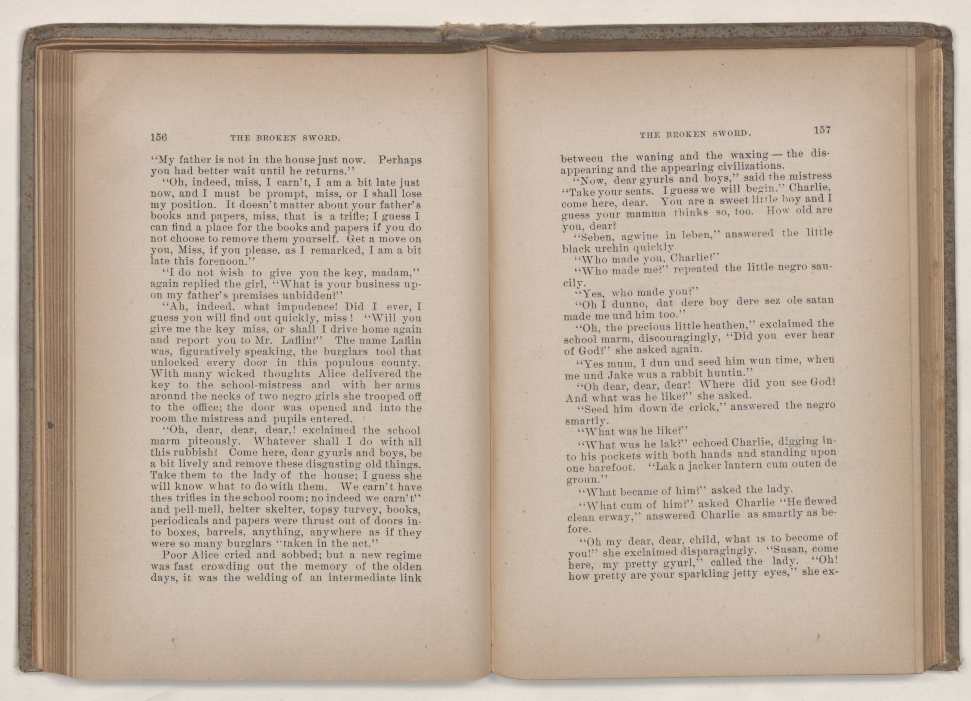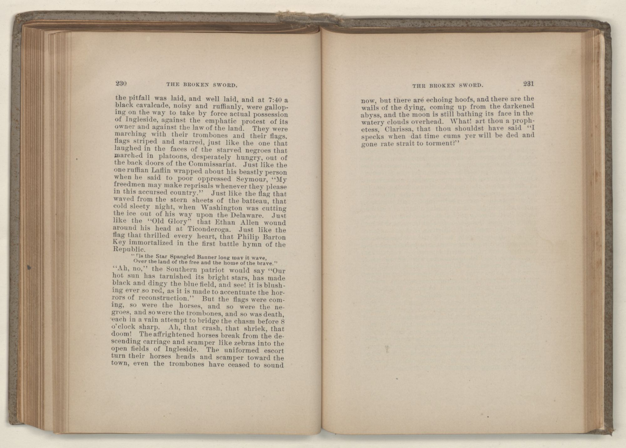 “Yer mout be miserabler dan yer is, misses. Heep er times our white gals finks dey is er upsotting de yearth by gittin jined to de furreners when dey is er flinging de fat in de fire. Look at dat white gal ober de medder. She run away wid wun ob dese carpetsackers, und she wus dat proud dat she wud hold her nose ef de po white trash breshed up agin her cote skeerts. Und where is she now?”