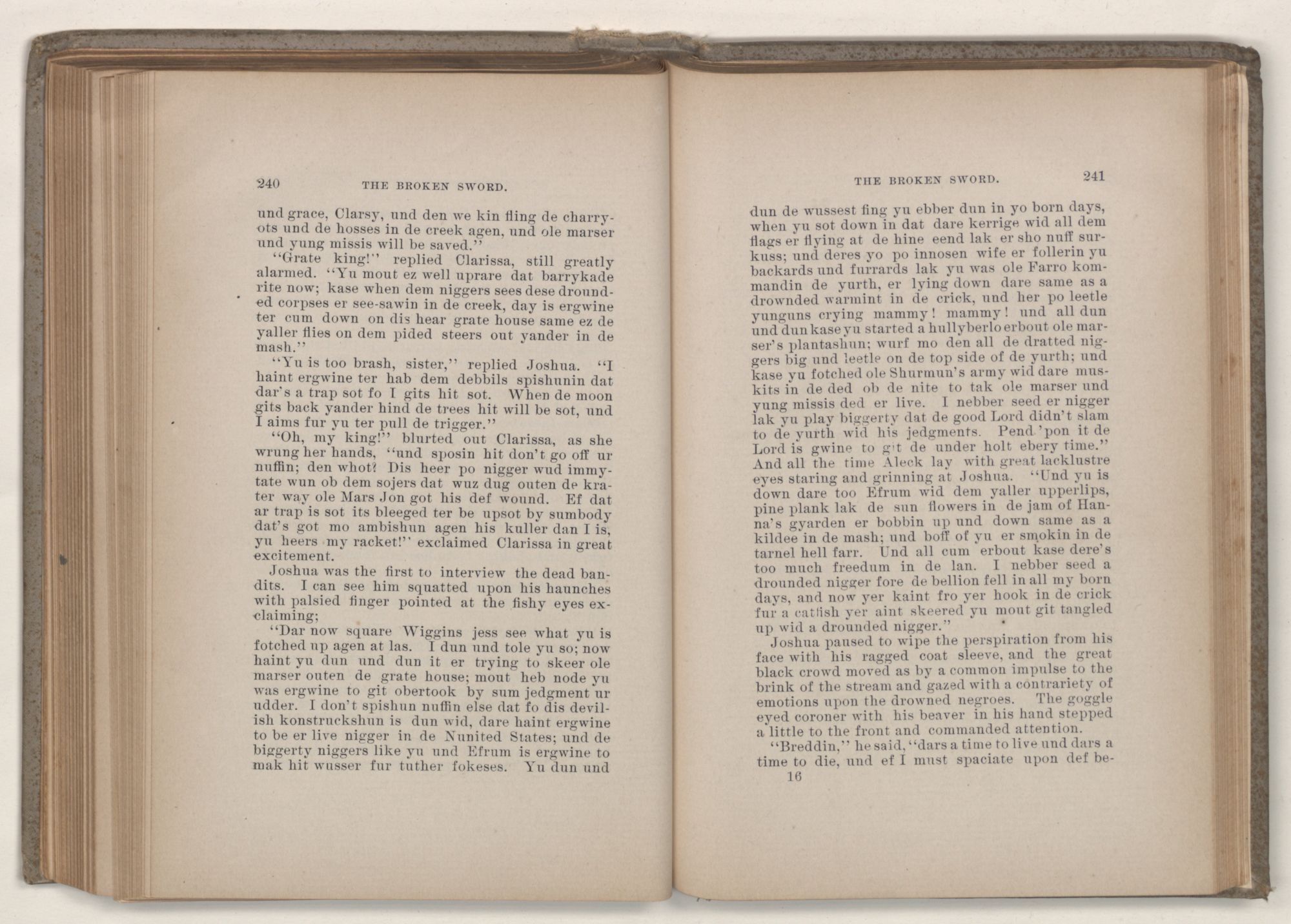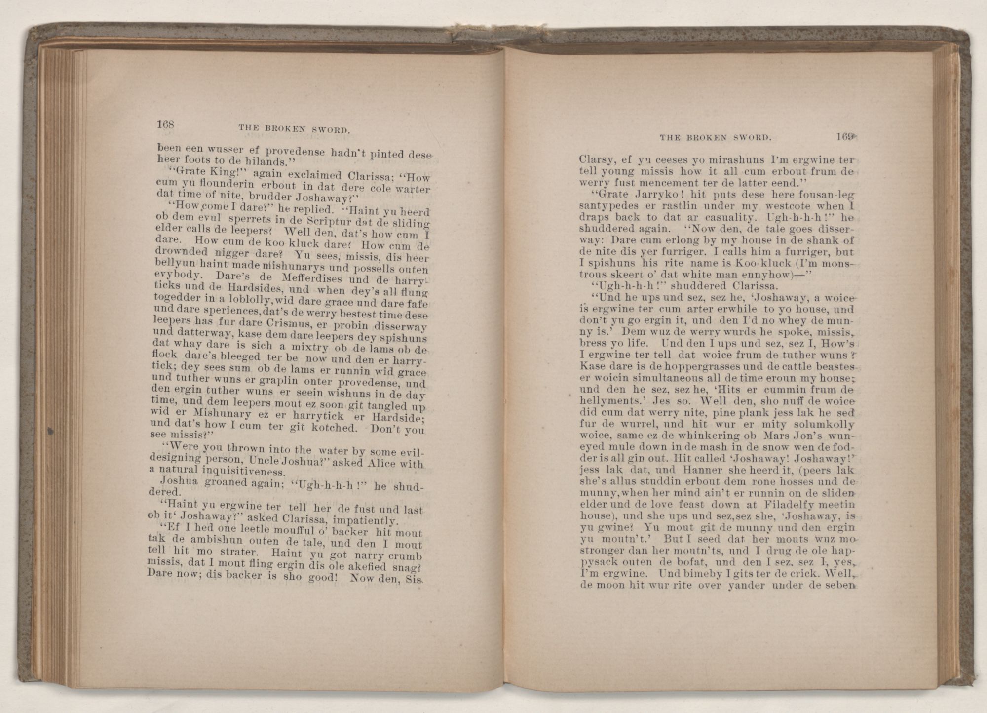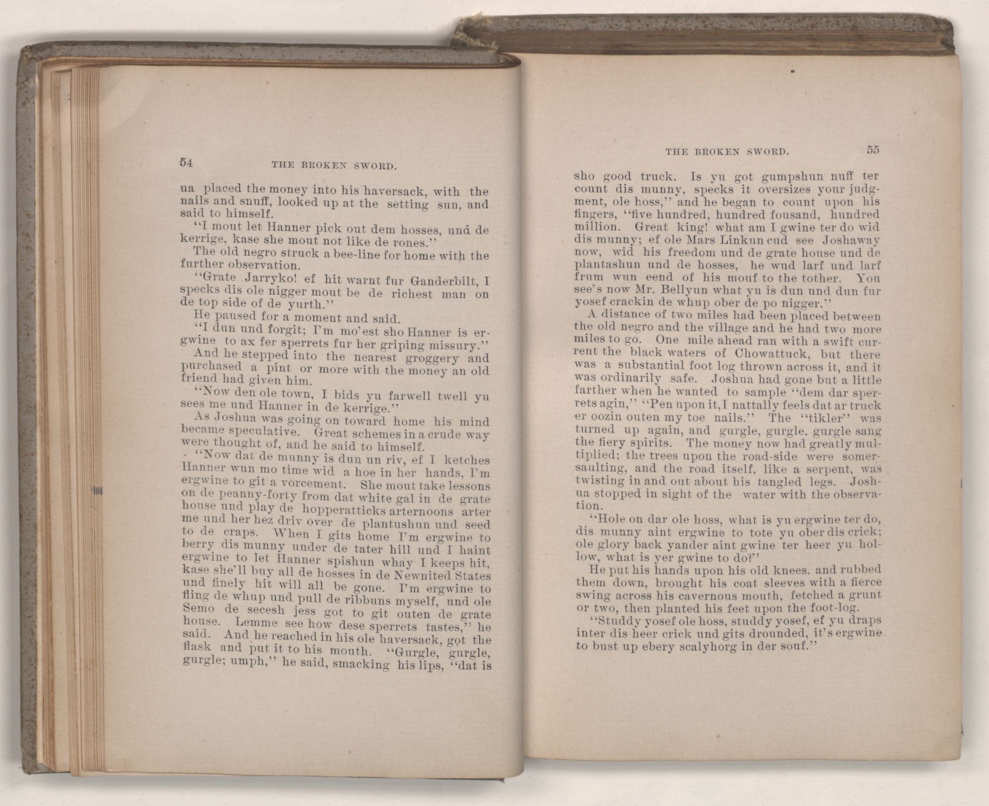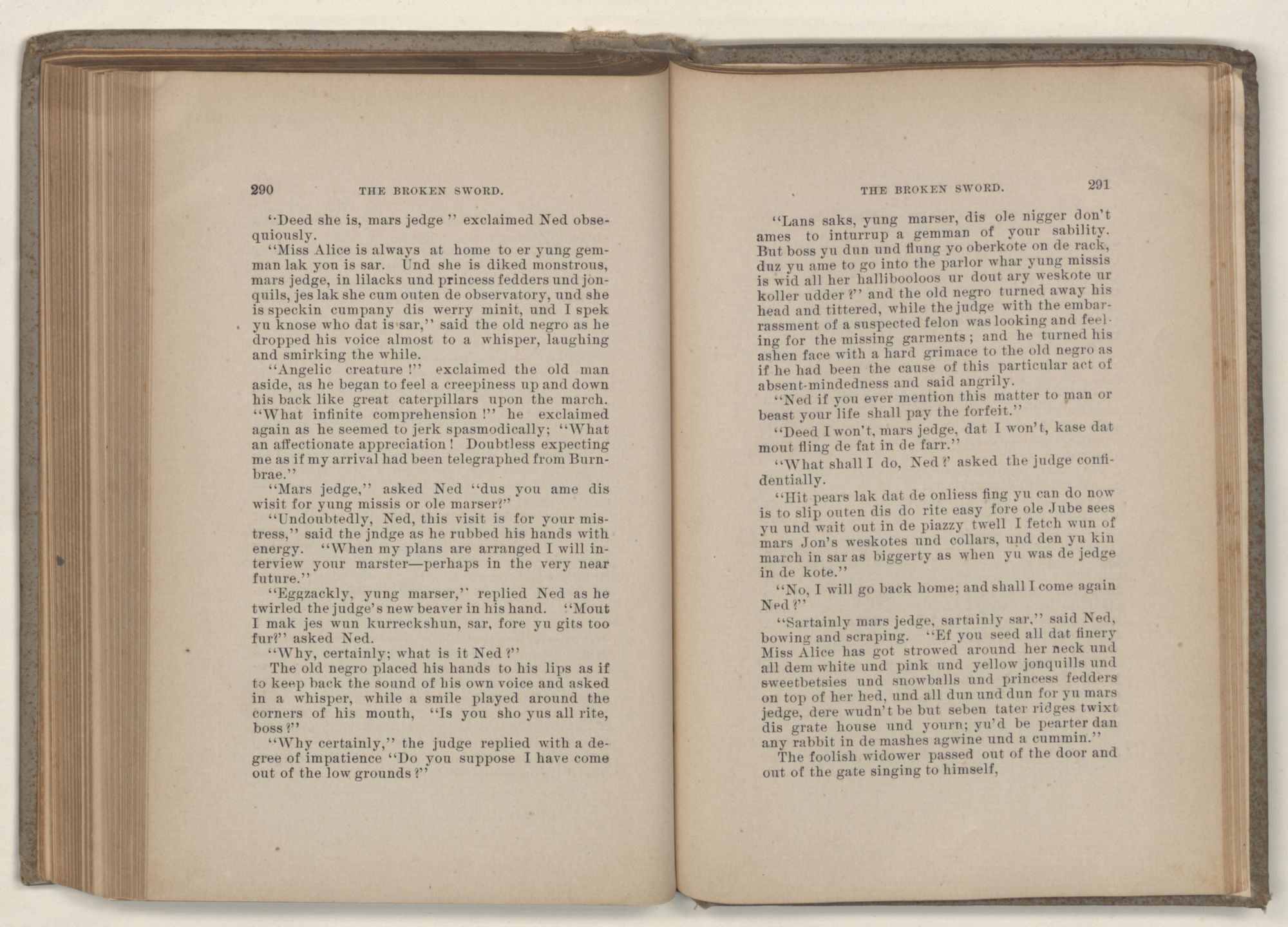 “Yu better ax wot is agwine ter cum ob me und yu. Ole marser is agwine away fust, yu heer my racket. I dun heerd deth er calling him. Ole marser walks rite cranked-sided now, wid dat wheezin in his chiss, und twixt dese franksized niggers, und dis outlandish konstrucshun, und ole missis dun und gon, ole marser is er pinin lak a dedded gum in de low ground.”