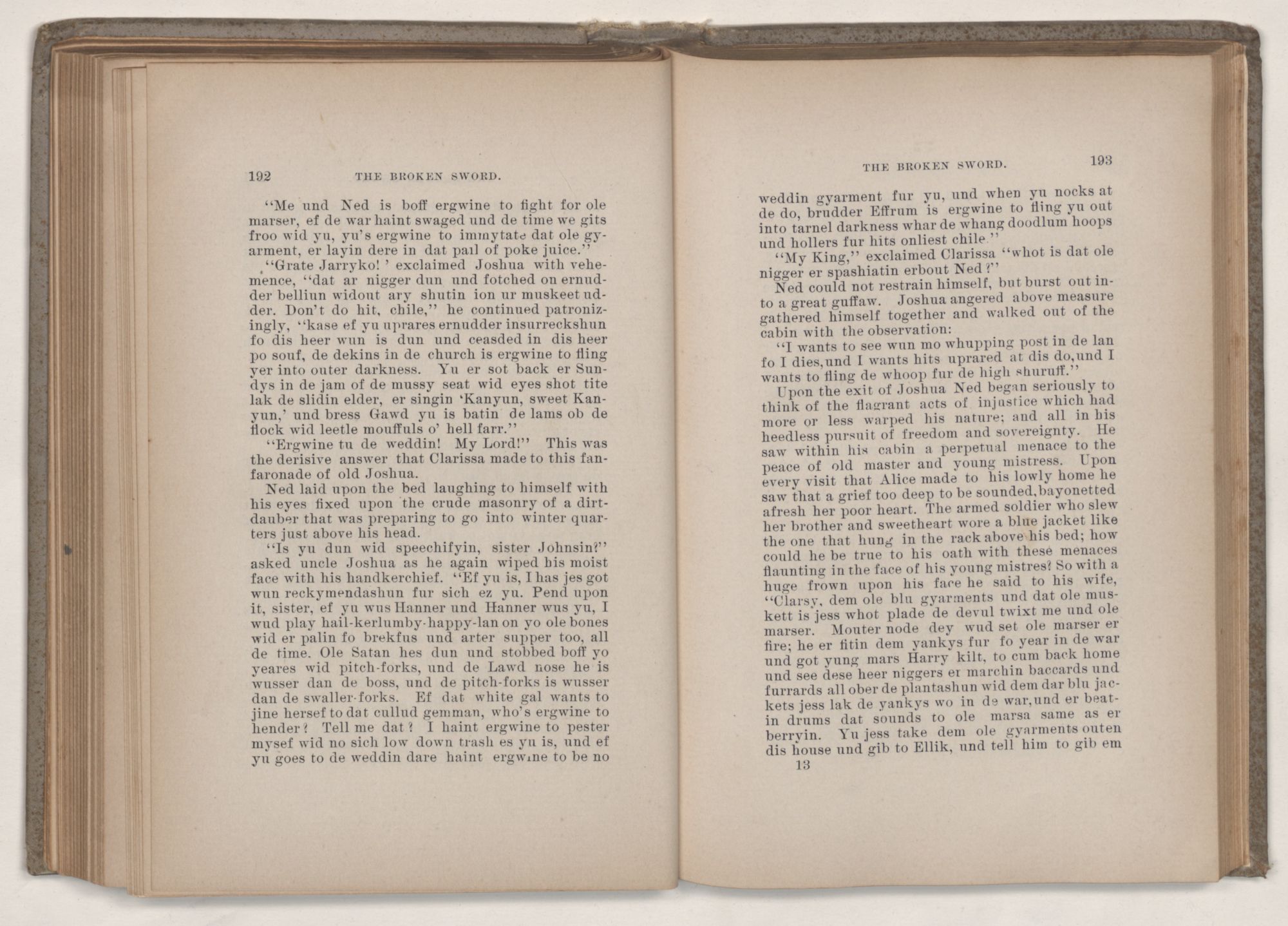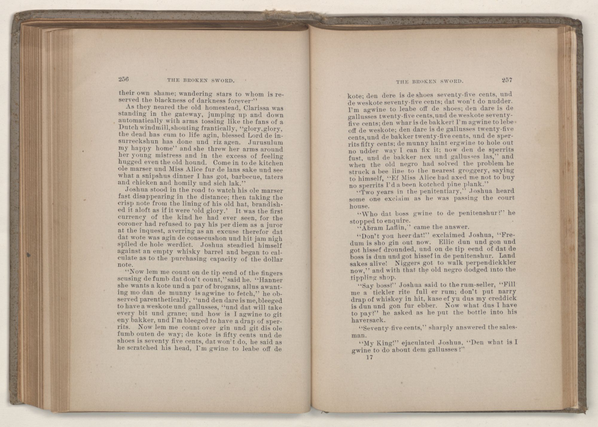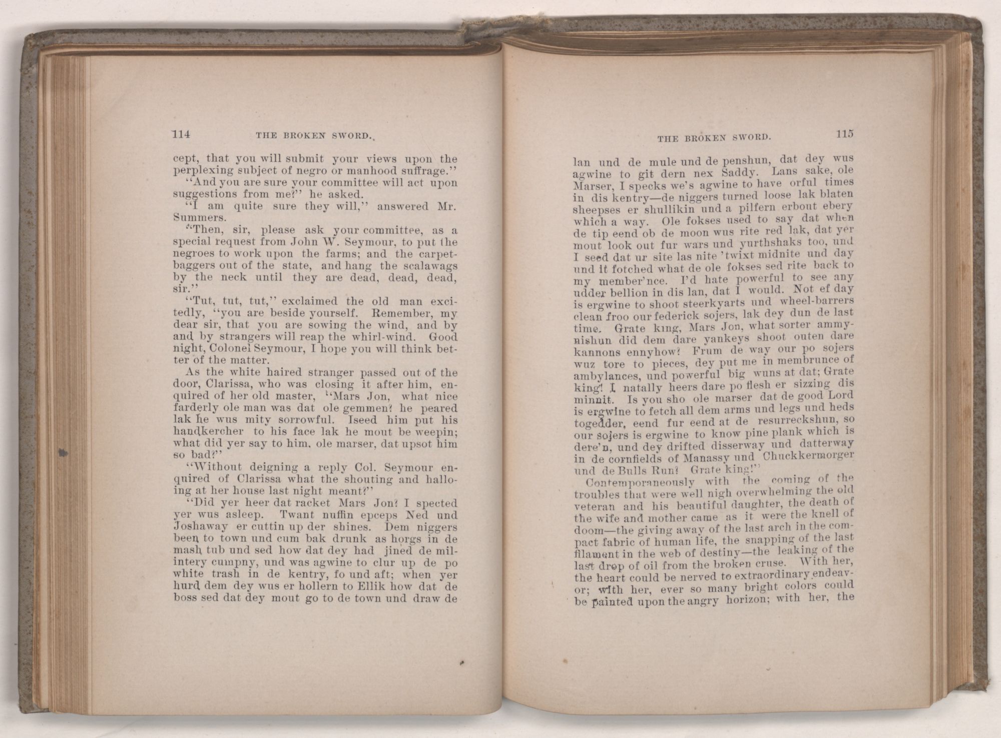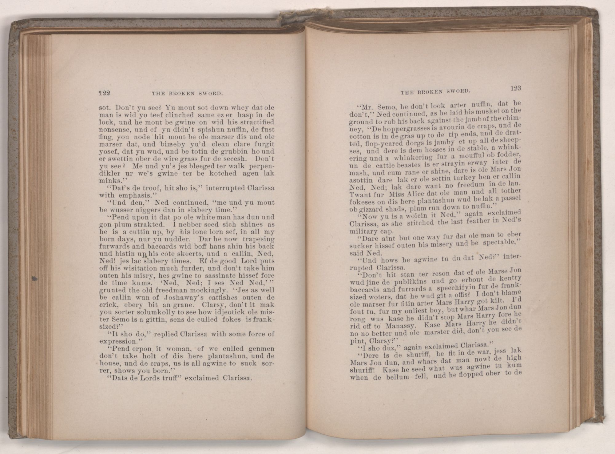 “Yu better ax wot is agwine ter cum ob me und yu. Ole marser is agwine away fust, yu heer my racket. I dun heerd deth er calling him. Ole marser walks rite cranked-sided now, wid dat wheezin in his chiss, und twixt dese franksized niggers, und dis outlandish konstrucshun, und ole missis dun und gon, ole marser is er pinin lak a dedded gum in de low ground.”