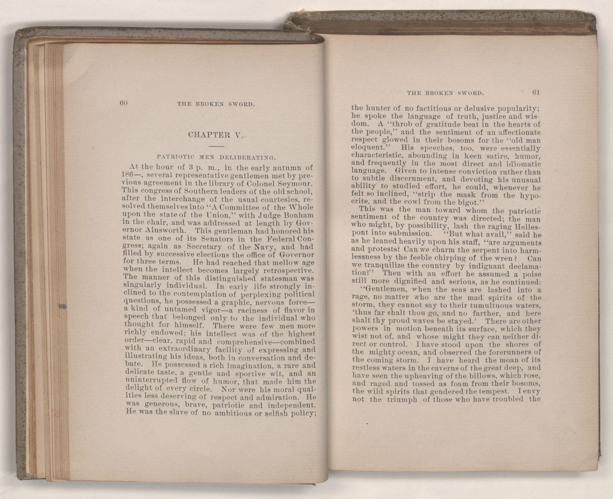 I have asked the historian, the essayist, the chronicler, the clairvoyant, to aid me in the retrospection, but they answer dubiously. There is no trodden path that I may pursue. No friendly hand that I may clasp as I stride across fens and brakes, and morasses: even the echoes of receding footsteps, like the laughter of happy voices are hushed and dead “lang syne.” There are faded letters however that I may read; broken swords and battered shields hanging upon decaying walls; moth eaten uniforms in garret and closet, that will guide me backward. The line of vision is traversed by unwieldy throngs of dilapidated men, in tattered gray clothes, without a federal head, without intelligent momentum, breaking up and dissolving like icebergs drifting southward; they are coming back home where there is neither grain for the sickle, nor hope for the husbandman: coming back to little cottages where lights in the windows kept burning for dear papa flickered and spumed, then died down into the rustic candlesticks, when the little watchful eyes so tired and weary,