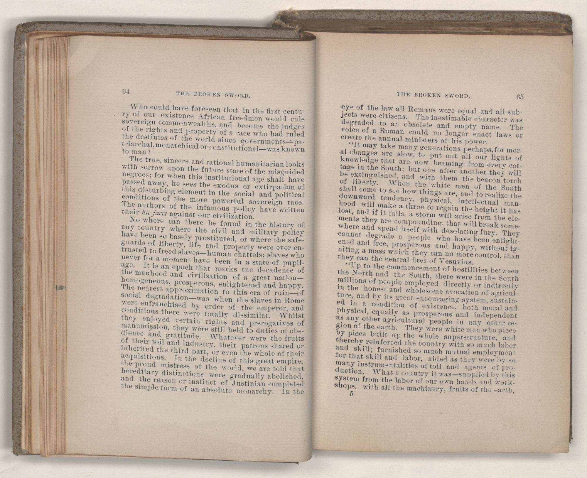 Looking backward upon a picturesque civilization—upon the old homesteads and plantations of the South, with their hallowed associations and ideals—with their impedimenta not of human chattels, but of compact masses of freed slaves, the underpinning of that civilization in its concrete form.