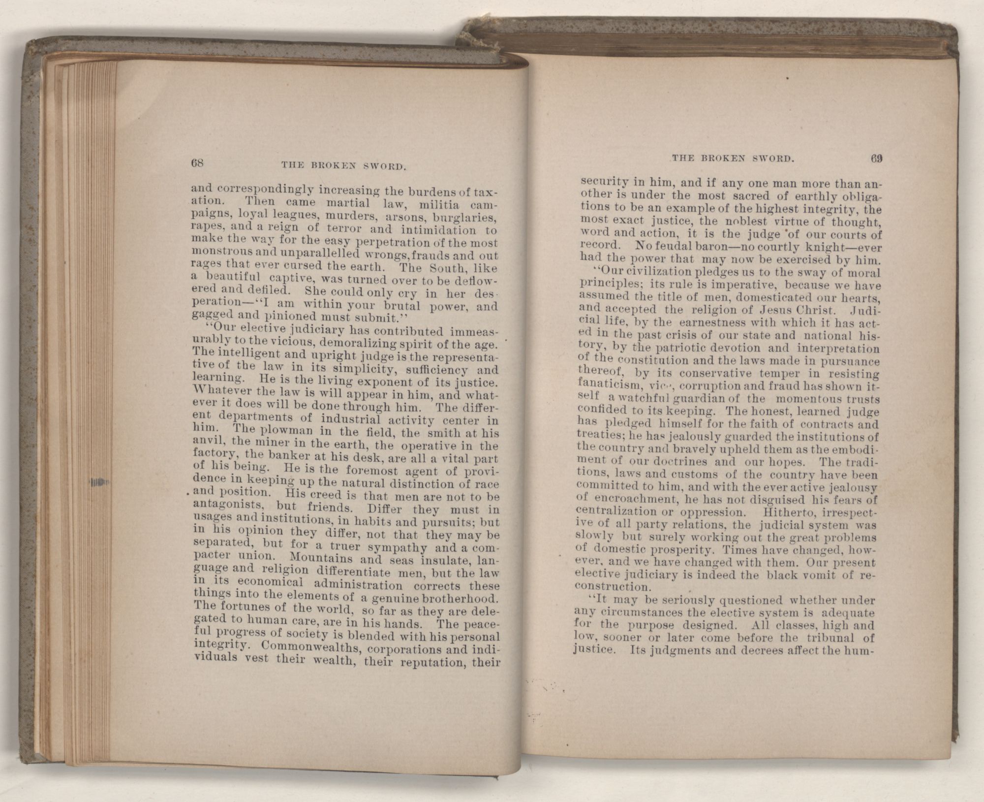 The Spanish inquisition, now the abhorrence of all enlightened minds, was long sustained in many centuries by the tyrants’ plea of necessity. In the burning of a thousand heretics the religious zealot saw the hand of God; in the destruction of a thousand sorcerers, the fanatic discerned the commonweal of the people; so in the whipcords with which the people of the South were so mercilessly scourged, there was found an antiseptic for the gangrenous wounds inflicted by the civil war. All these cruelties were legalized, while bleeding humanity was sinking under the burden of oppression.