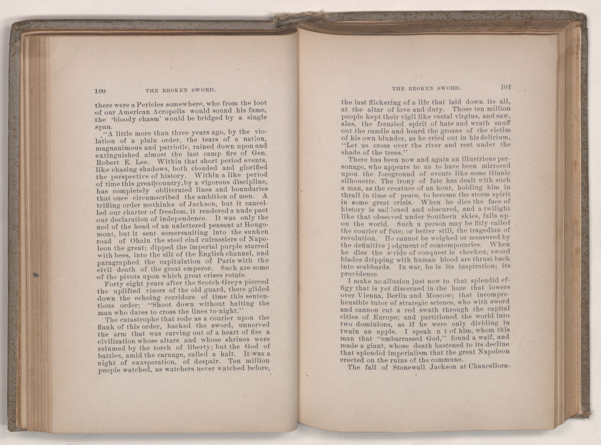 courage of Spartans; and the proud eminence they assumed in every engagement made them heroes in the forlorn struggle. There is not a single instance upon record where the swords or guns of the Southern armies were tarnished by ignoble flight or inglorious surrender; and whenever their flag was struck, it was because the elements of resistance were exhausted. Sad indeed that the drama should have begun and closed with such heart-rending tragedies. Could I so order and direct the policy of the government, I would make the glory of our American arms as imperishable as the Republicanism of our government. I would make Gettysburg and Chancellorsville to gleam through the haze of centuries like Marathon and Platæa and upon each return of the glorious anniversaries, I would find a Pericles to proclaim from our American Acropolis the fadeless glory of the men who wore the gray as well as the men who wore the blue.”