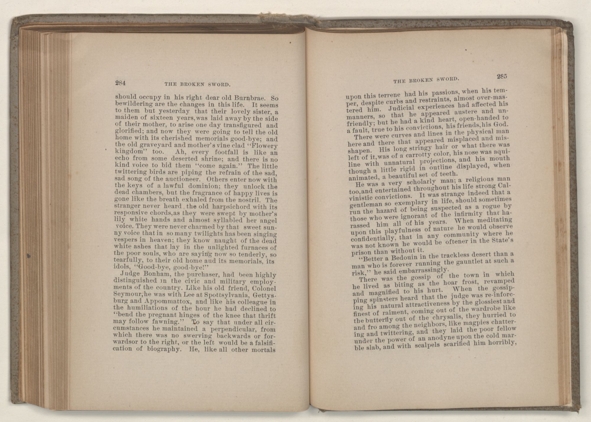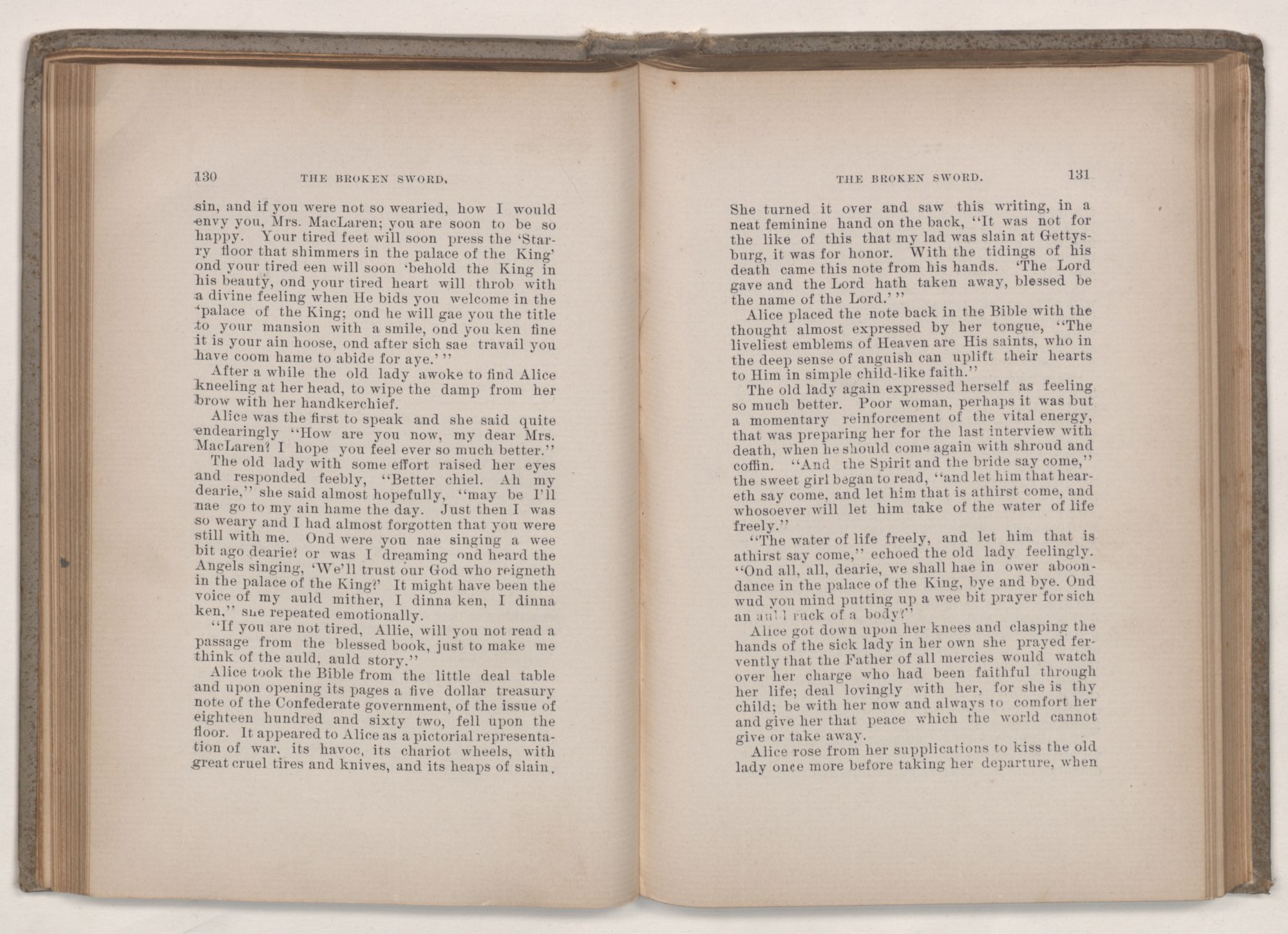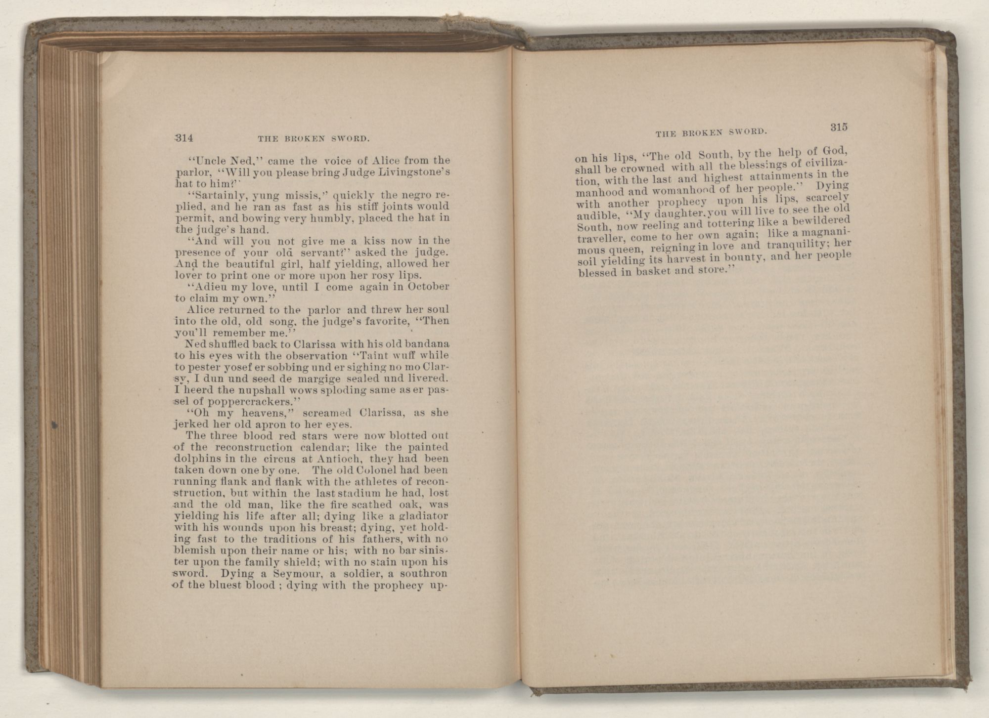 “Dat is Gords truf Ned,” exclaimed Clarissa as she drew her old checked apron across her eyes, “Hit pears lak dere is nuffin in dis wurrel epseps tribulashun of sperits. But bress her dear heart,’ the old negro continued, “I hope she may be jes es