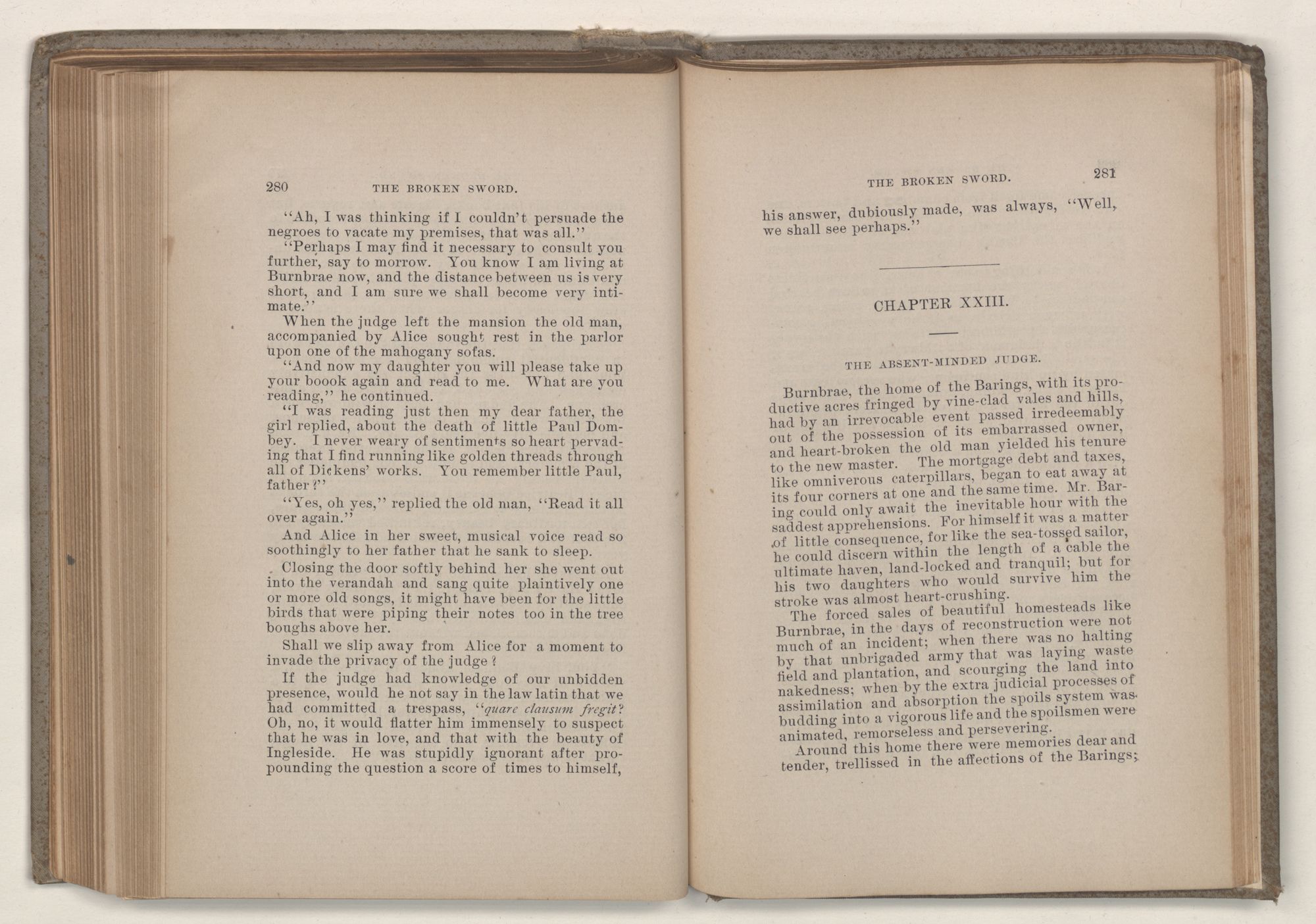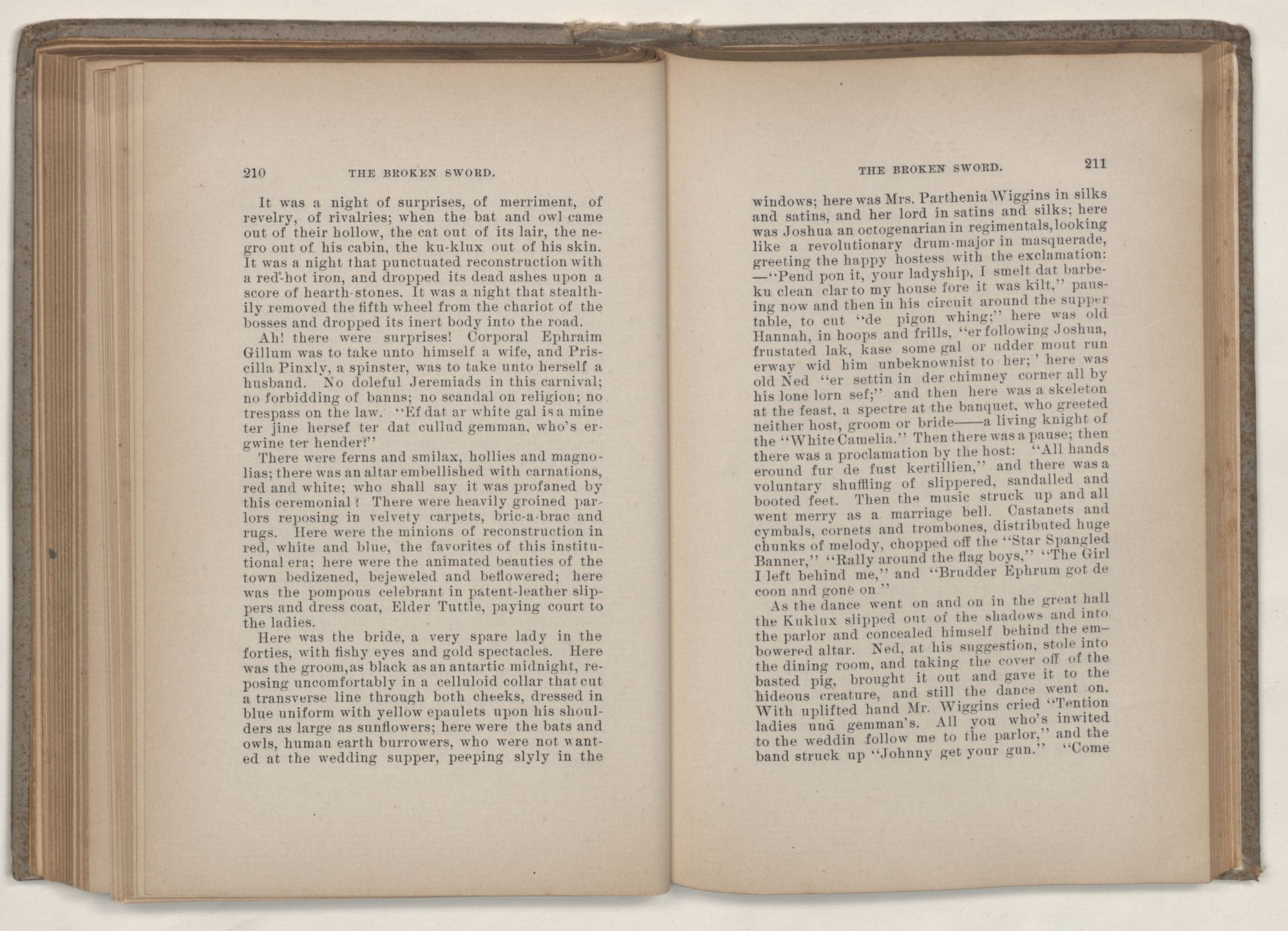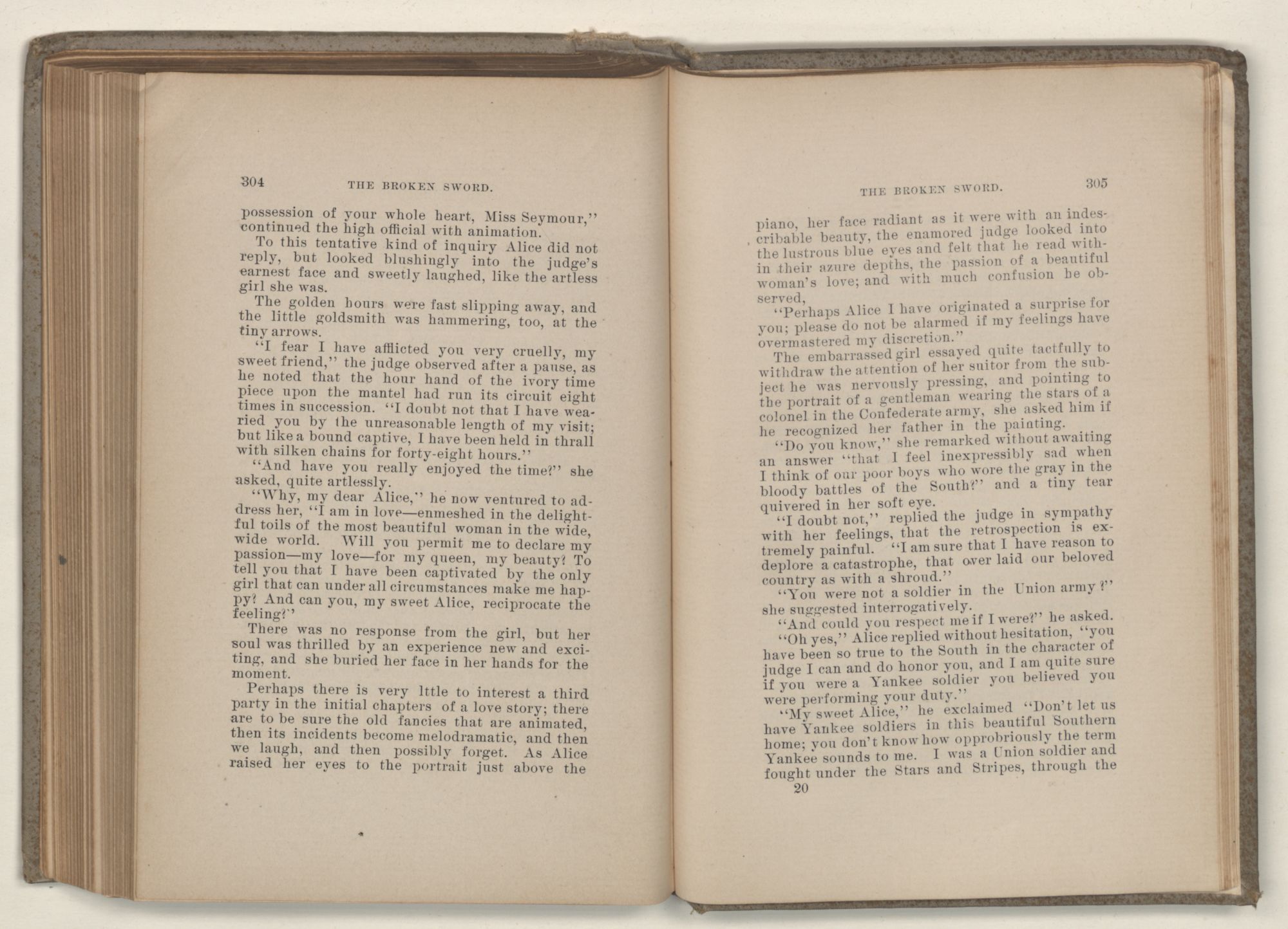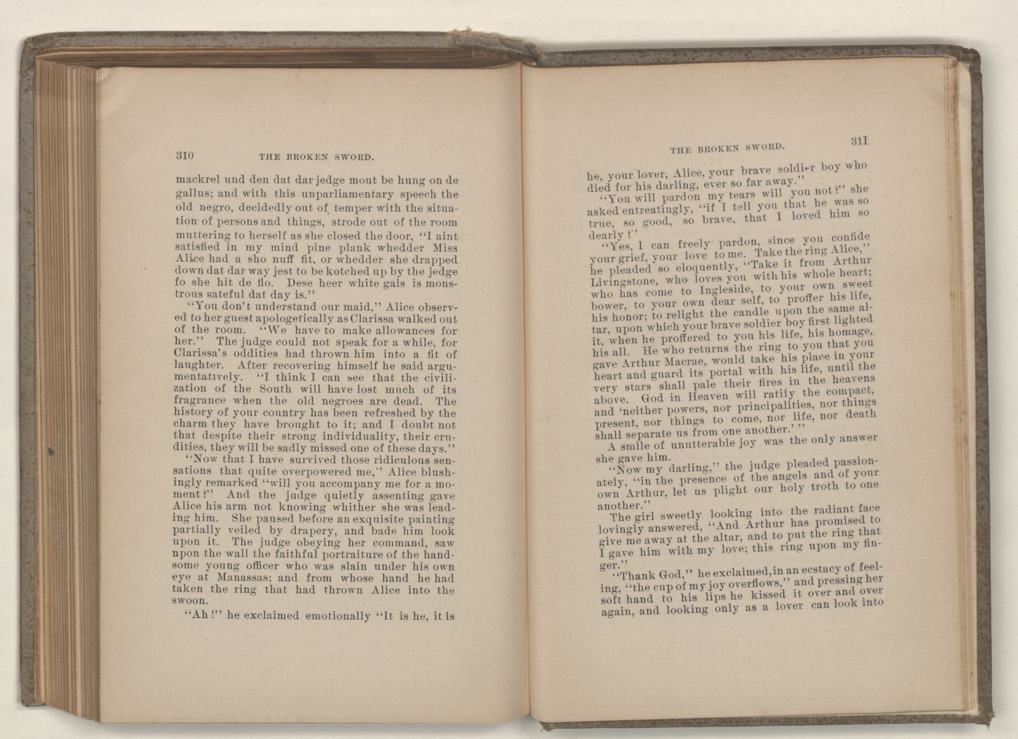 The minister stood at the little altar in the parlor. The ring that Alice had given to “Arthur” was slipped upon her finger, and in the presence of the angels, Judge Livingstone and Alice were made man and wife. As Ned and Clarissa passed out of the little verandah, Ned observed with streaming eyes, “Now Clarsy, dere is no mo music fur us but de crickets upon de hath. Miss Alice has dun und sung her las hime und we kaint foller Miss Alice whar she is ergwine no mo. Ef we uns is tuk sick we kaint holler fur Miss Alice no mo. I feels lak I haint got no frend now, Miss Alice dun jined hersef to dat furriner.”