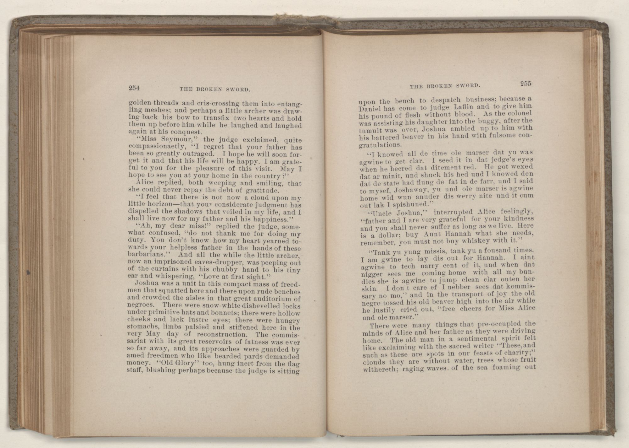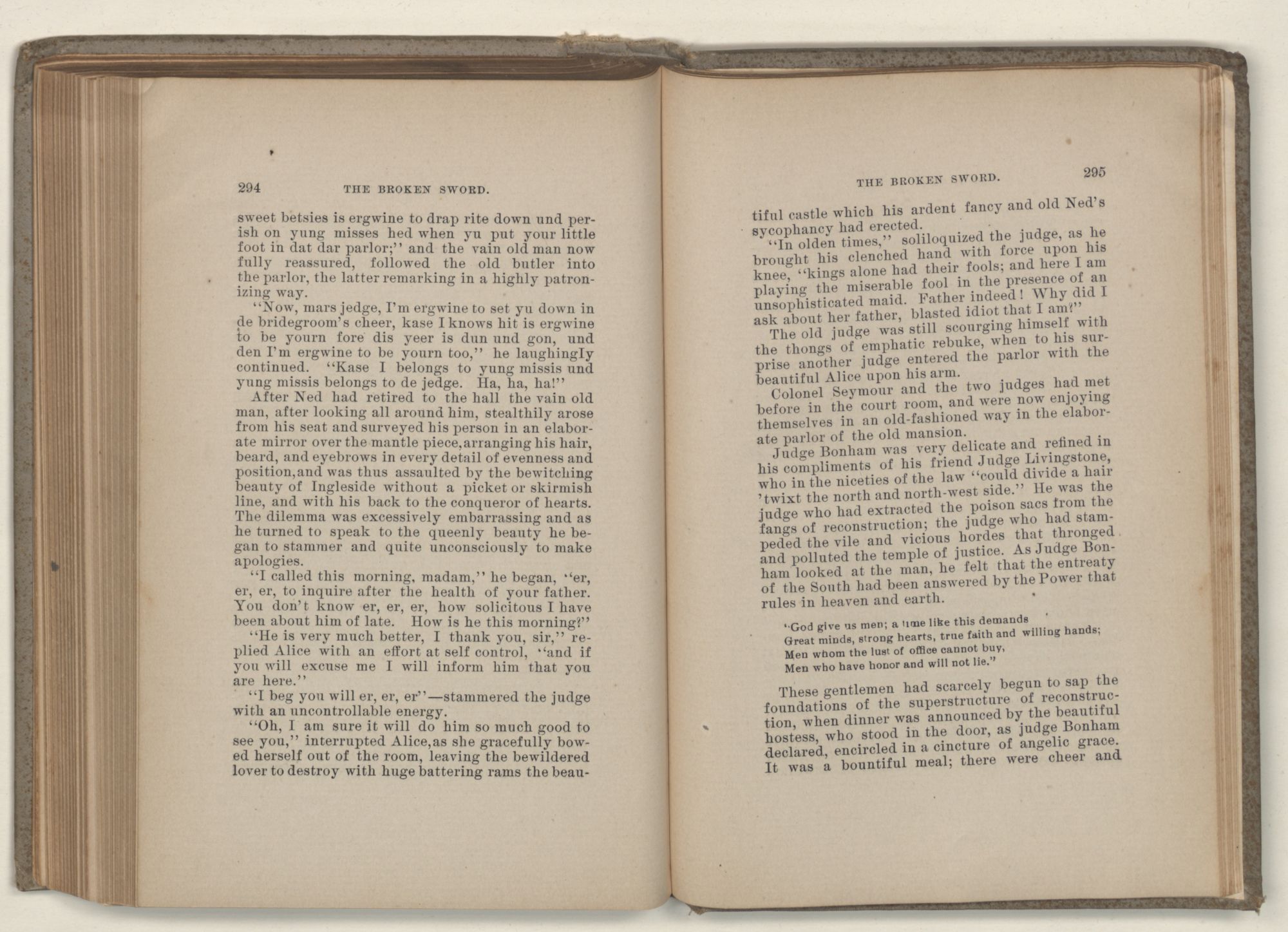 “Miss Alice,” she exclaimed as she clapped her hands approvingly, “If yer is as butiful when the jedge cums as yer is now, dat er pc man is ergwine stracted wid hissef. I clare fore my blessed Marster up yander if I had er node how butiful yer is agwine ter look in dat black mourning, I wuld er swaded yer to dun und dun it fore ole marsa died.”