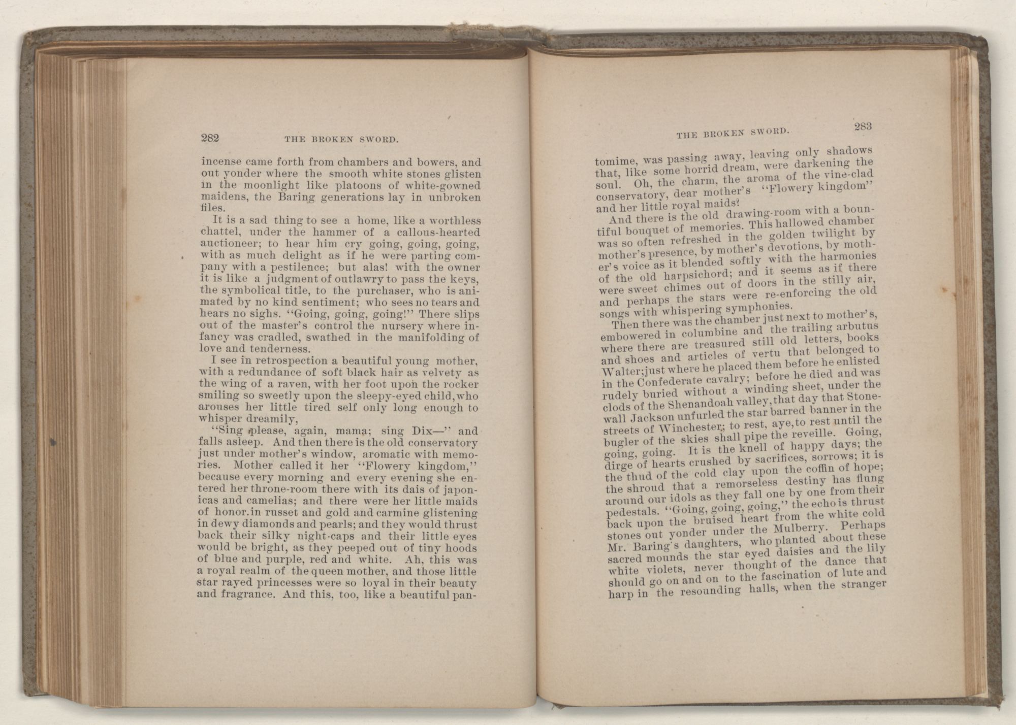 “Bress yo souls, fokeses,” said Uncle Ned one day, as he leaned upon his staff like a sheik of the desert, “I looks back now und den, und peers lak I kin see ole missis way back yander in de war times, when de kannon was a plowin’ froo de trees ober at Manassy, same as a sho nuff harrykin, und killin’ a million of our federick soldiers at wun time. I seed her und Miss Alice cum outen de grate house, a fairly toting