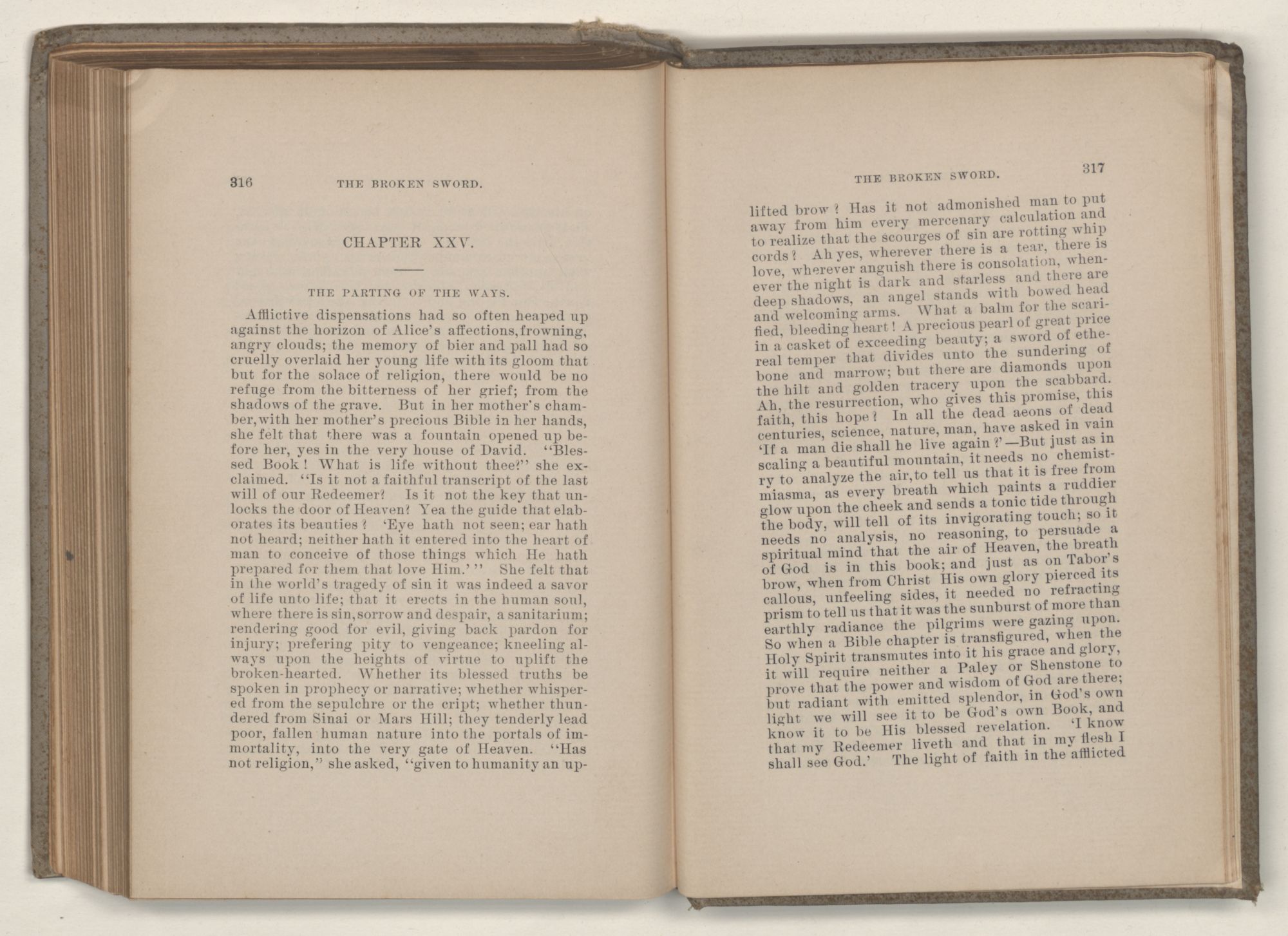 Afflictive dispensations had so often heaped up against the horizon of Alice's affections, frowning, angry clouds; the memory of bier and pall had so cruelly overlaid her young life with its gloom that but for the solace of religion, there would be no refuge from the bitterness of her grief; from the shadows of the grave. But in her mother's chamber, with her mother's precious Bible in her hands, she felt that there was a fountain opened up before her, yes in the very house of David. “Blessed Book! What is life without thee?” she exclaimed. “Is it not a faithful transcript of the last will of our Redeemer? Is it not the key that unlocks the door of Heaven? Yea the guide that elaborates its beauties? ‘Eye hath not seen; ear hath not heard; neither hath it entered into the heart of man to conceive of those things which He hath prepared for them that love Him.’ ” She felt that in the world's tragedy of sin it was indeed a savor of life unto life; that it erects in the human soul, where there is sin, sorrow and despair, a sanitarium; rendering good for evil, giving back pardon for injury; prefering pity to vengeance; kneeling always upon the heights of virtue to uplift the broken-hearted. Whether its blessed truths be spoken in prophecy or narrative; whether whispered from the sepulchre or the cript; whether thundered from Sinai or Mars Hill; they tenderly lead poor, fallen human nature into the portals of immortality, into the very gate of Heaven. “Has not religion,” she asked, “given to humanity an uplifted