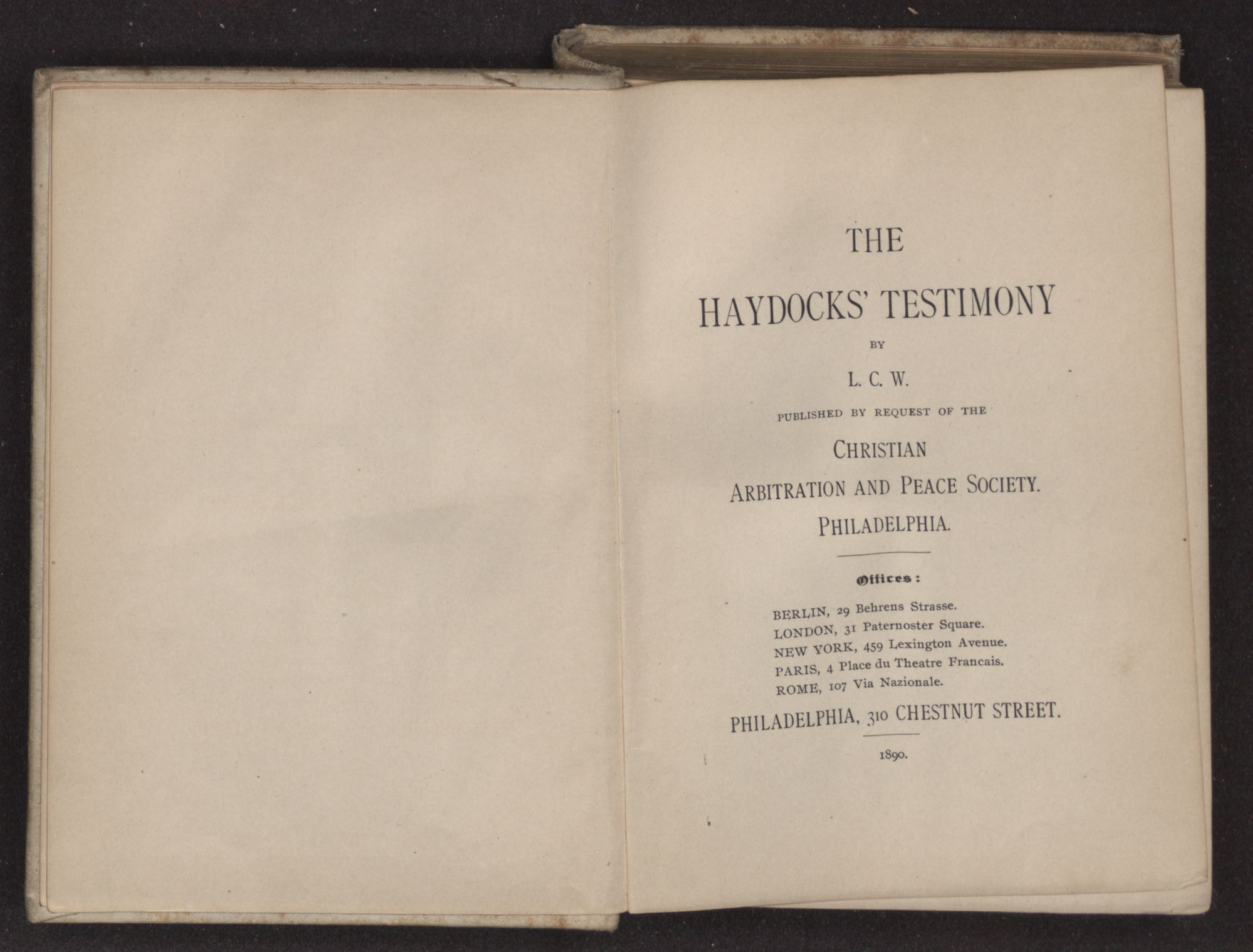 THE HAYDOCKS’ TESTIMONYBYL. C. W. PUBLISHED BY REQUEST OF THE CHRISTIAN ARBITRATION AND PEACE SOCIETY. PHILADELPHIA. Offices: BERLIN, 29 Behrens Strasse. LONDON, 31 Paternoster Square. NEW YORK, 459 Lexingtion Avenue. PARIS, 4 Place du Theatre Francais. ROME, 107 Via Naxionale.PHILADELPHIA, 310 CHESTNUT STREET.1890