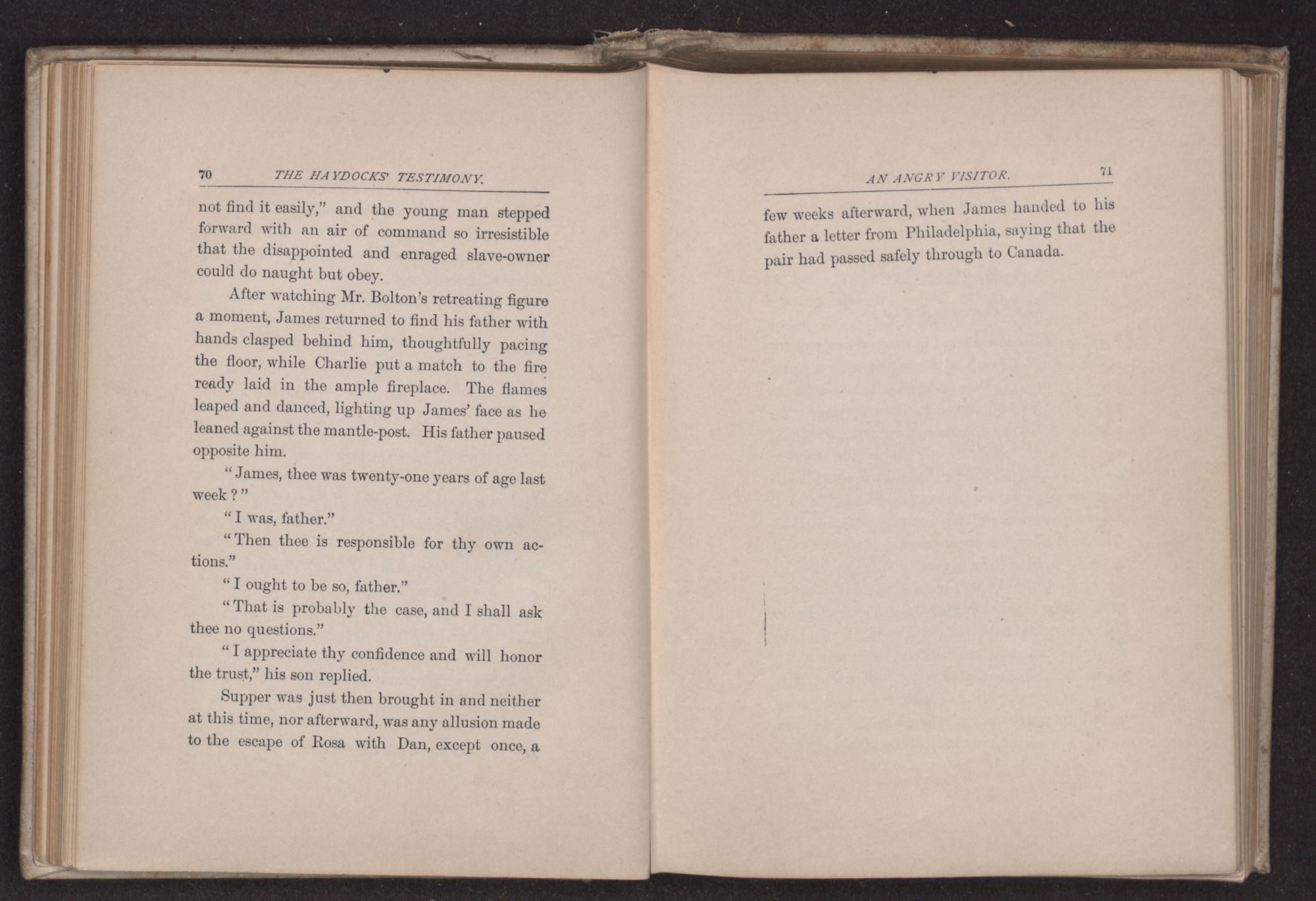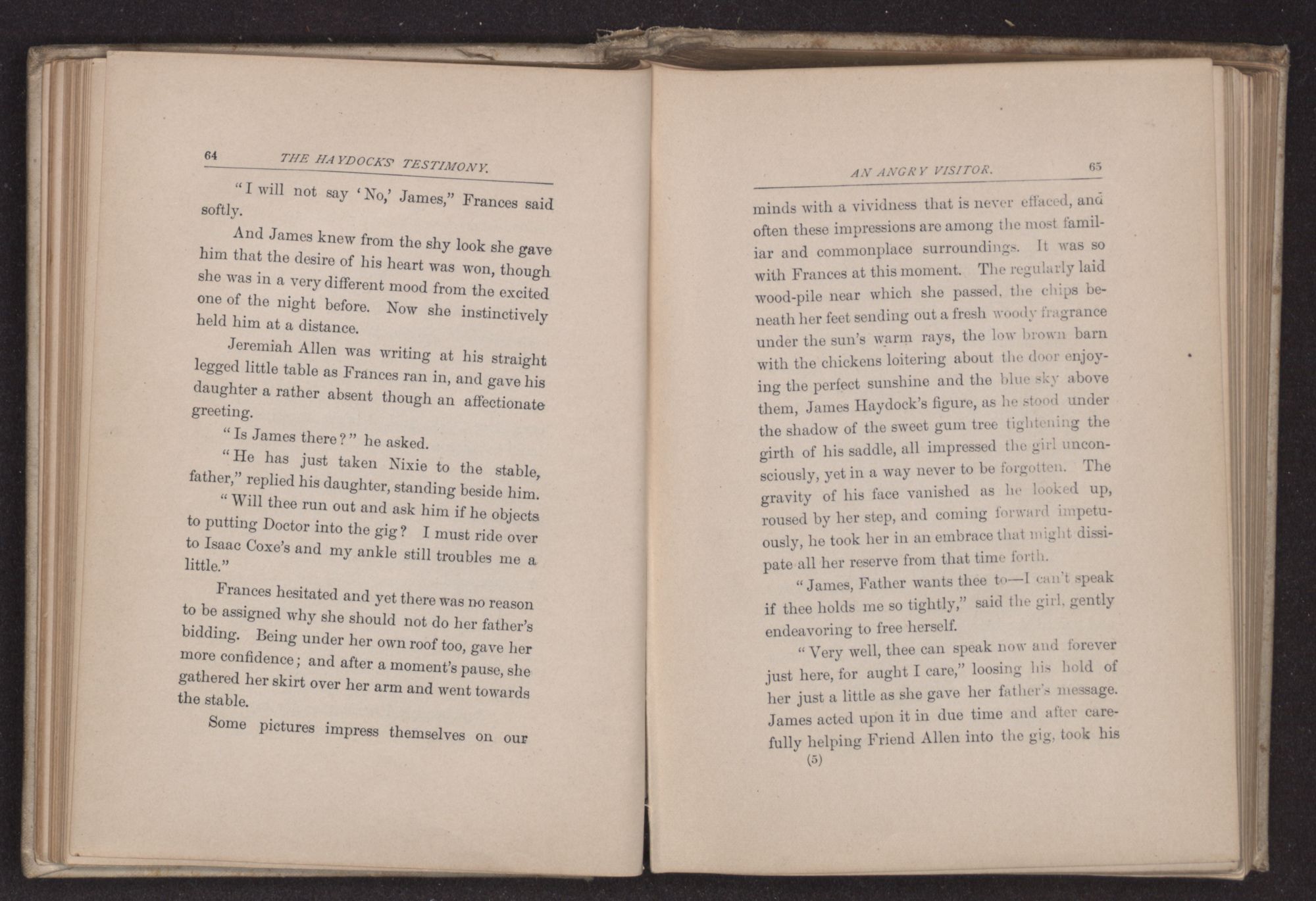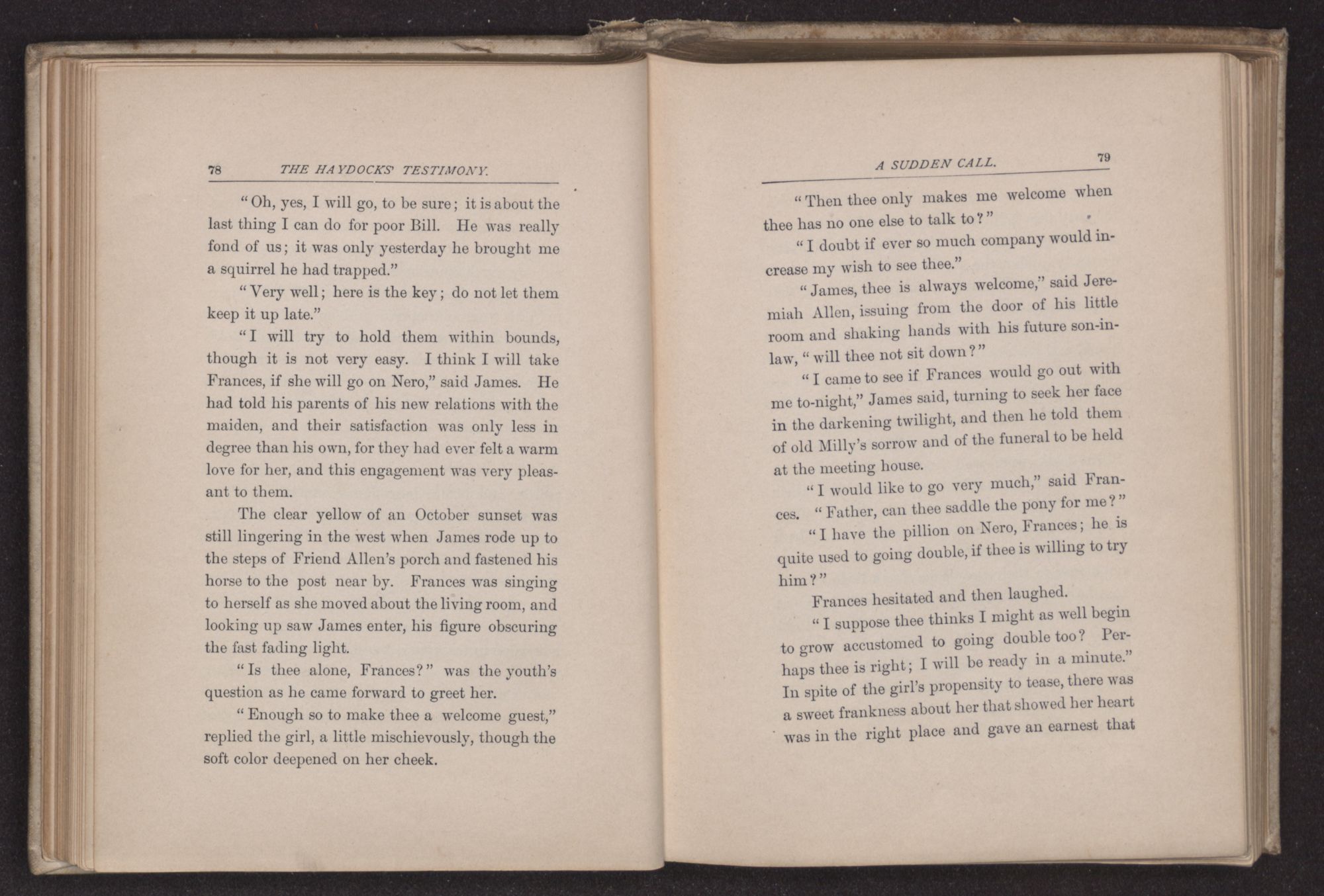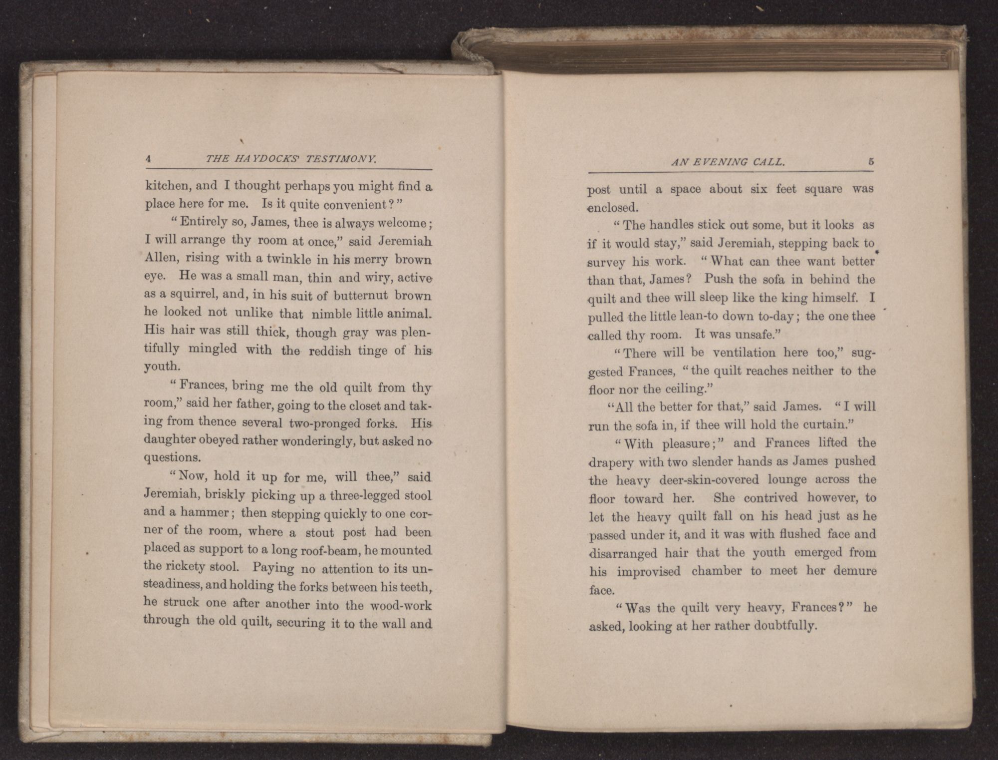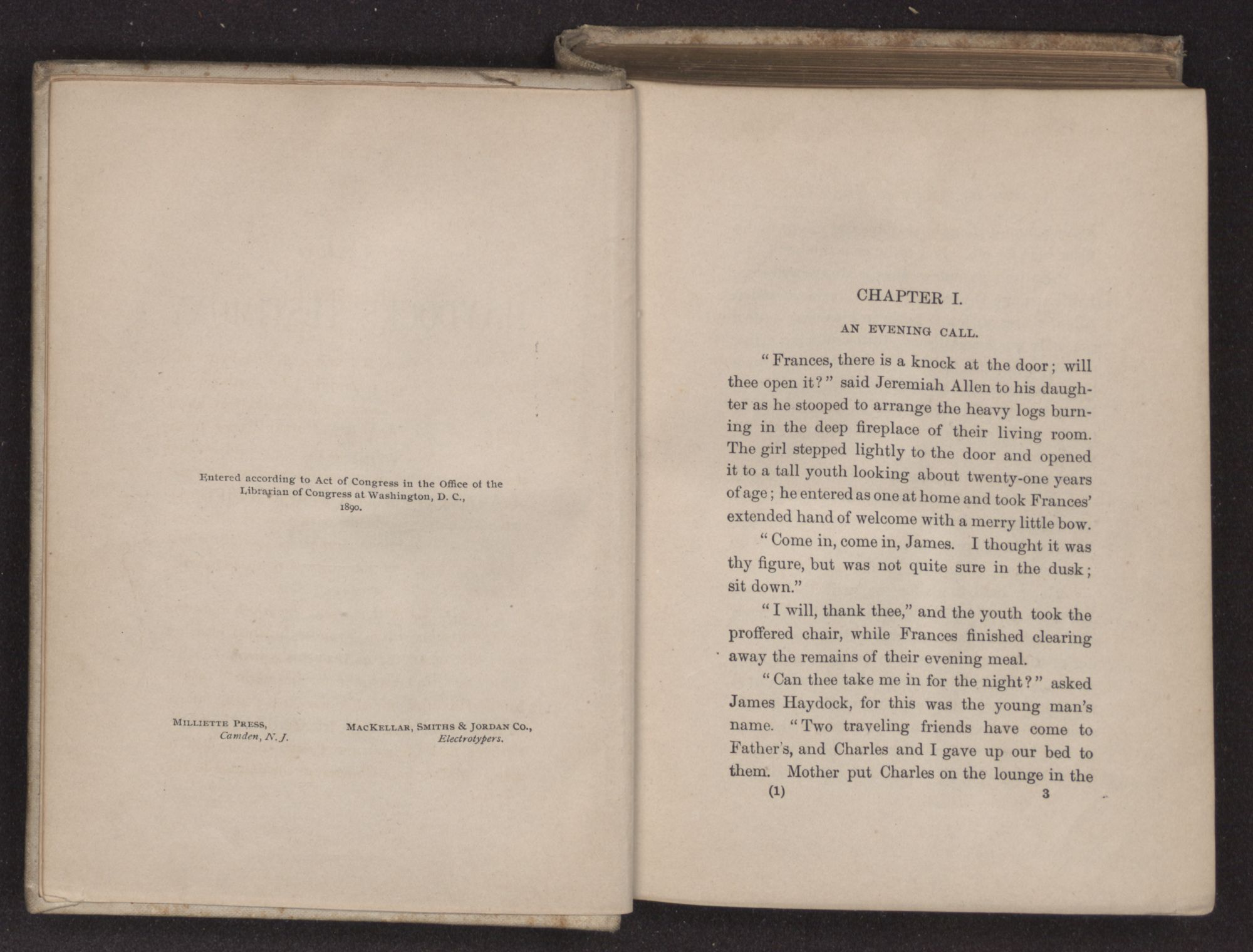 “Can thee take me in for the night?” asked James Haydock, for this was the young man's name. “Two traveling friends have come to Father's and Charles and I gave up our bed to them. Mother put Charles on the lounge in the
